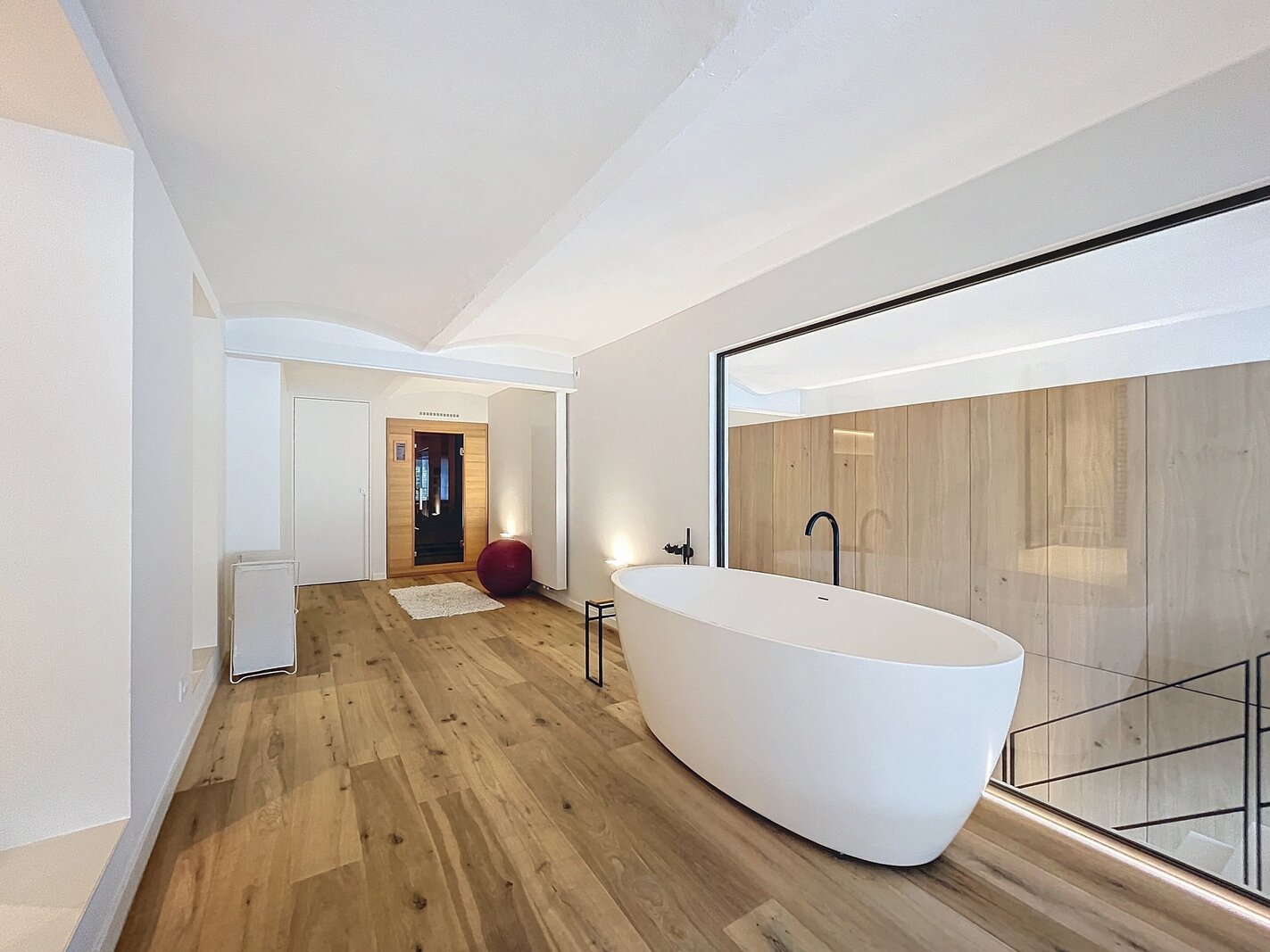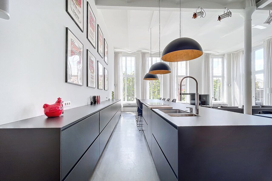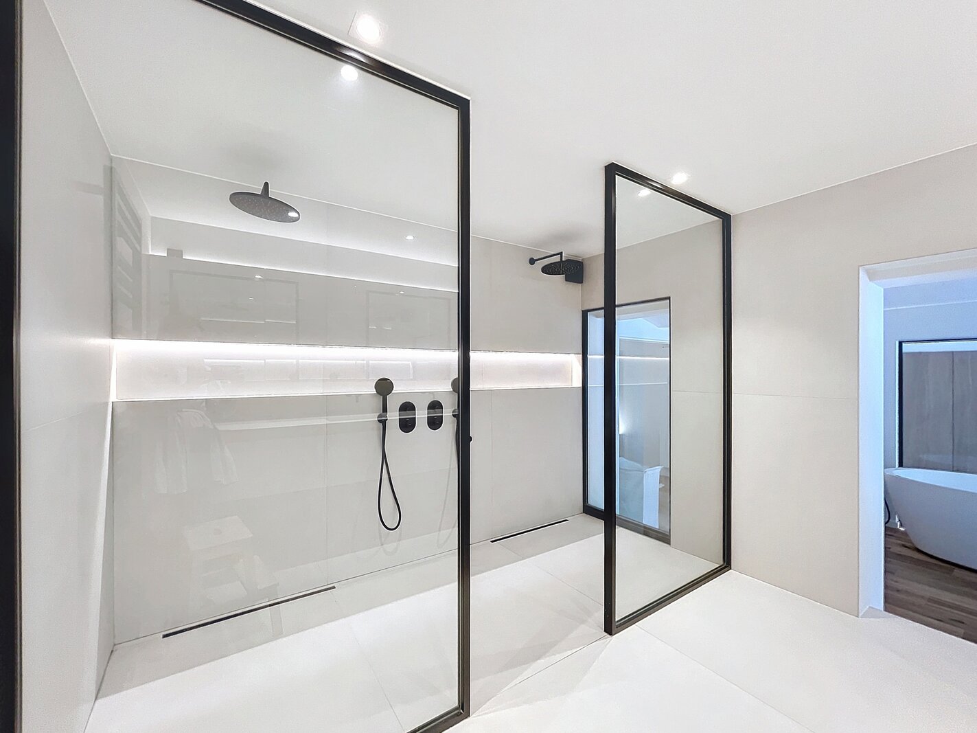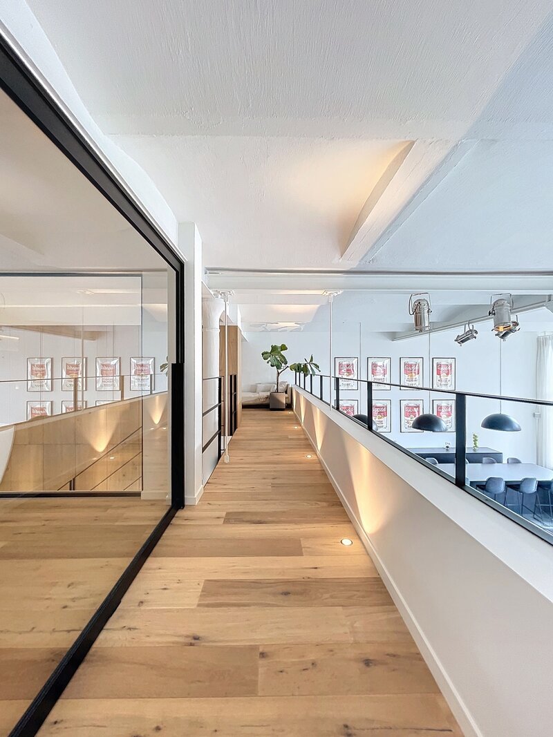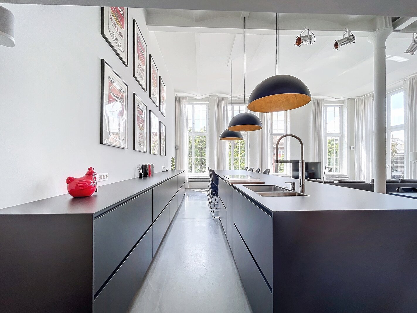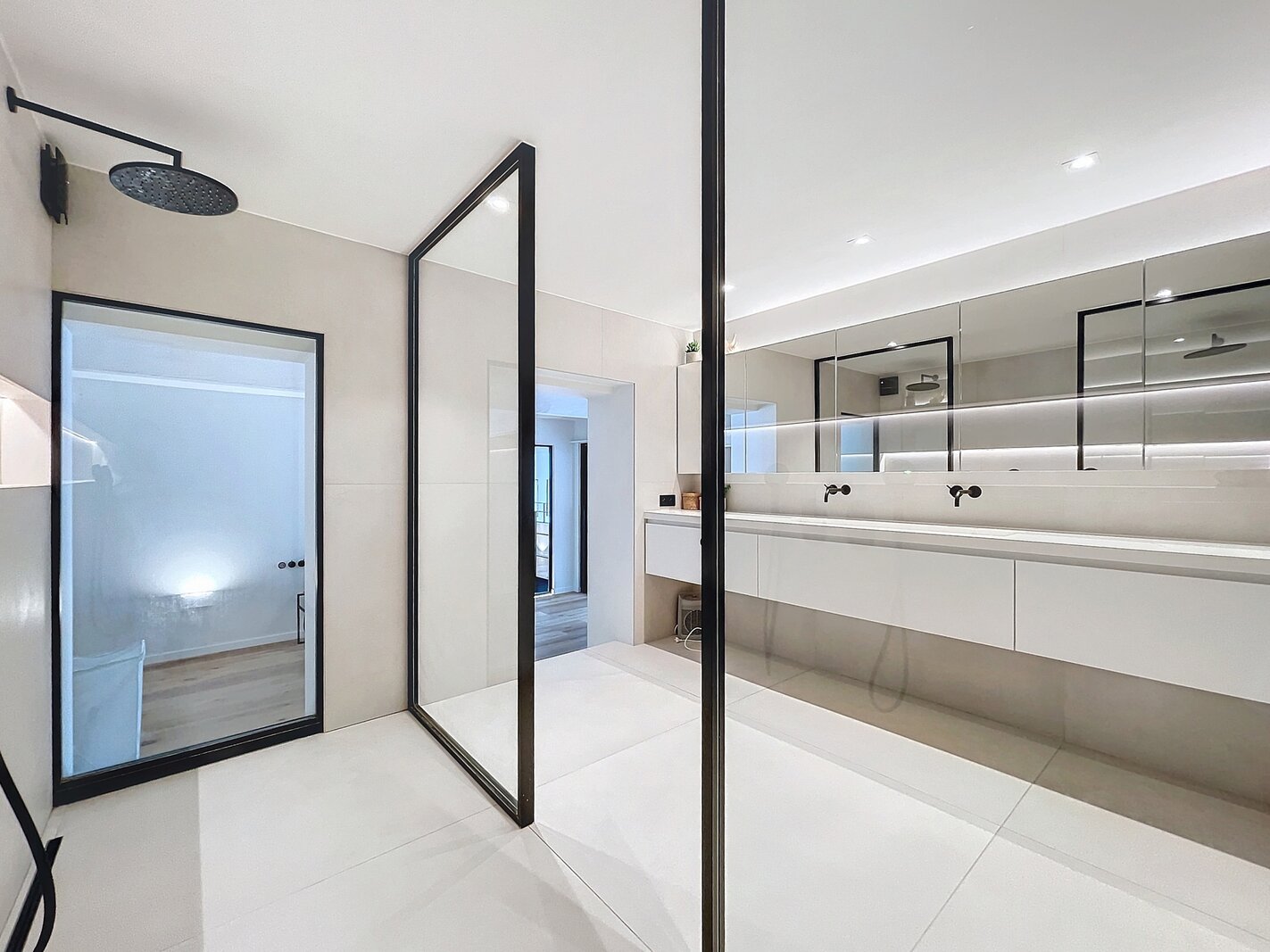 Dès l'entrée, on est immédiatement séduit par l'impressionnant hall d'entrée qui mène au vestiaire et aux toilettes pour invités, à un spacieux débarras et à un bureau équipé d'armoires encastrées. Le tout est suivi d'un espace ouvert bénéficiant d'une lumière naturelle abondante dans lequel se trouvent l'espace de vie et la cuisine ouverte. La cuisine dispose de toutes les commodités et de tous les articles ménagers, depuis le réfrigérateur américain, le four, le four à vapeur, le four à micro-ondes jusqu'à toutes sortes d'ustensiles de cuisine. L'îlot de cuisine peut accueillir 8 personnes. À côté de la cuisine et du hall d'entrée se trouve une buanderie/rangement pratique et spacieux avec des placards intégrés et un lave-vélos pour laver vos bicyclettes. En outre, cette propriété comprend une salle polyvalente qui peut être utilisée comme salle de jardin, bureau supplémentaire, espace de vie supplémentaire ou similaire. Le premier étage comprend 2 chambres à coucher, chacune avec des armoires encastrées, une pièce de rangement/un dressing supplémentaire, une luxueuse salle de bains avec double douche, baignoire, cabine infrarouge et des toilettes séparées. Ce loft bénéficie également d'une terrasse exceptionnellement spacieuse accessible depuis l'espace de vie et/ou la salle de jardin. Enfin, 2 places de parking sont disponibles dans le parking souterrain où se trouve également un local à vélos fermé à clé.