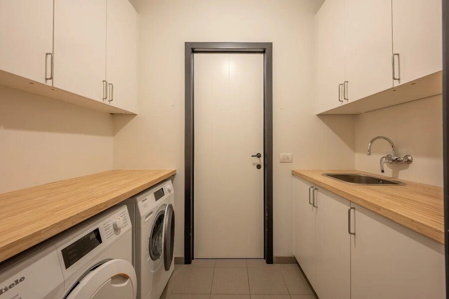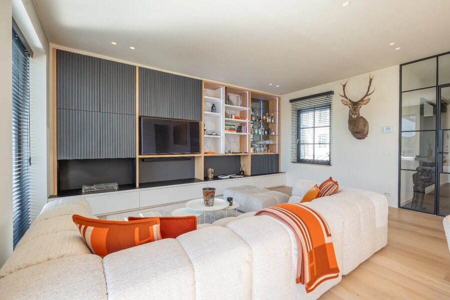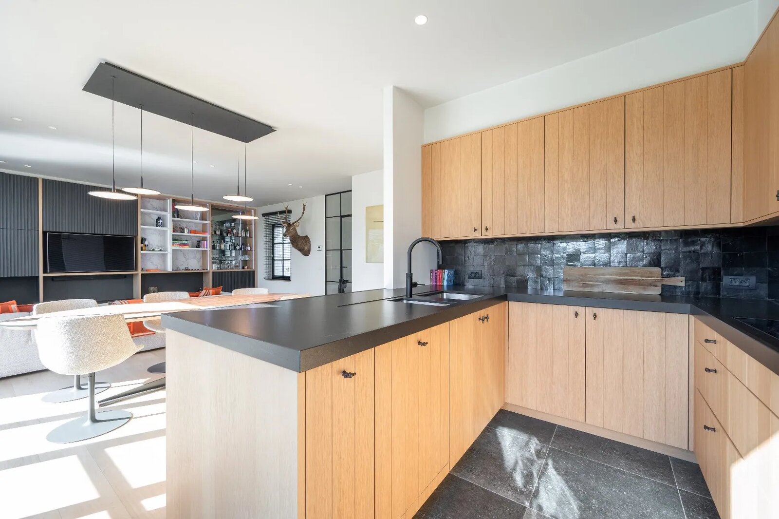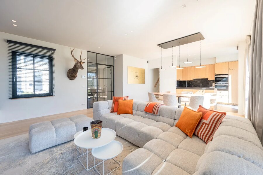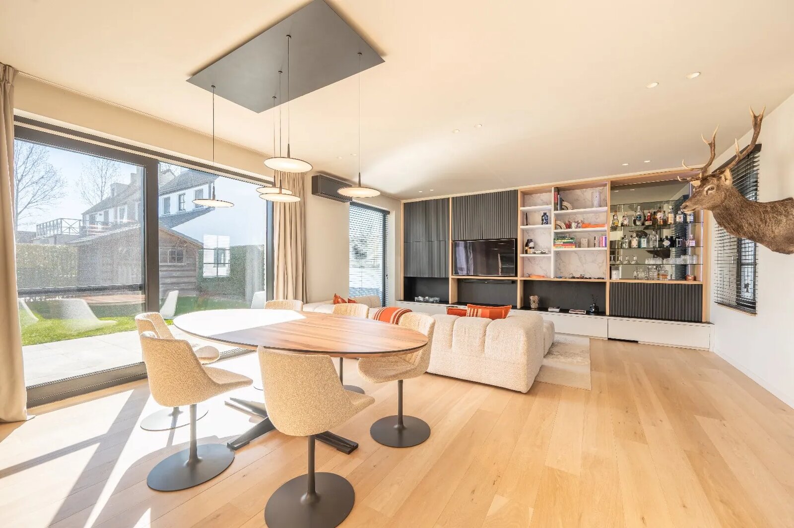 Hall d'entrée avec toilettes invités et vestiaire. Salon spacieux et lumineux avec salon et placards encastrés, cheminée au bioéthanol (possibilité de cheminée au gaz), salle à manger, tous deux donnant sur la terrasse ensoleillée et le jardin avec vue dégagée sur le moulin. Cuisine ouverte équipée de tous les appareils. Buanderie avec espace de rangement. Garage spacieux intégré.