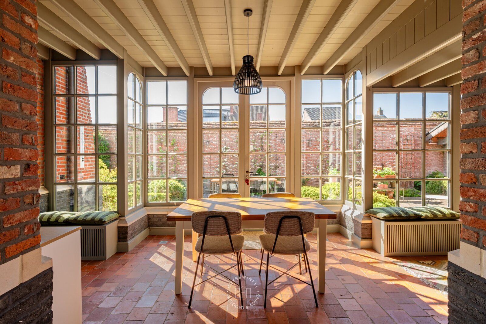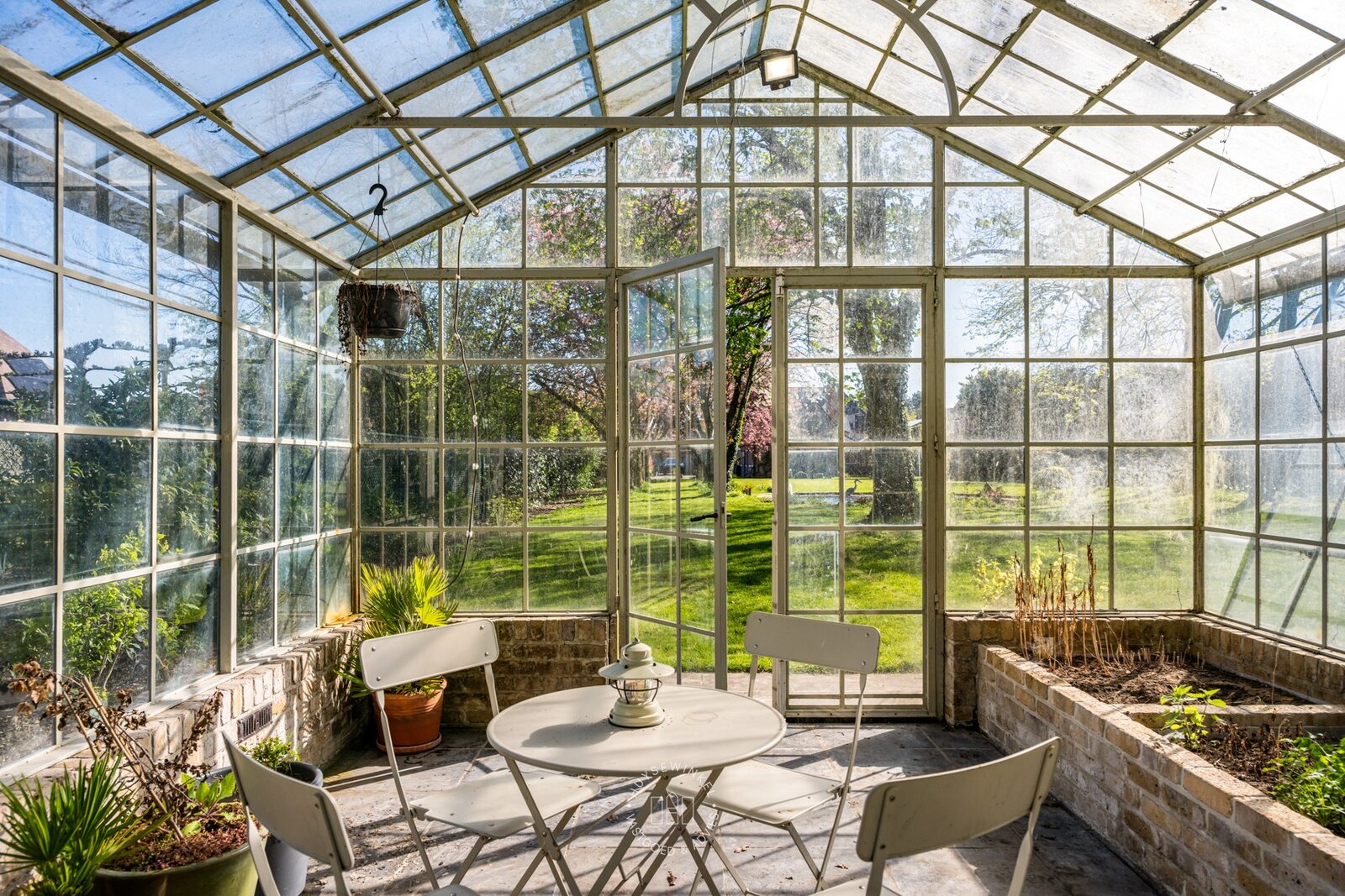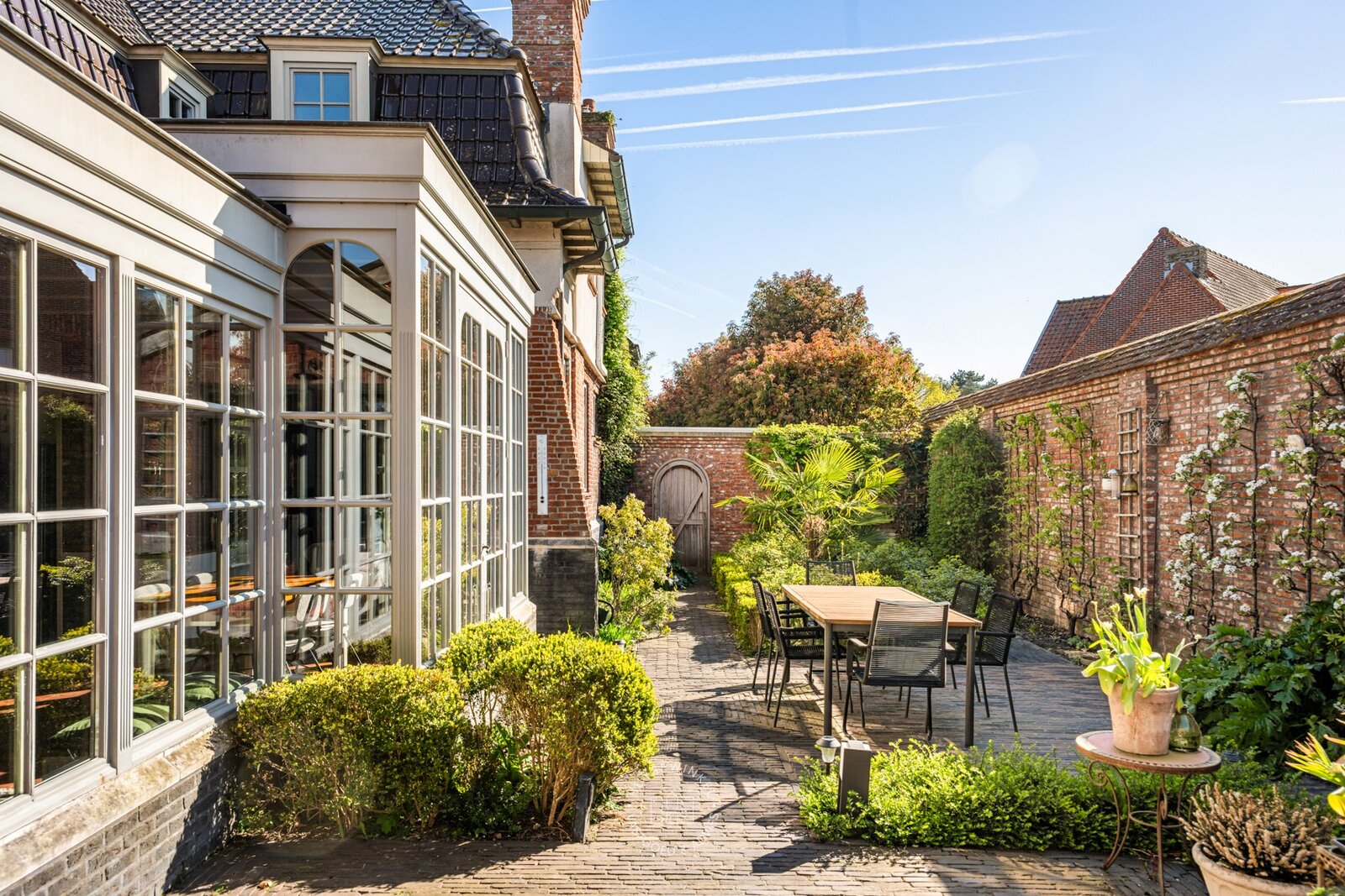 De prachtig aangelegde tuin in landschapsstijl vormt een groene oase van rust en privacy. Een charmante serre, bereikbaar via een netjes aangelegd pad omzoomd door bomen, zal elke tuinliefhebber weten te bekoren. De verschillende hoekjes en doorkijkjes nodigen uit om de tuin telkens opnieuw te ontdekken.