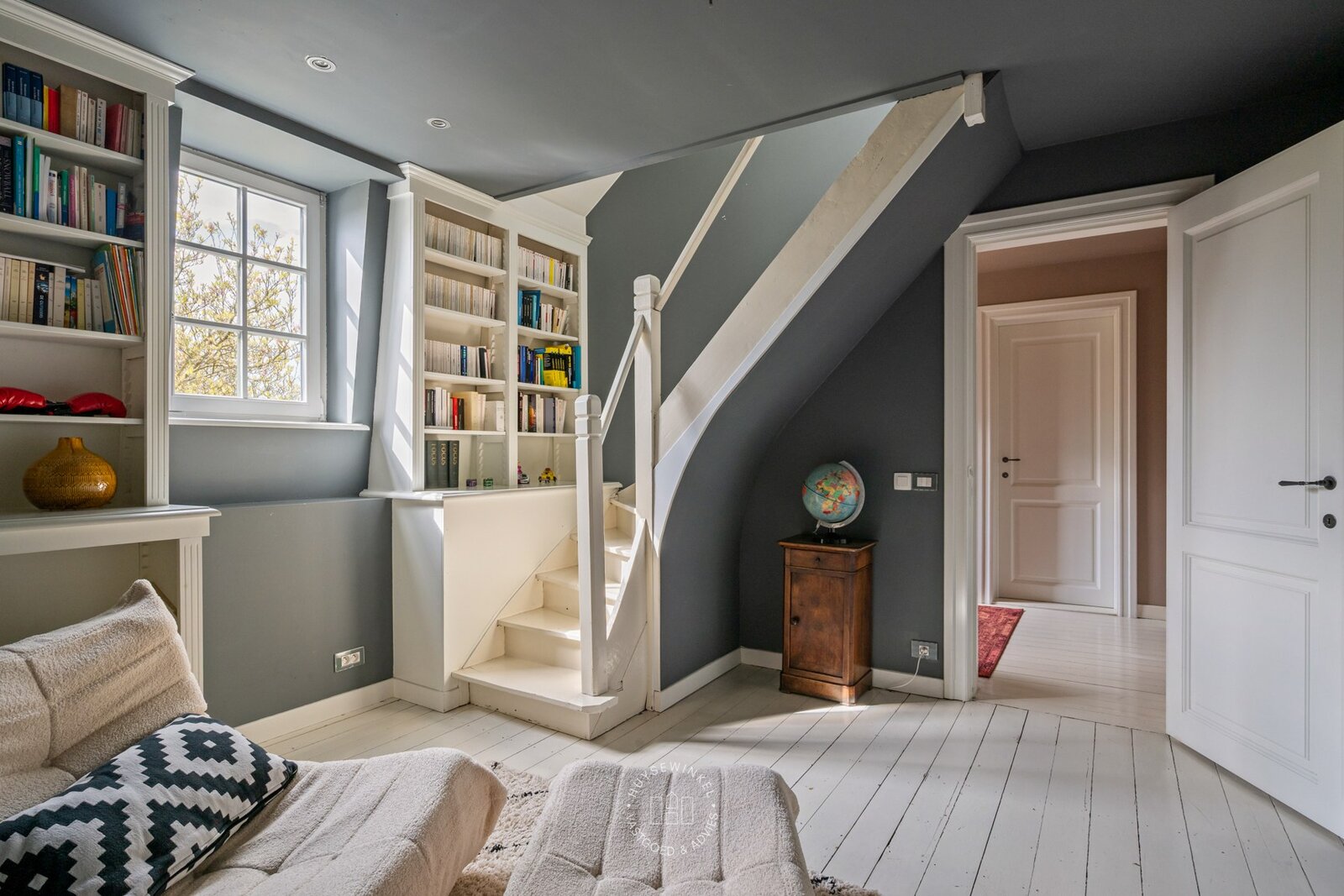 De woning beschikt momenteel over vijf slaapkamers en drie badkamers alsook meerdere polyvalente doorloopkamers, er is tevens een lift aanwezig.