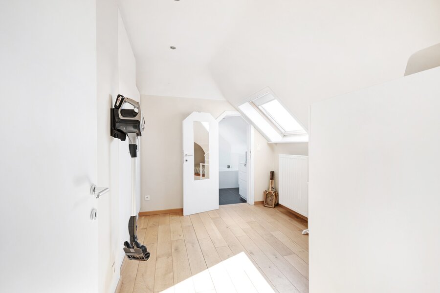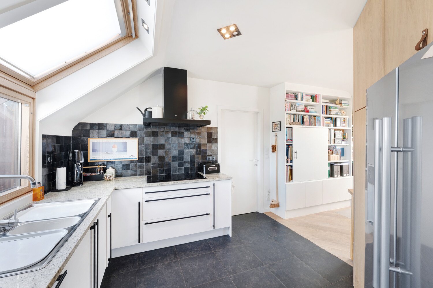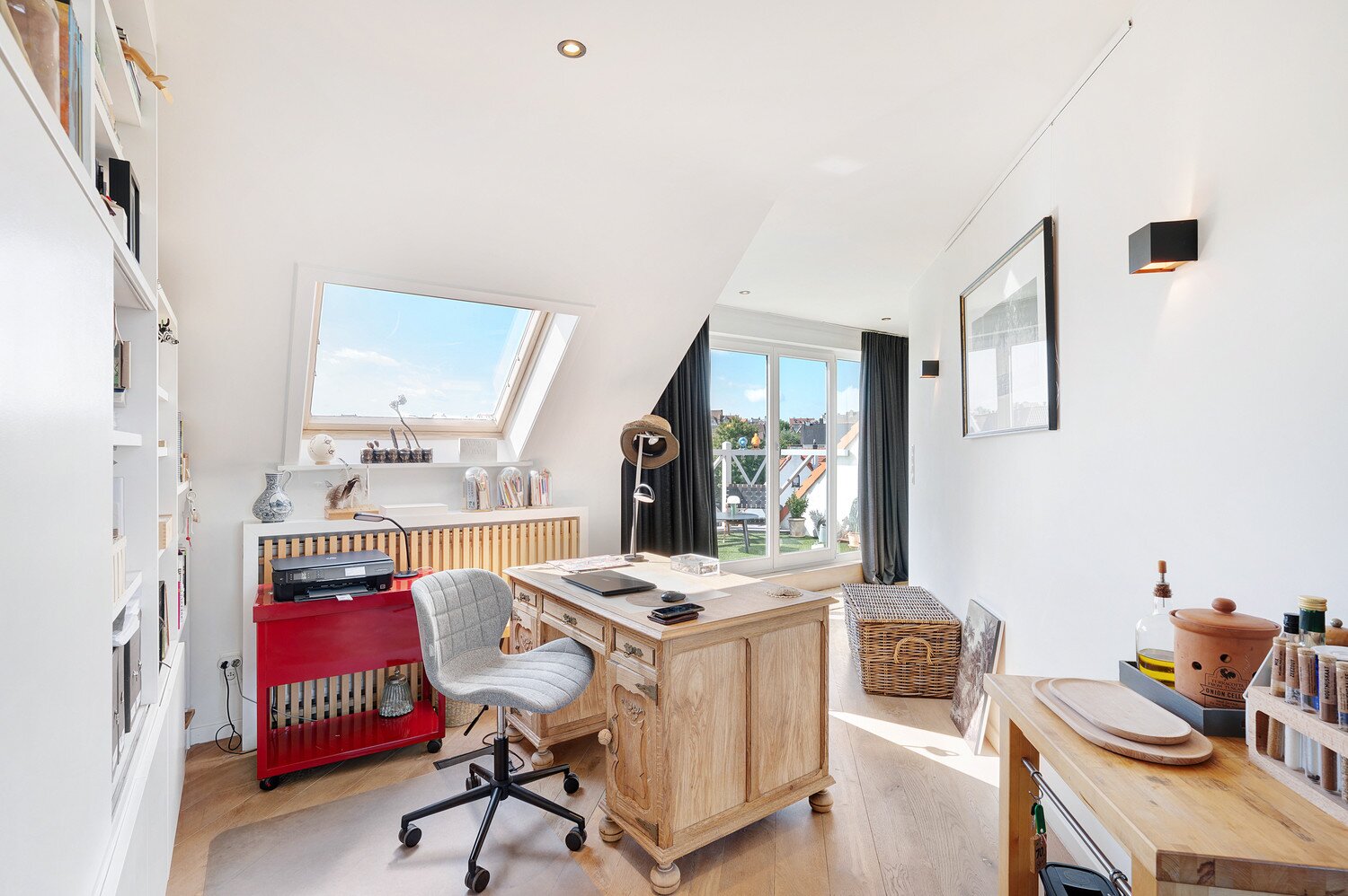 Vanuit de leefruimte is er een directe aansluiting op het zongerichte terras, waar het open zicht volledig tot zijn recht komt. Bovendien is er een praktische bureauhoek voorzien. Deze is aangenaam geïntegreerd in het geheel en geniet van veel daglicht.