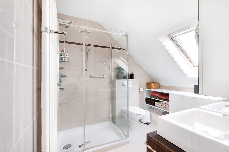 Verder zijn er een badkamer met ligbad en wastafel, een douchekamer met dubbele lavabo en toilet. Een berging/technische ruimte voor extra opslag en wasvoorzieningen.
