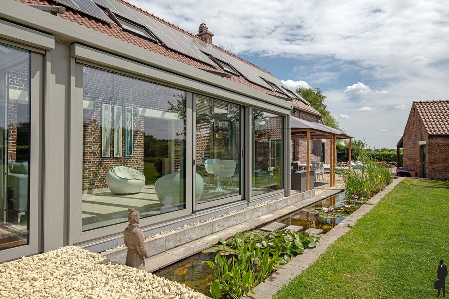 De aangebouwde veranda met natuurstenen vloer biedt een panoramisch zicht op het omliggende groen en vormt de ideale plek om elk seizoen te beleven.