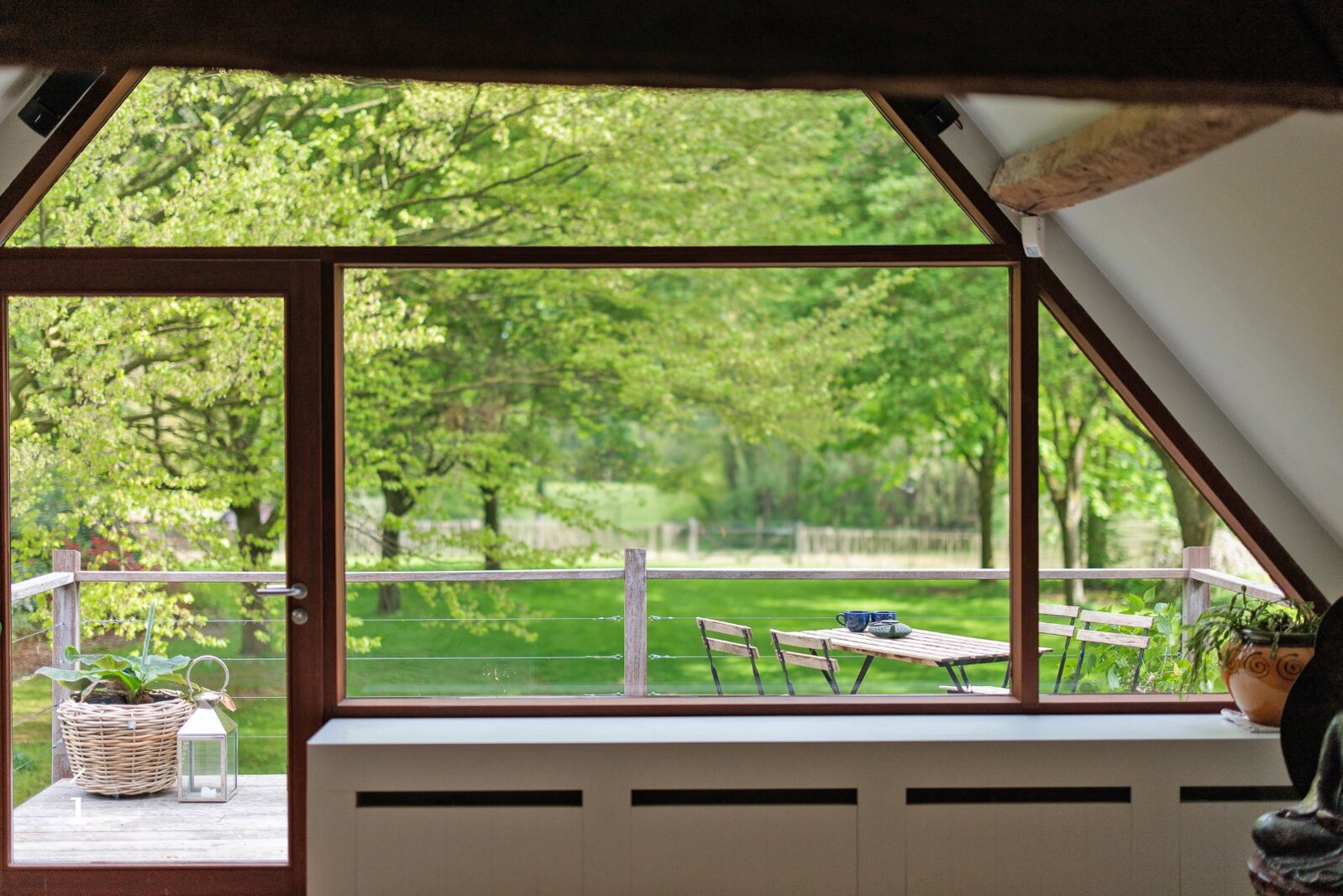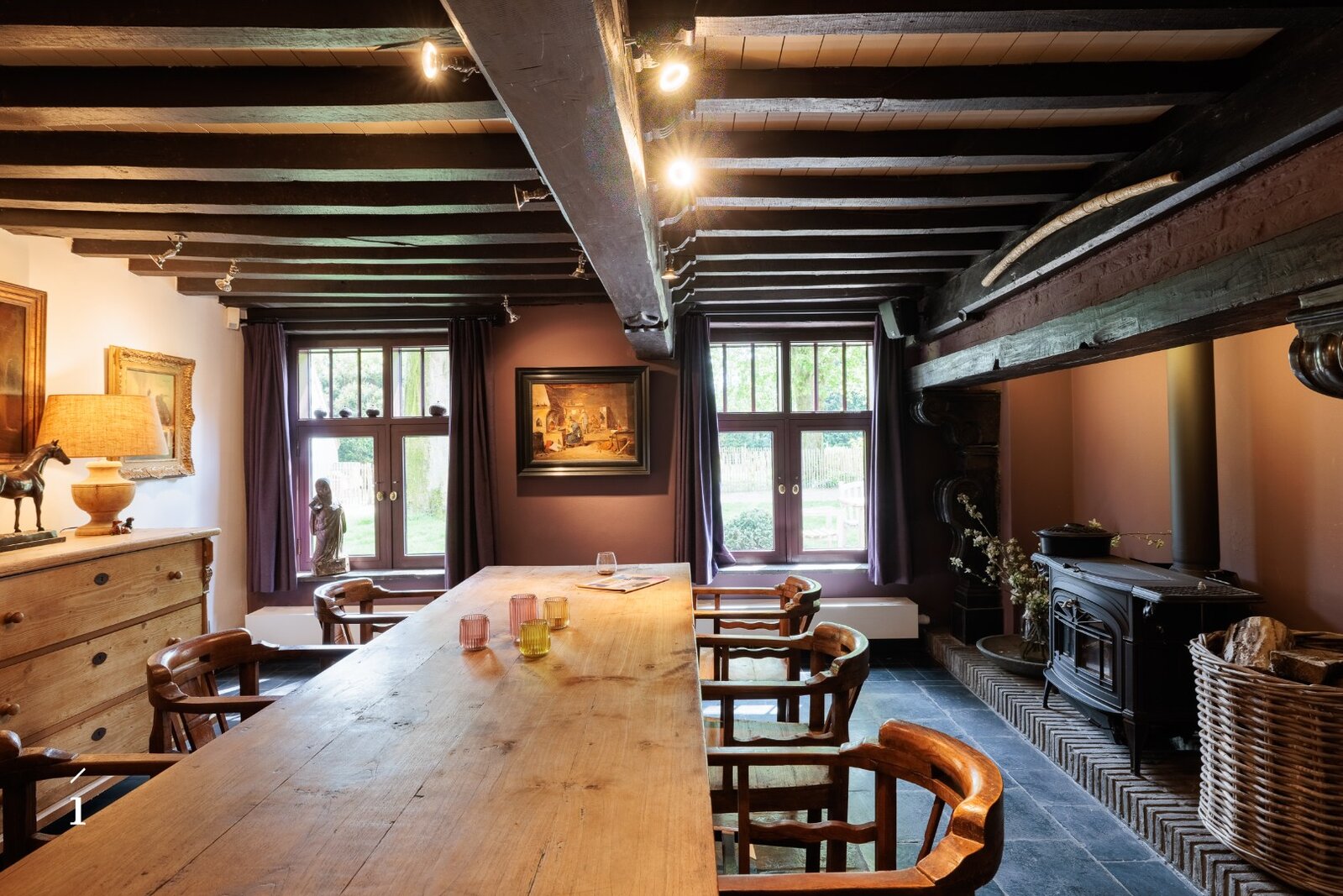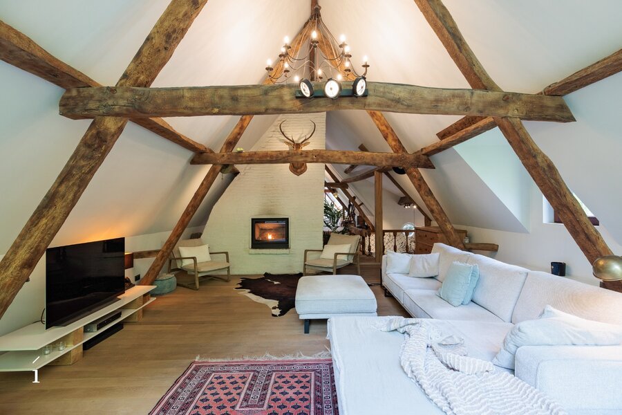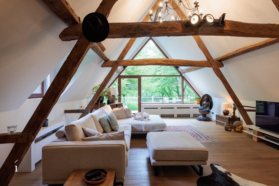 In de living creëren royale volumes, warme materialen en een sterke connectie met het omliggende landschap meteen een bijzondere sfeer. De hoger gelegen leefruimte met zichtbare houten balken, haard en royale raampartijen vormt een absolute blikvanger. De woning voelt warm, uitnodigend en bijzonder aangenaam aan.