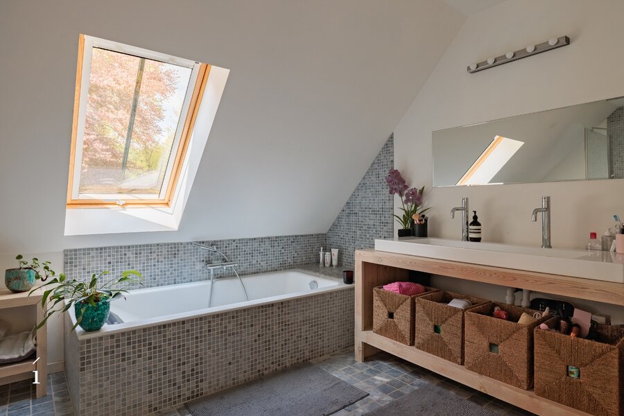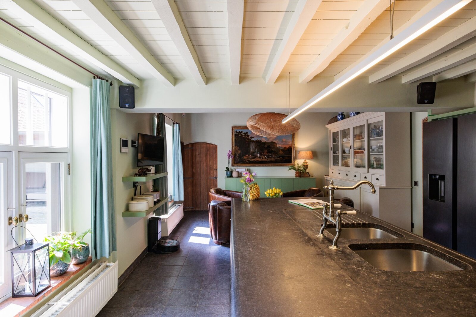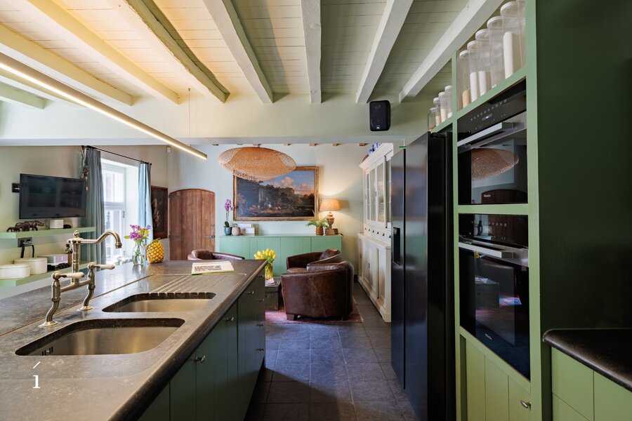 Waar de living zich kenmerkt door openheid en volume, heerst op het gelijkvloers in de keuken, eetplaats en zitruimte een meer geborgen sfeer. Warme materialen en authentieke balken creëren hier een intieme setting, ideaal voor lange tafelmomenten en ongedwongen samenzijn. Aanpalend bevinden zich bovendien een slaapkamer met douchekamer, berging en bijkeuken, die het dagelijkse comfort extra versterken.