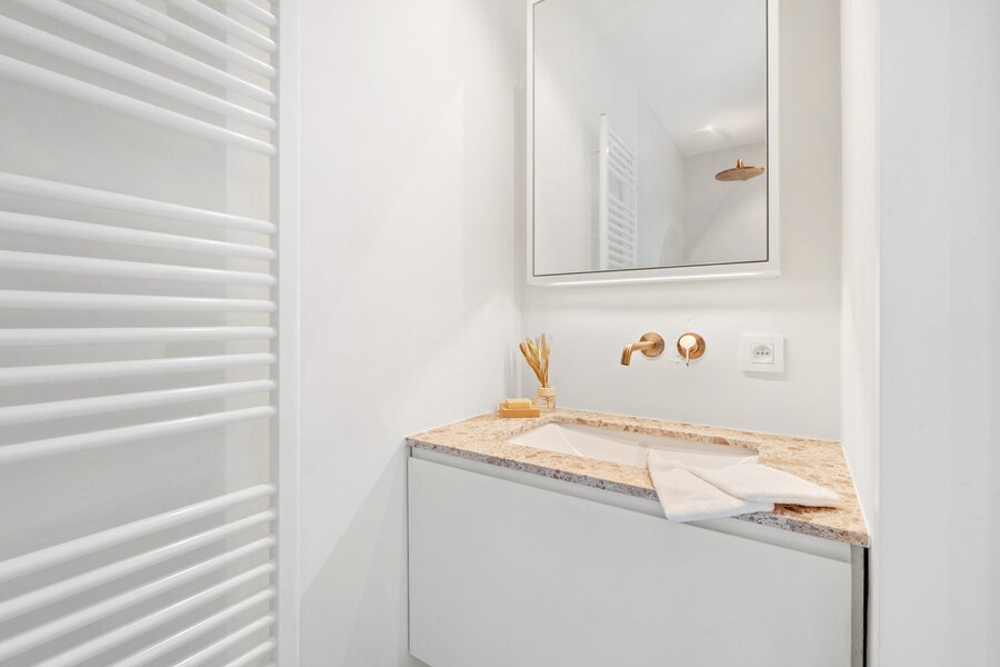 Dit schitterende appartement is onlangs volledig gerenoveerd door binnenhuisarchitecte Heidi Wille. De woon- en eetruimte beschikken over grote ramen en een balkon. De open keuken is voorzien van hoogwaardige Miele-apparatuur. Er zijn 2 ruime slaapkamers met aangrenzend balkon en extra opbergruimte aan beide zijden. Elke slaapkamer is uitgerust met ingebouwde kasten en een eigen badkamer. Verder is er een apart toilet en een berging voor de wasmachine en droger.