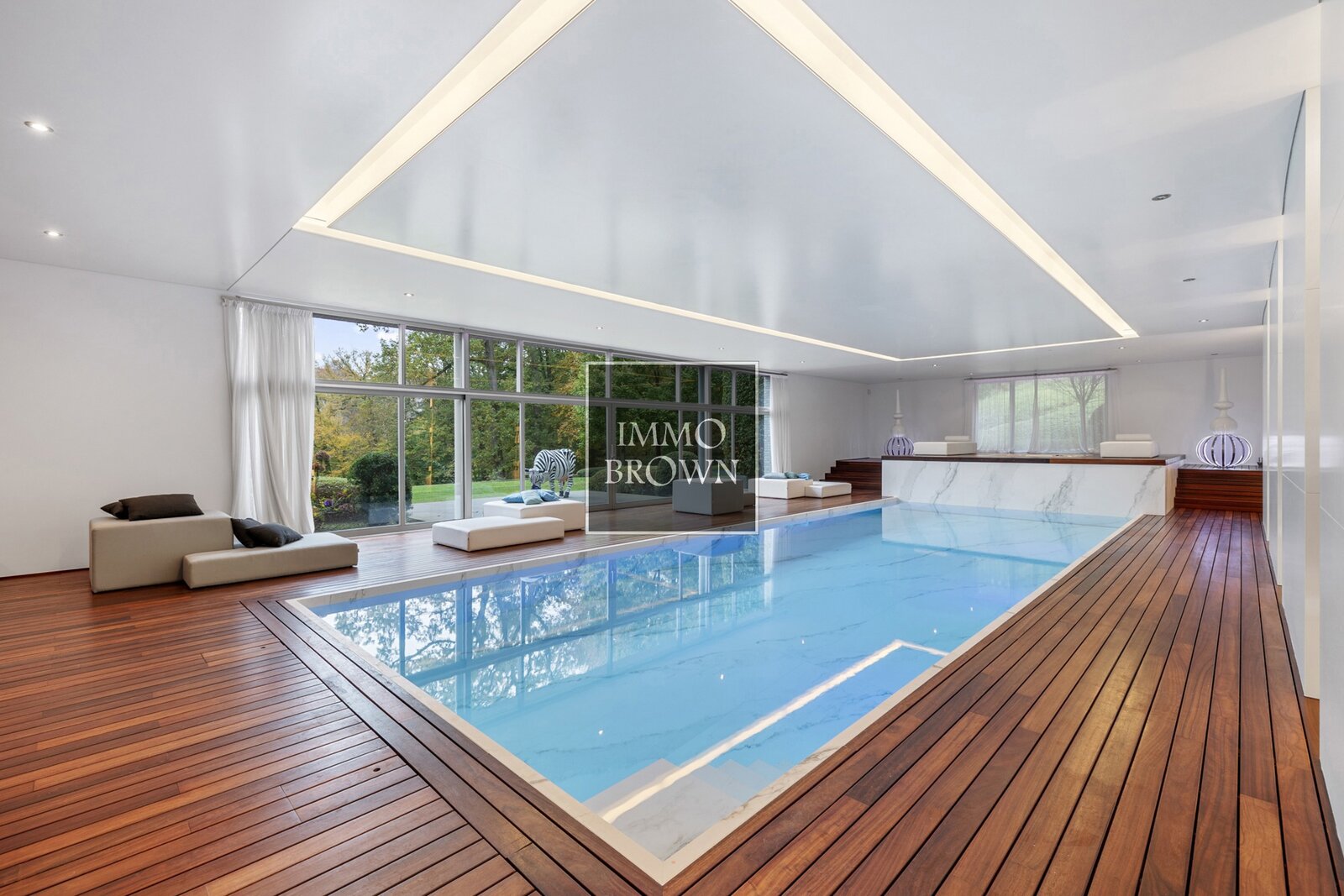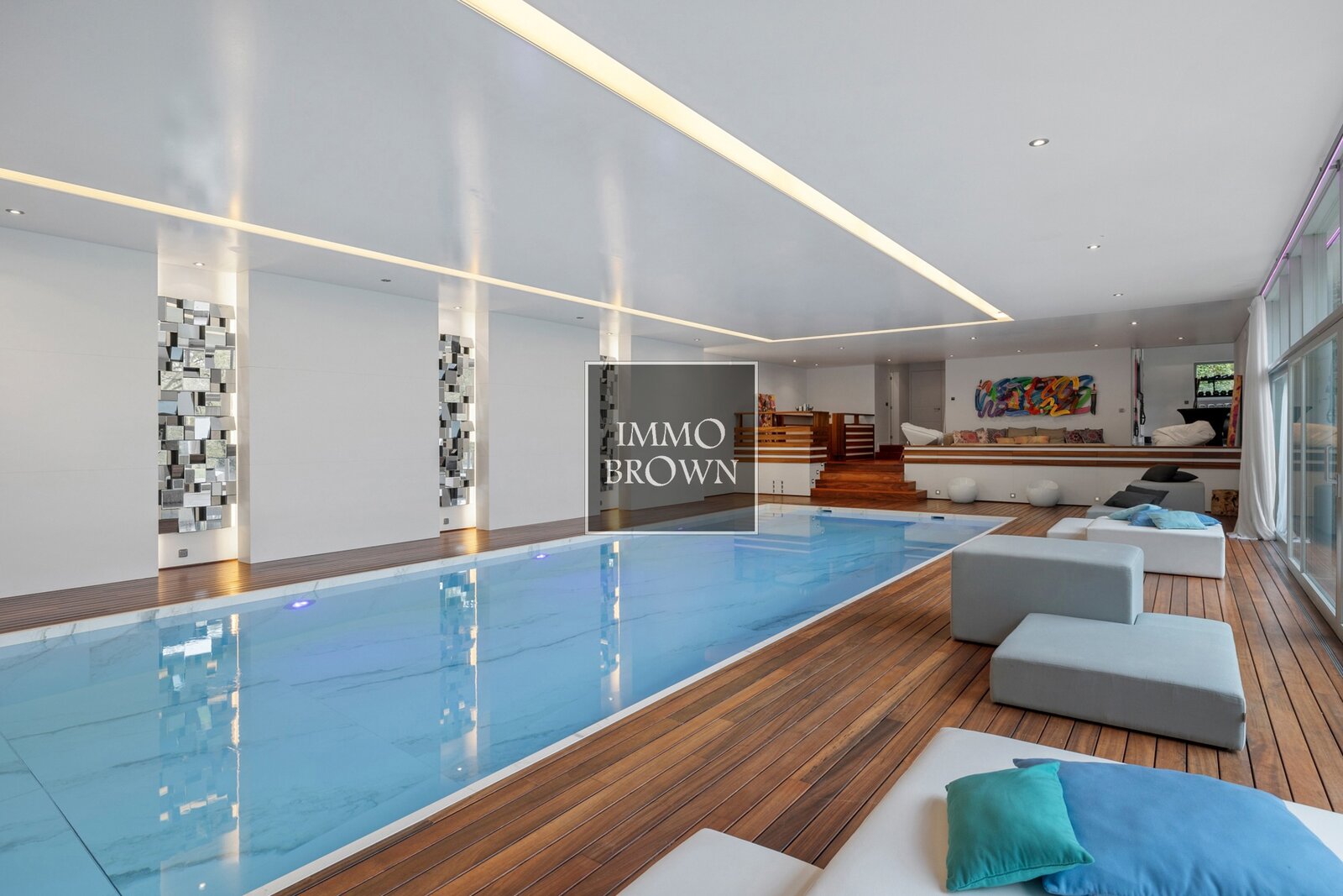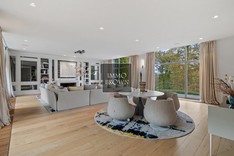 Aux sous-sols se trouvent une agréable family-room, une piscine intérieure chauffée avec un espace bar, un jacuzzi, une salle de sport, des vestiaires avec toilettes, une buanderie, de nombreuses caves et des locaux techniques.