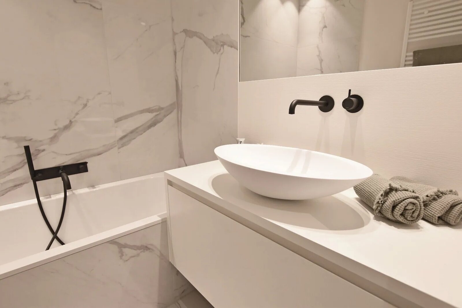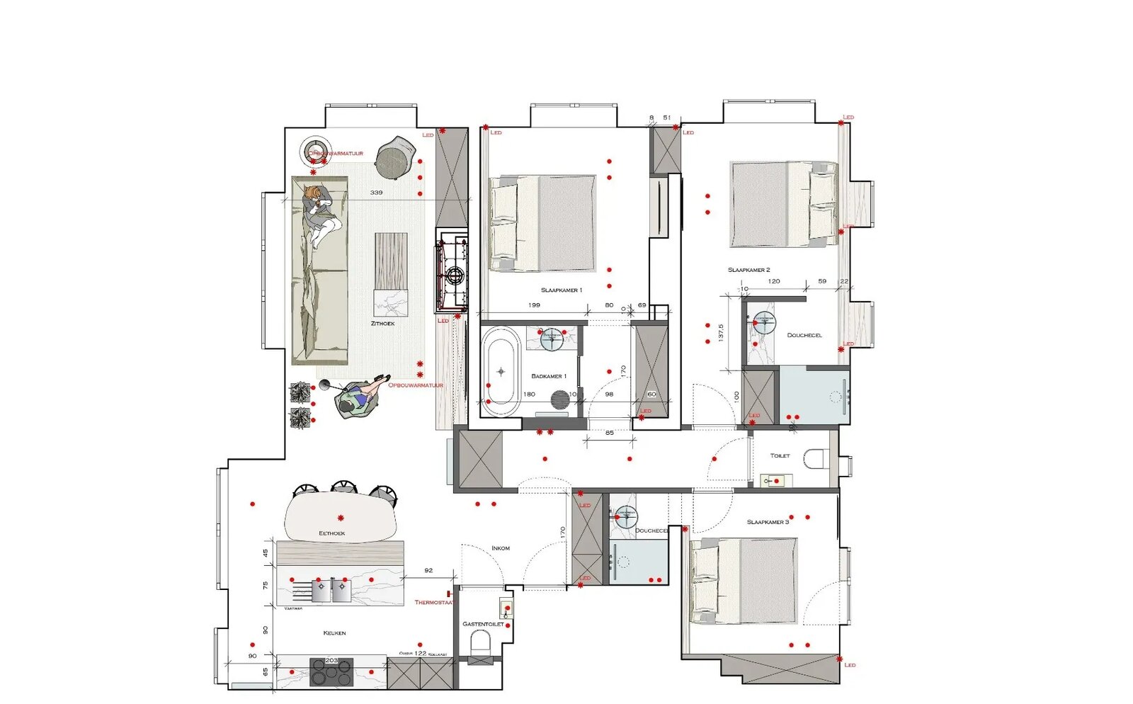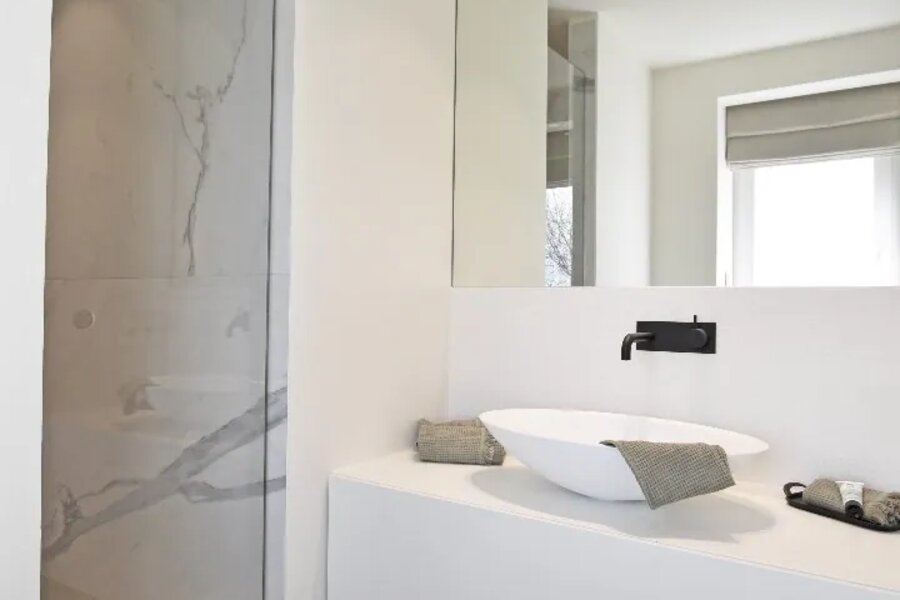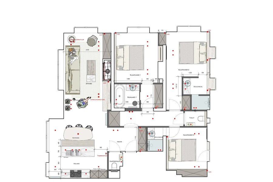 Composition : hall d'entrée avec vestiaire et toilette séparée, séjour lumineux avec cheminée à gaz, cuisine ouverte entièrement équipée avec coin repas attenant. Chambre à coucher principale avec placards intégrés, salle de bains (double lavabo et baignoire), deux vraies chambres, chacune avec leur propre salle de douche, toilette séparée dans le hall de nuit.