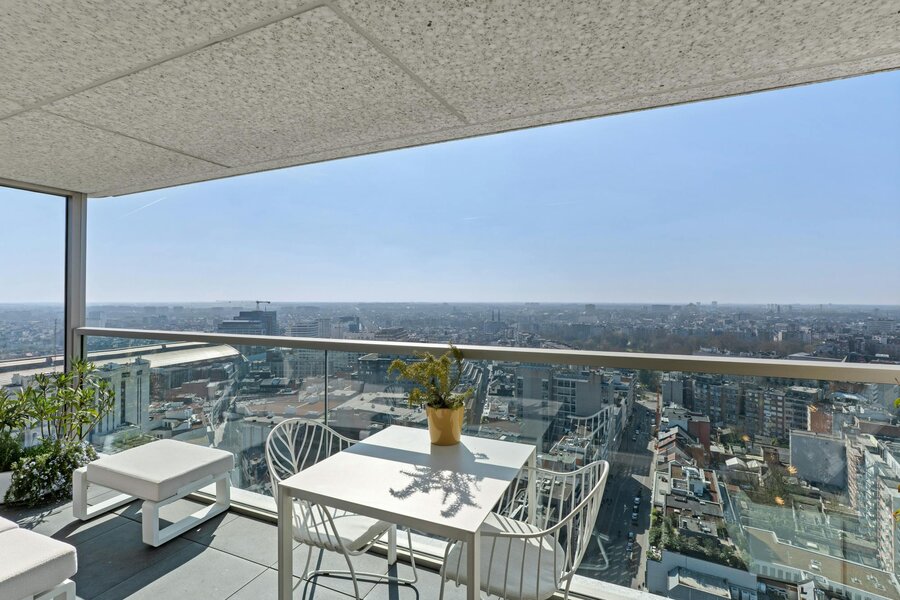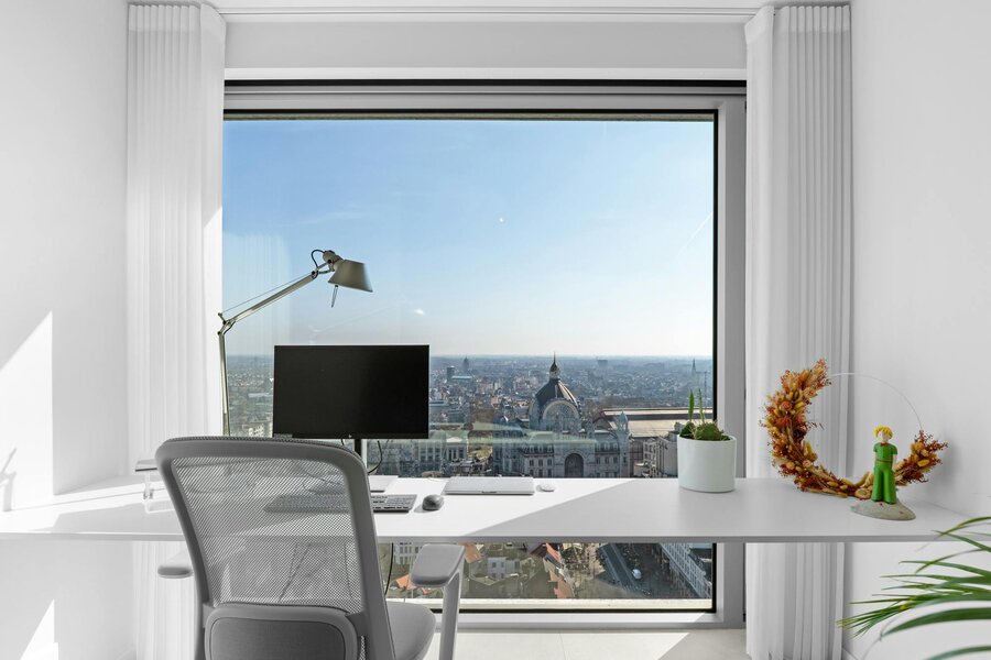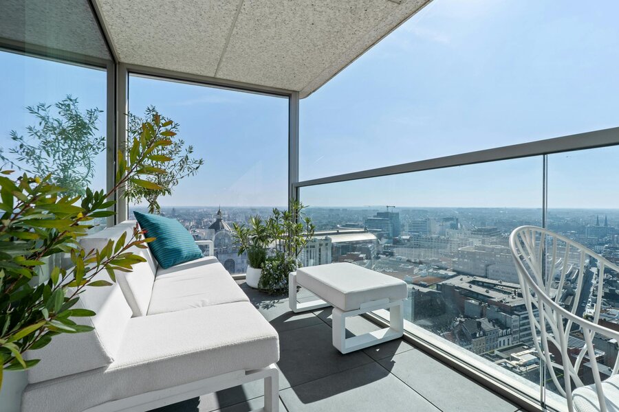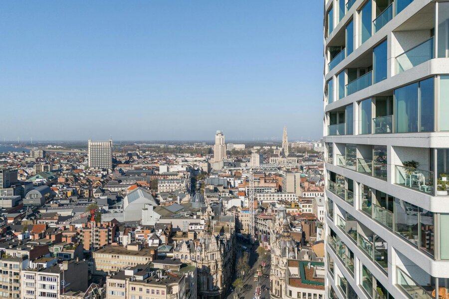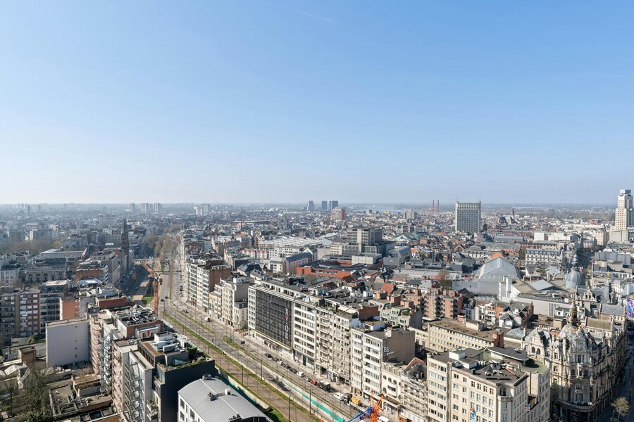 - Terrasse orientée plein sud avec une vue imprenable. Profitez de vues spectaculaires sur la ville depuis votre spacieuse terrasse orientée plein sud. L'endroit idéal pour se détendre, profiter du soleil et admirer les toits d'Anvers.