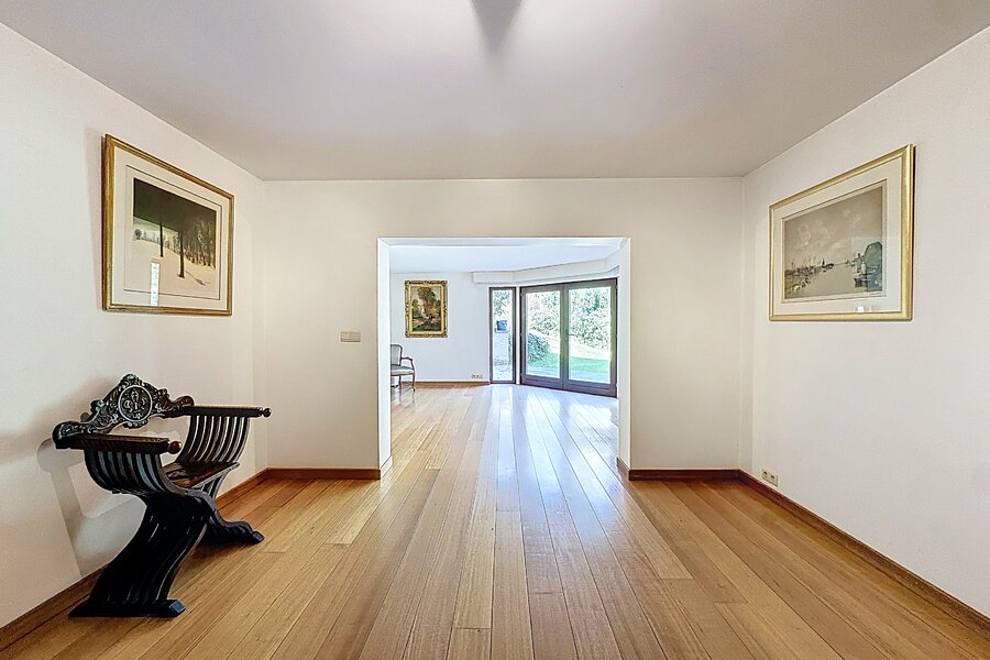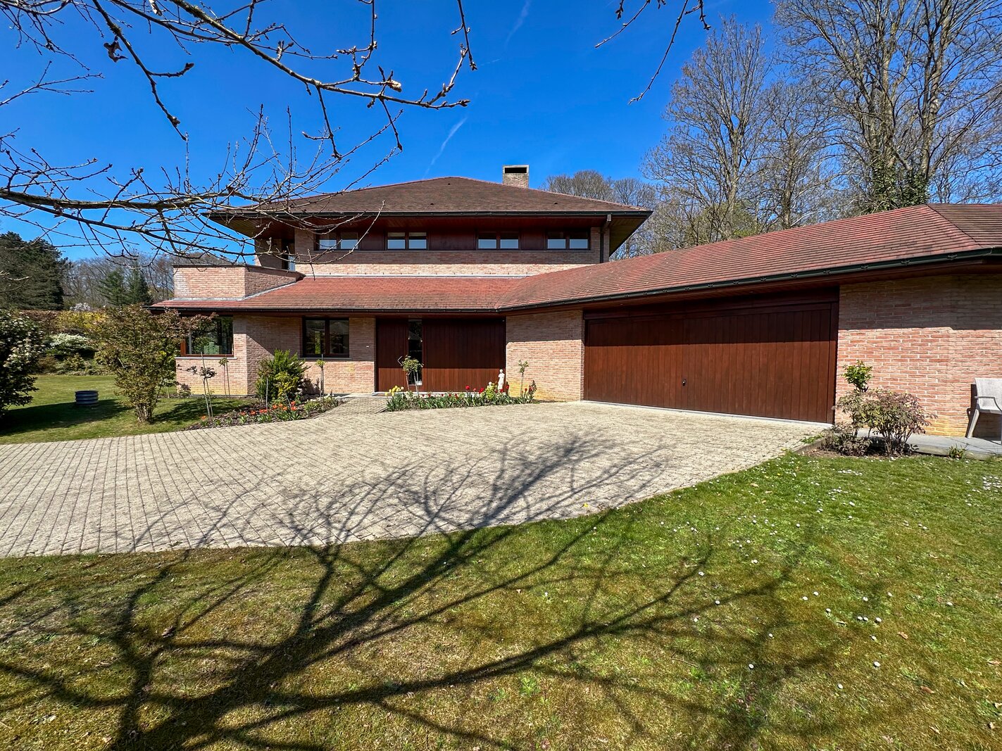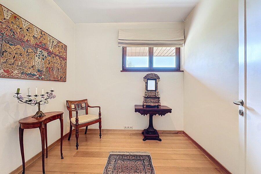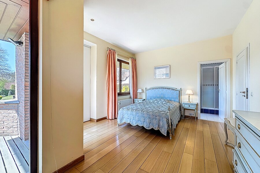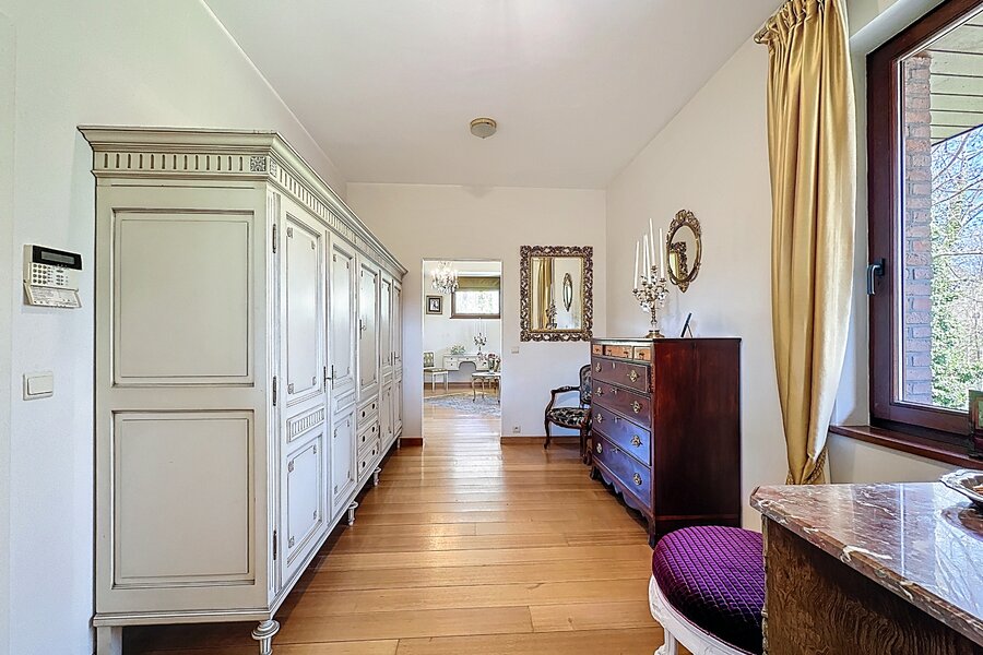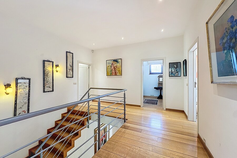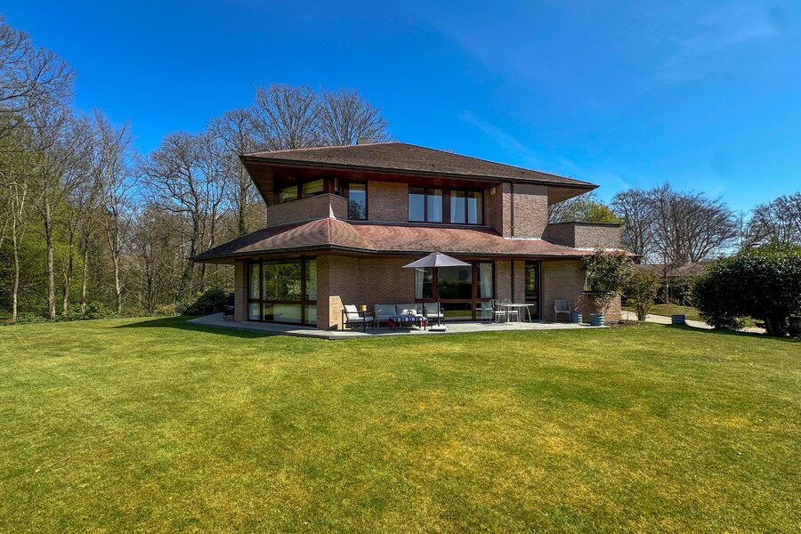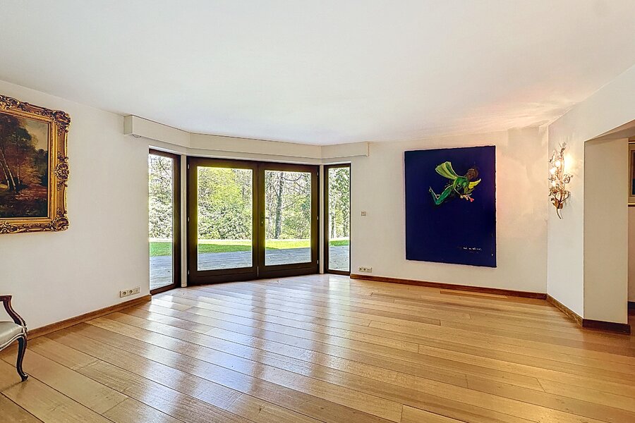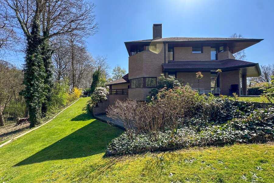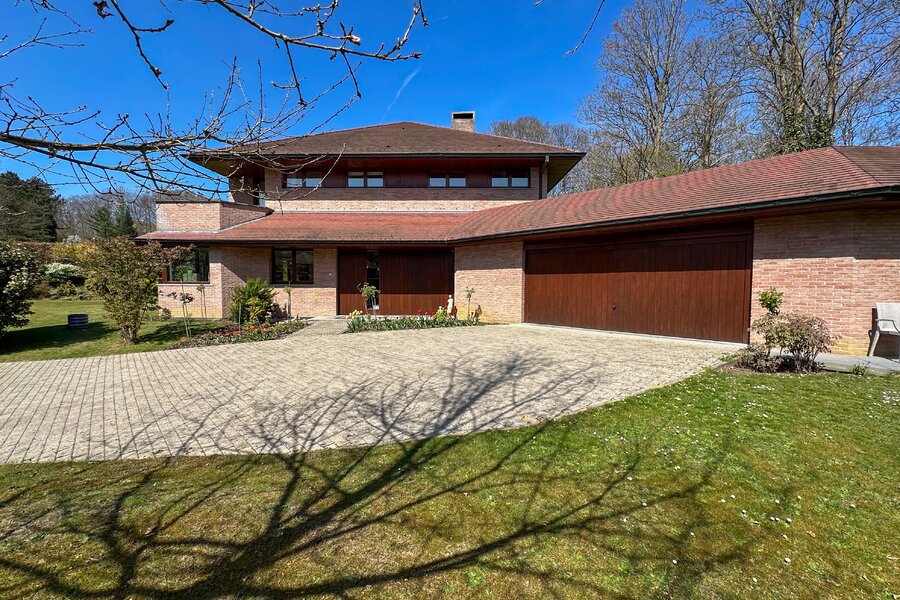 Cette magnifique villa d’architecte de ±350m² habitables est implantée sur un terrain de ±24 ares, dans un clos paisible, et offre une vue imprenable sur le bois qui borde l’arrière du jardin.