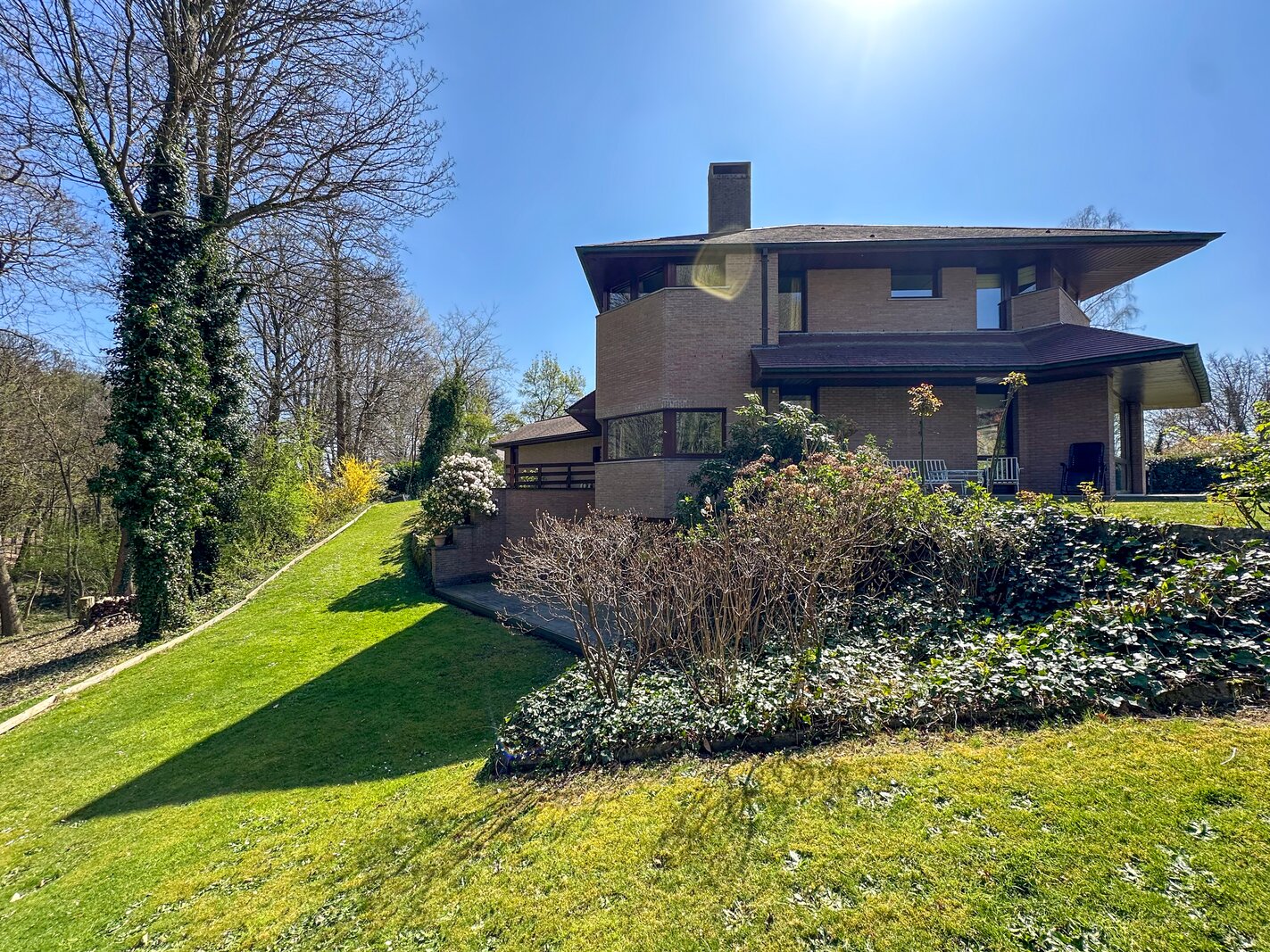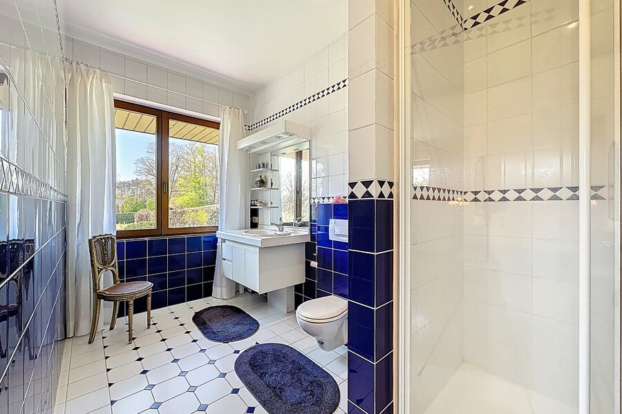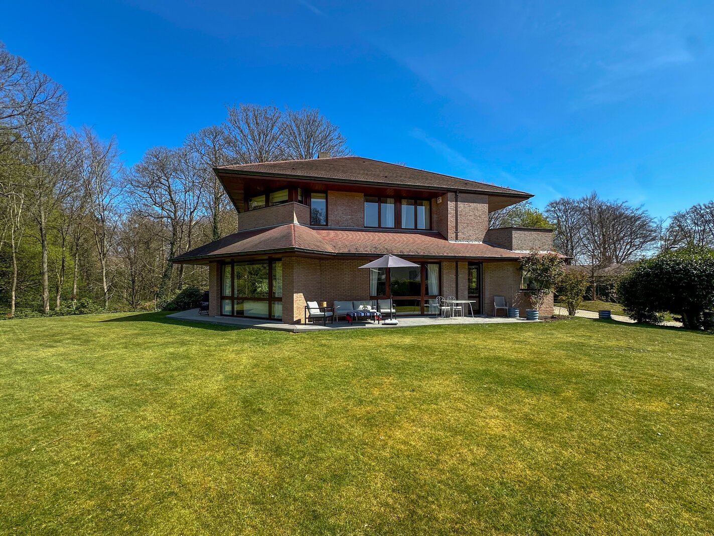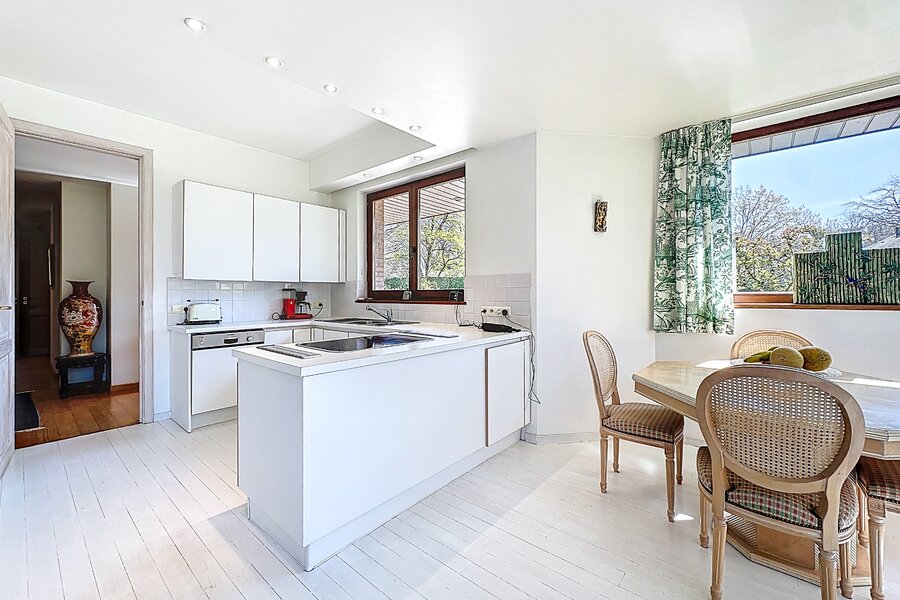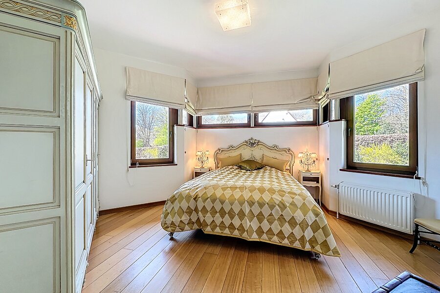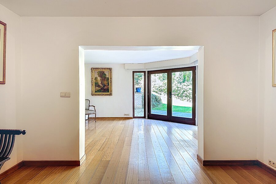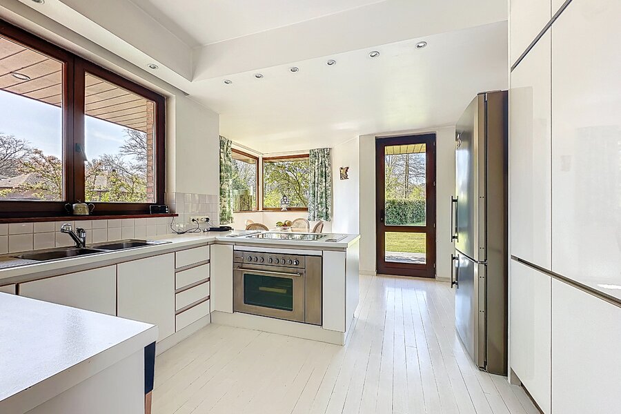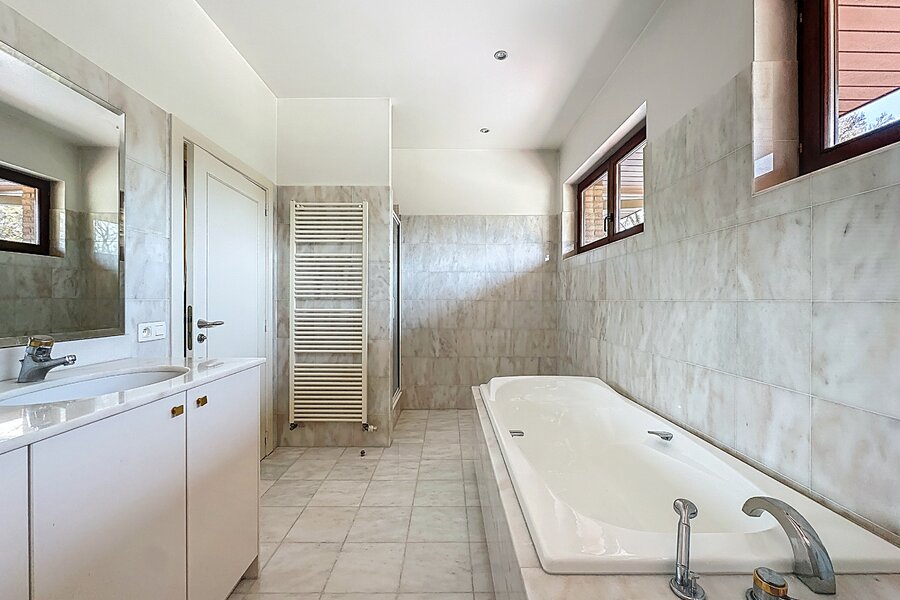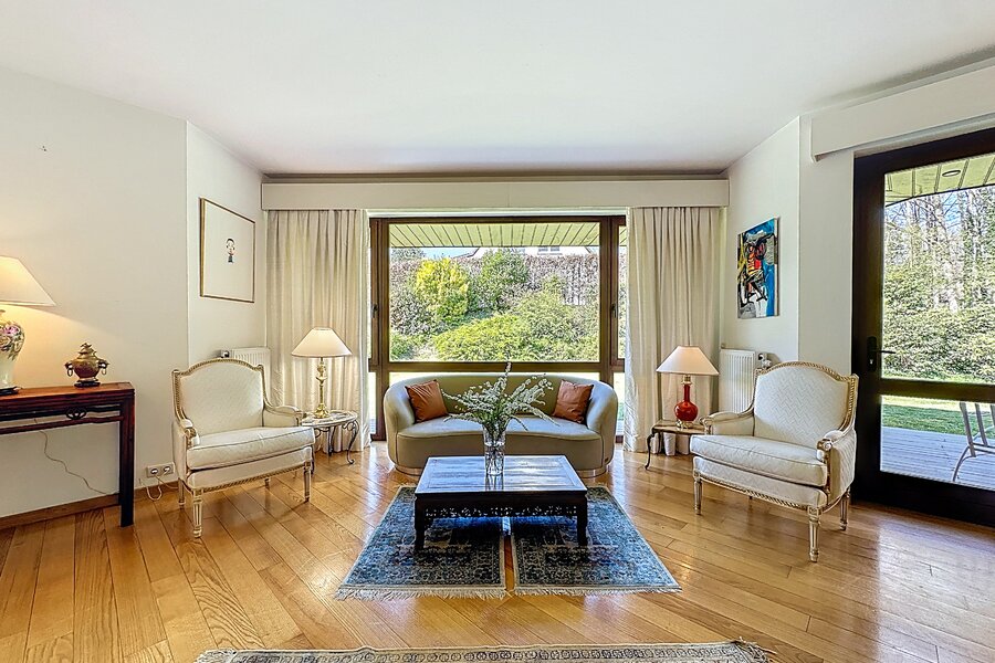 Cette magnifique villa d’architecte de ±350m² habitables est implantée sur un terrain de ±24 ares, dans un clos paisible, et offre une vue imprenable sur le bois qui borde l’arrière du jardin.