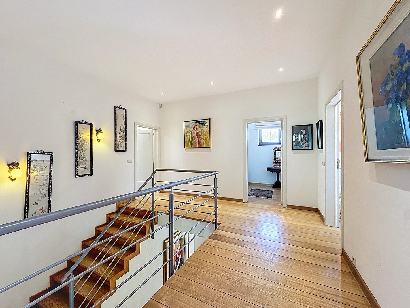 Dès l’entrée, un hall avec vestiaire et toilette indépendante accueille les visiteurs. Le rez-de-chaussée s’ouvre sur une salle à manger et un vaste salon, tous deux baignés de lumière grâce aux nombreuses baies vitrées. La cuisine, entièrement équipée, dispose d’un espace dinatoire. Un bureau indépendant, un grand garage et une buanderie complètent ce niveau.
