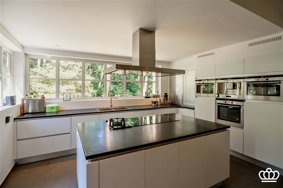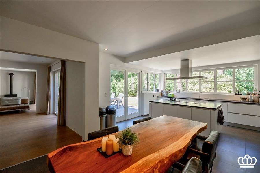 Via dubbele glazen deuren vanuit de inkomhal toegang tot de ruime en lichte living met erker op eiken parket onderverdeeld in een TV hoek met gashaard, een zithoek met houtkachel en een eetplaats. Open verbinding naar de moderne leefkeuken met eethoek en keuken uitgerust met kookeiland voorzien van composiet werkblad, 5-pitsinductie kookplaat, wokbrander, dampkap, daarnaast inbouwkasten met vaatwasser, oven, microgolf, stoomoven, ingebouwde koffiemachine, dubbele ijskast en dubbele spoelbak, middels dubbele deuren toegang tot het terras. Tevens toegang tot achteringang / bijkeuken met aansluitingen voor wasmachine en droogkast.