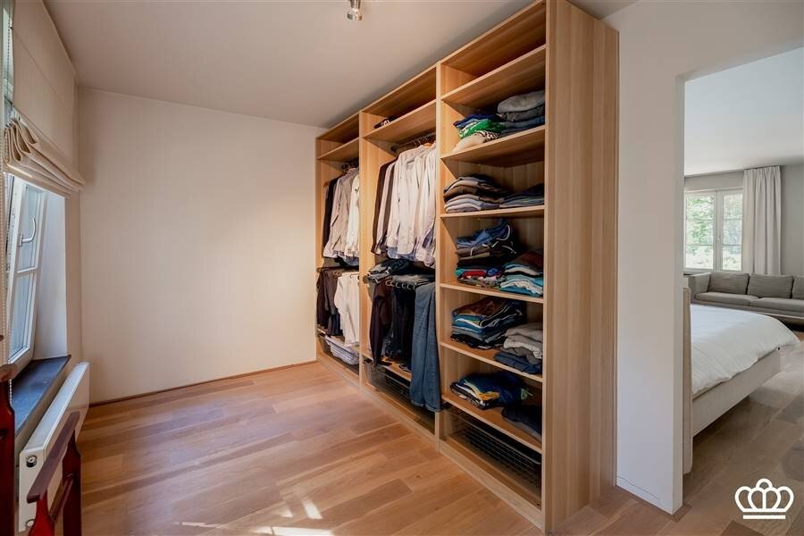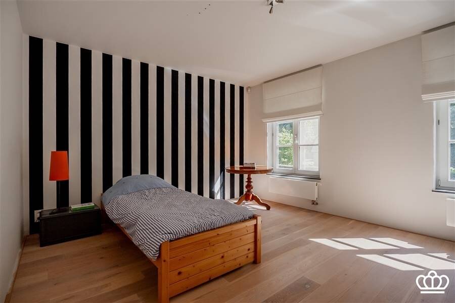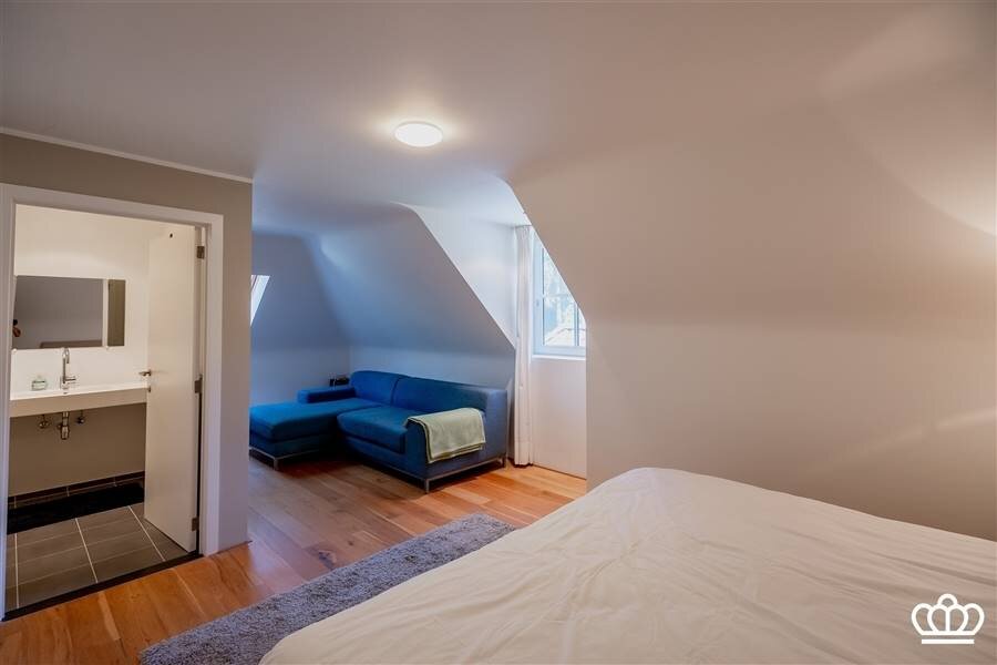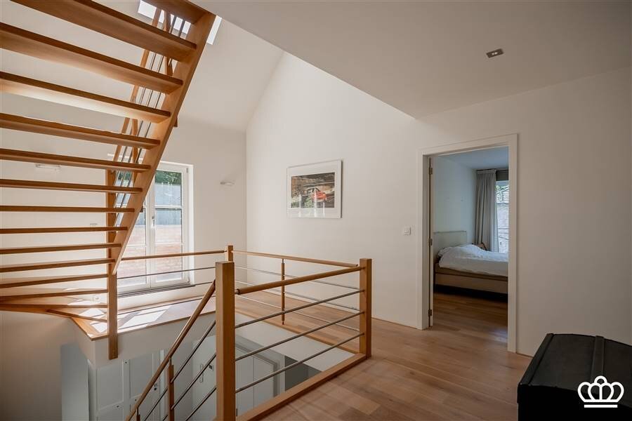 De trappartij wordt vervolgd tot aan de 2e verdieping, hier bevinden zich nog een gastenkamer met aanpalende douchekamer, een 5e slaapkamer, momenteel in gebruik als sportruimte en een aparte ruimte met was- en droogvoorzieningen.