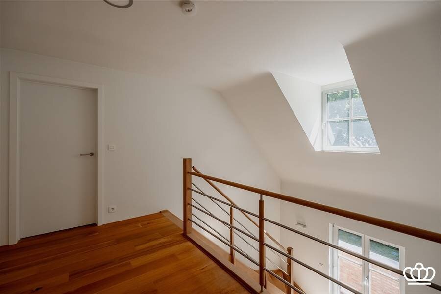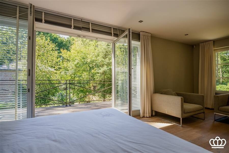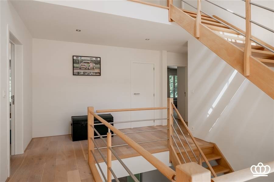 Langs de massief eikenhouten trap in de inkomhal toegang tot de nachthal die uitgeeft op de riante masterbedroom met balkon, dressing en ruime design badkamer met ligbad, toilet, bidet, ruime inloopdouche, wandverwarming en dubbele lavabo in meubel. Verder nog 2 ruime slaapkamers en een 2e bad/douchekamer met lavabo, douche en toilet.