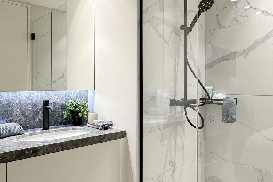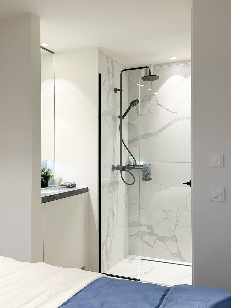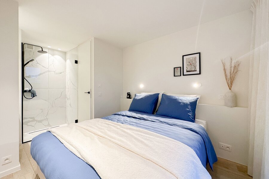 À l'arrière, deux grandes chambres avec placards intégrés disposent chacune de leur propre salle de douche attenante. Les deux chambres s'ouvrent sur une deuxième terrasse ensoleillée de 22 m², un espace parfait pour se détendre en toute tranquillité.