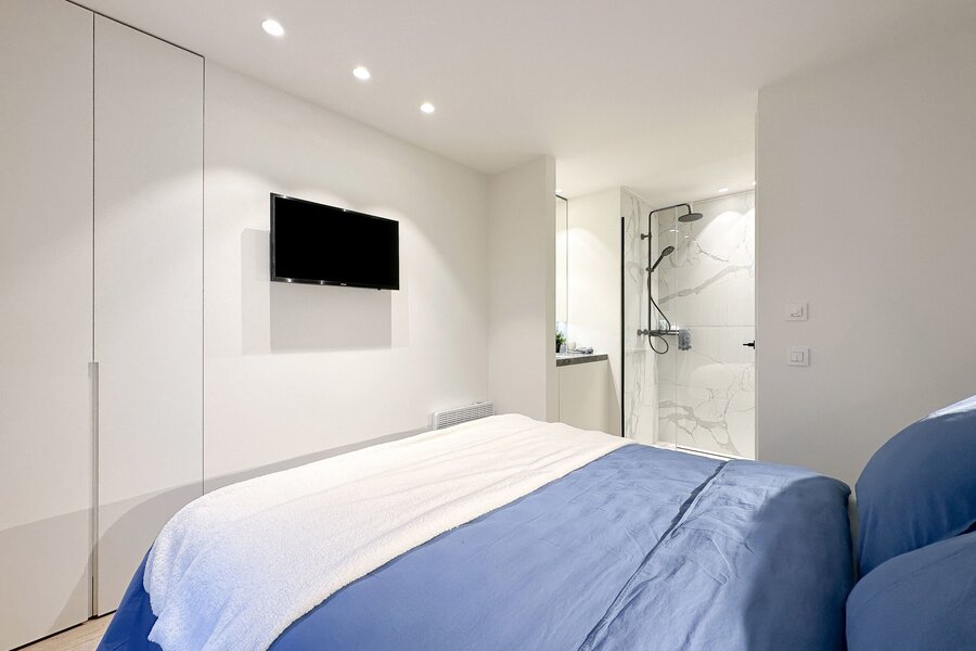 Dès l'entrée, un hall avec vestiaire et toilette invités vous accueille. Le séjour lumineux, doté d'une impressionnante largeur de façade, est prolongé par une cuisine ouverte moderne, équipée de tout le confort contemporain. Un coin repas convivial donne accès à une magnifique terrasse de 27 m², offrant une vue latérale sur la mer et une orientation idéale pour profiter du soleil.