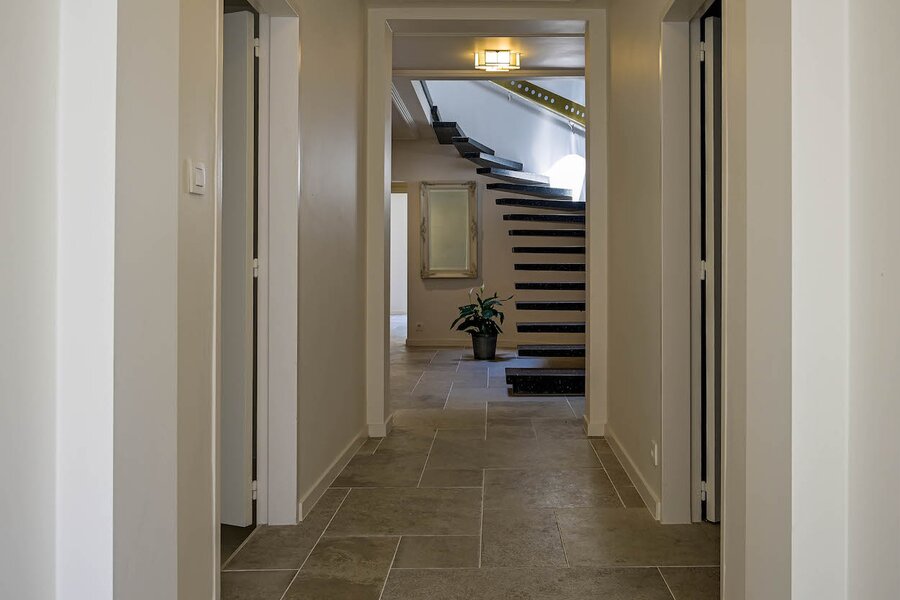 Op het gelijkvloers bevindt zich de centrale inkomhal met rechts een polyvalente ruimte, ideaal als bureel of praktijkruimte. Links is er een ruime garage. De inkomhal verrast met een stijlvolle zwevende trap in natuursteen, voorzien van een messing detail en ingebouwde verlichting – een echte eyecatcher.