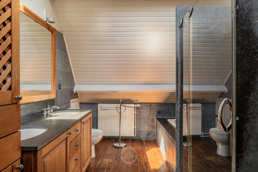 Op de bovenverdieping geeft de nachthal toegang tot twee ruime slaapkamers en een kinderkamer. De badkamer is eigentijds ingericht met zowel een ligbad als een aparte douche. Kwalitatief maatwerk werd doorheen de woning voorzien, wat bijdraagt aan de degelijkheid en afwerking.