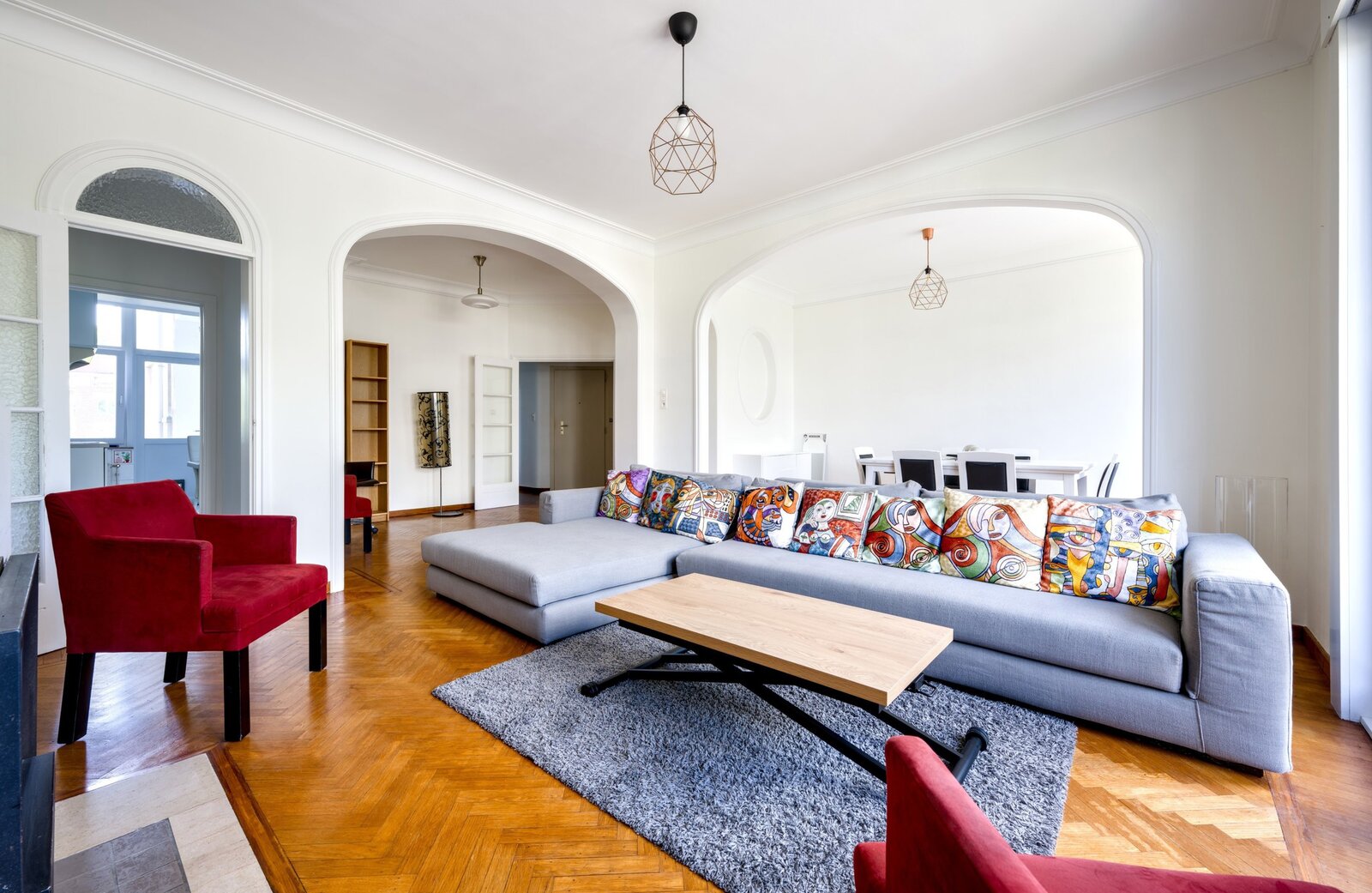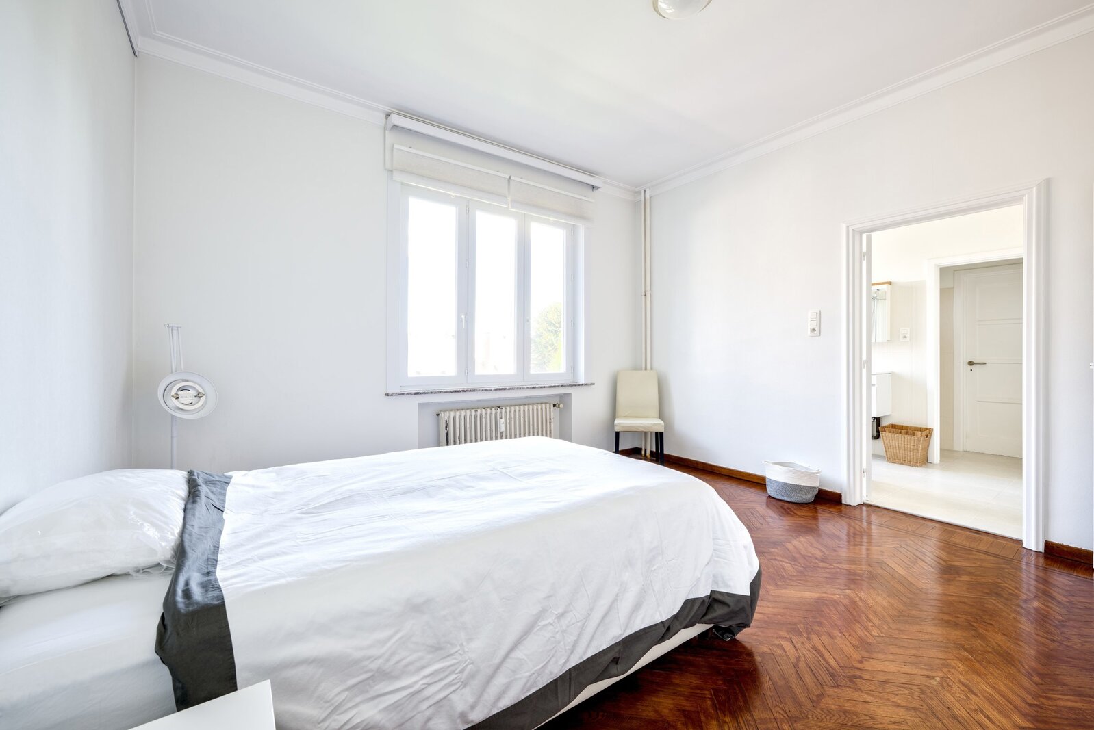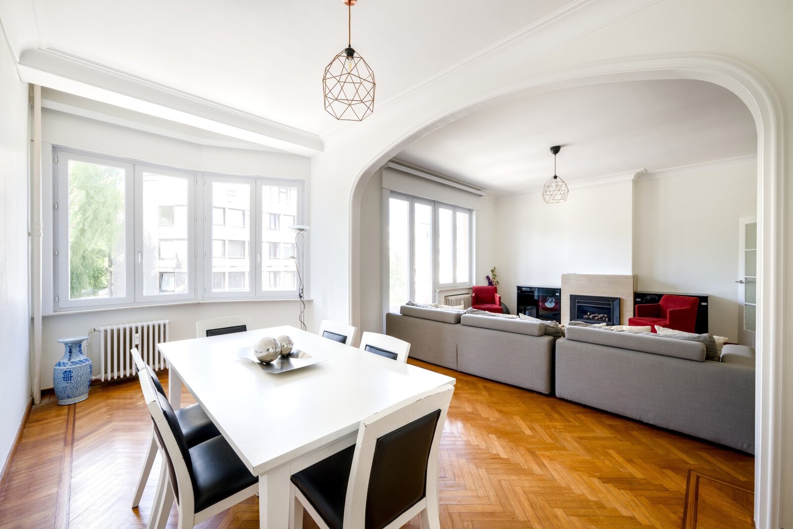 Quartier Roosevelt-Hippodrome de Boitsfort, dans une situation résidentielle et aérée , bel appartement de caractère dans un immeuble bati en 1949. Surface +/-160m², agréable living de +/-45m² parquet , vaste cuisine super équipée, 2 belles chambres, salle de bains, cave et chambre de bonne. Garage. PEB : E