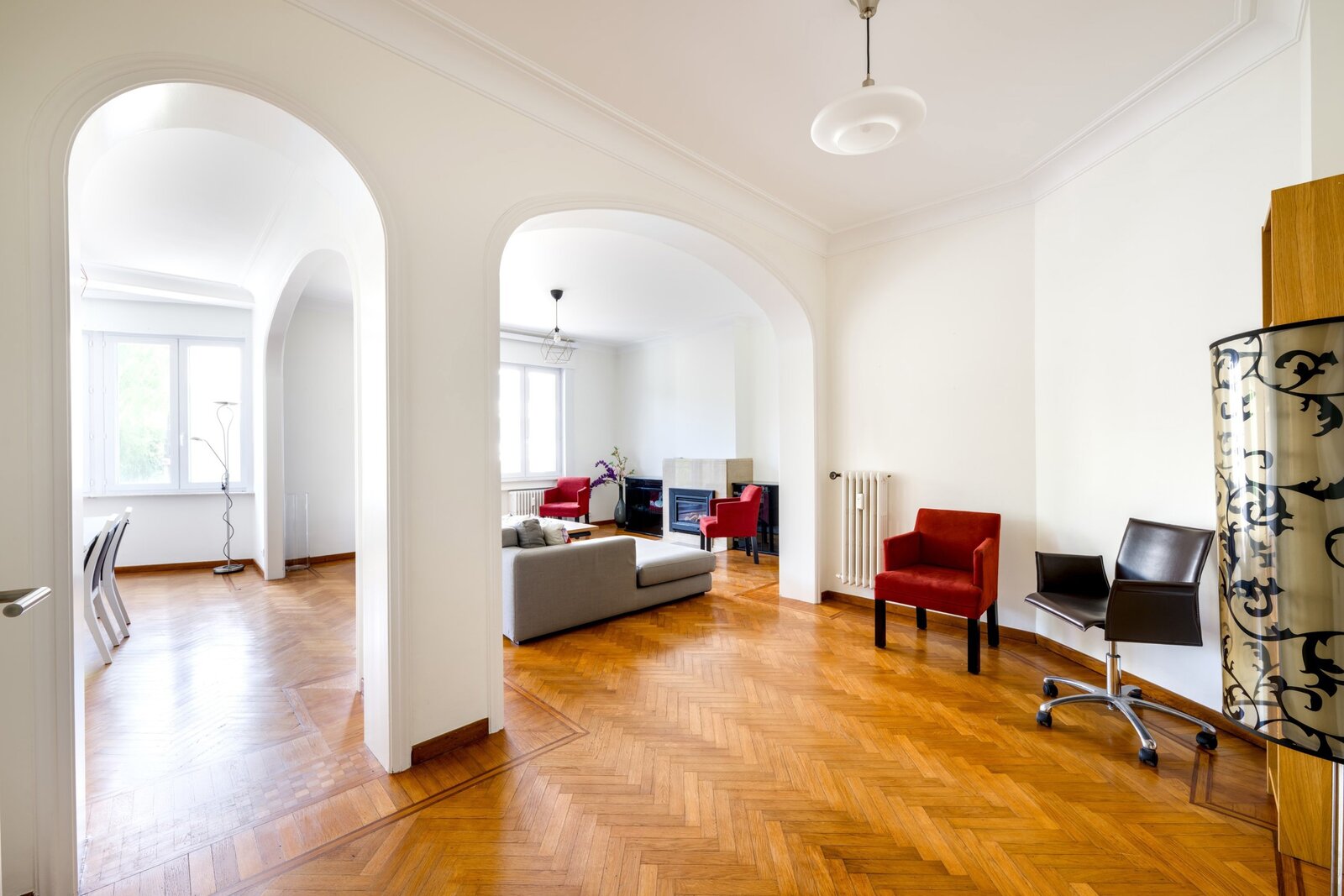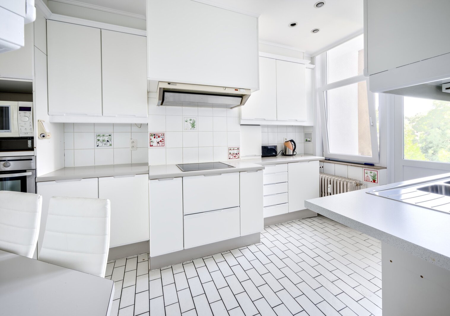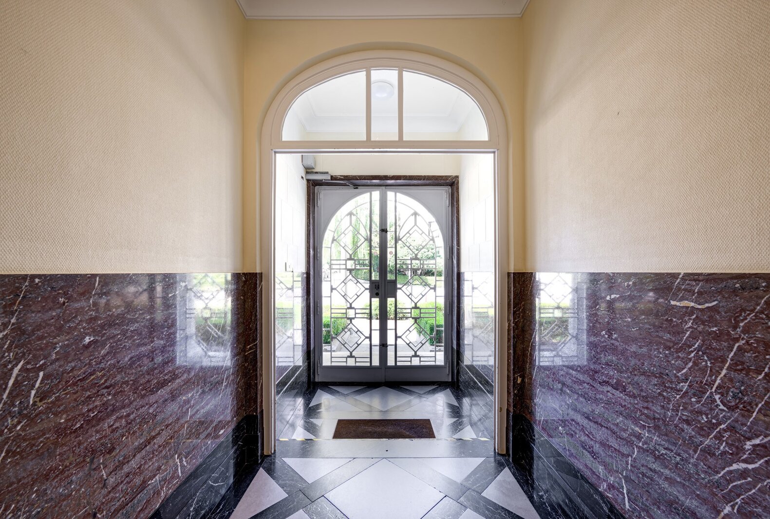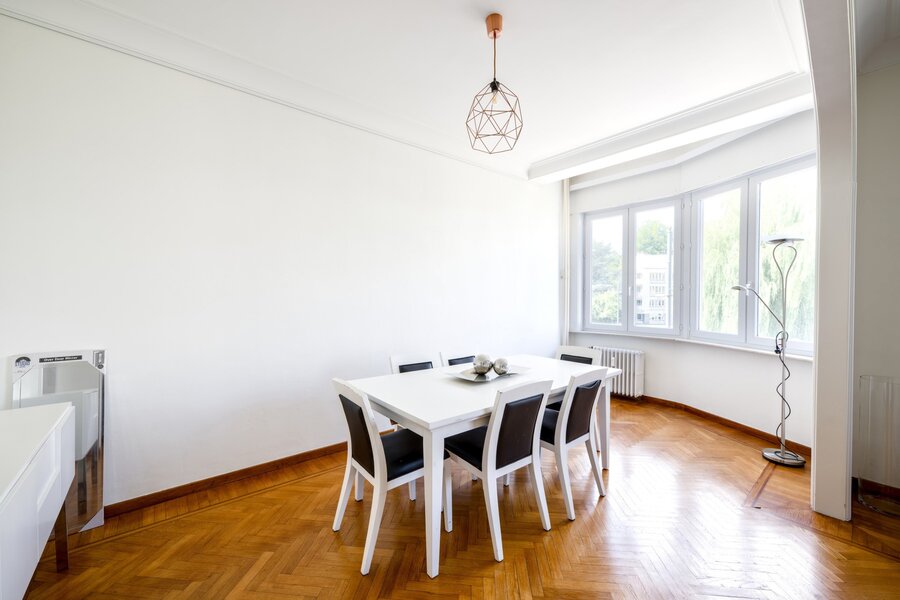 Quartier Roosevelt-Hippodrome de Boitsfort, dans une situation résidentielle et aérée , bel appartement de caractère dans un immeuble bati en 1949. Surface +/-160m², agréable living de +/-45m² parquet , vaste cuisine super équipée, 2 belles chambres, salle de bains, cave et chambre de bonne. Garage. PEB : E