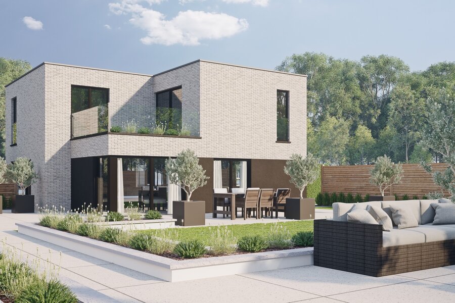 Als voorbeeld tonen we je graag een moderne nieuwbouwwoning met een doordachte indeling: drie volwaardige slaapkamers, een ruime badkamer, een lichtrijke leefruimte met open keuken en eetplaats, grote raampartijen en een gezellig terras.