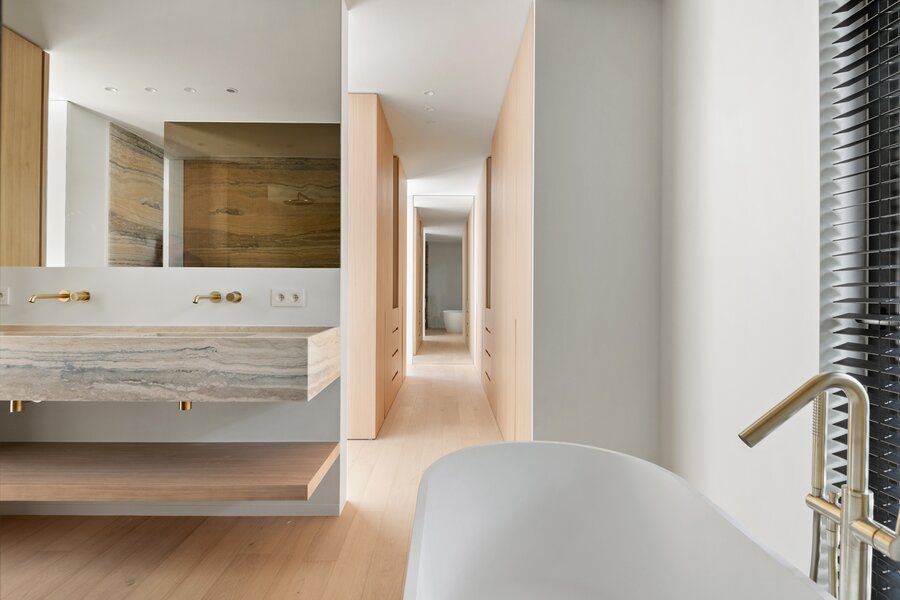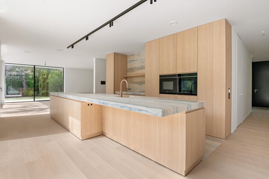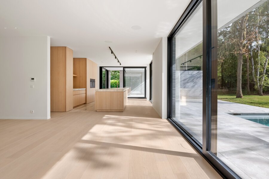 Dès l'entrée, vous êtes immédiatement entouré de lumière et d'espace. Les grandes fenêtres non seulement inondent la maison de lumière naturelle, mais créent également une connexion harmonieuse entre l'intérieur et l'extérieur. Les espaces de vie ouverts se fondent les uns dans les autres, procurant une sensation de liberté et d'ouverture. La cuisine moderne, finie avec les matériaux les plus qualitatifs et équipée de tous les appareils contemporains, constitue le cœur de la maison – idéale pour les moments familiaux conviviaux comme pour les dîners élégants entre amis.