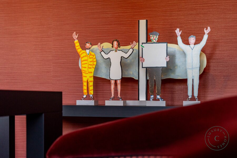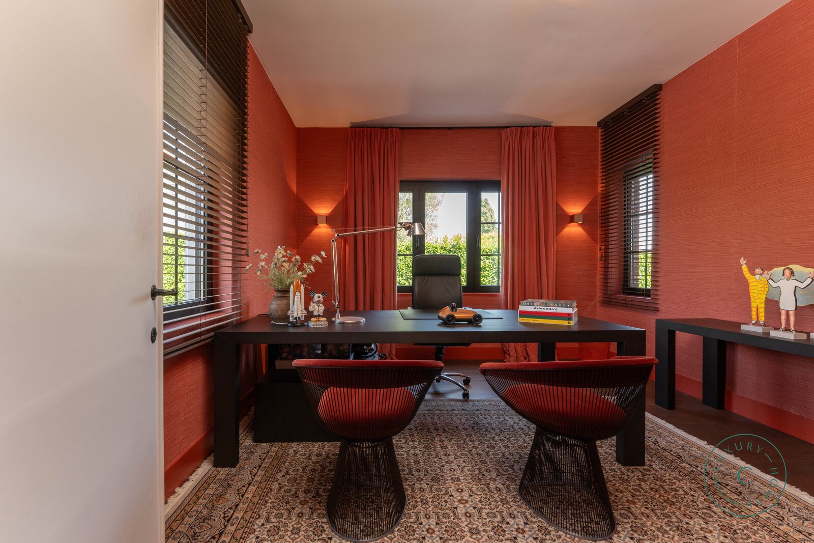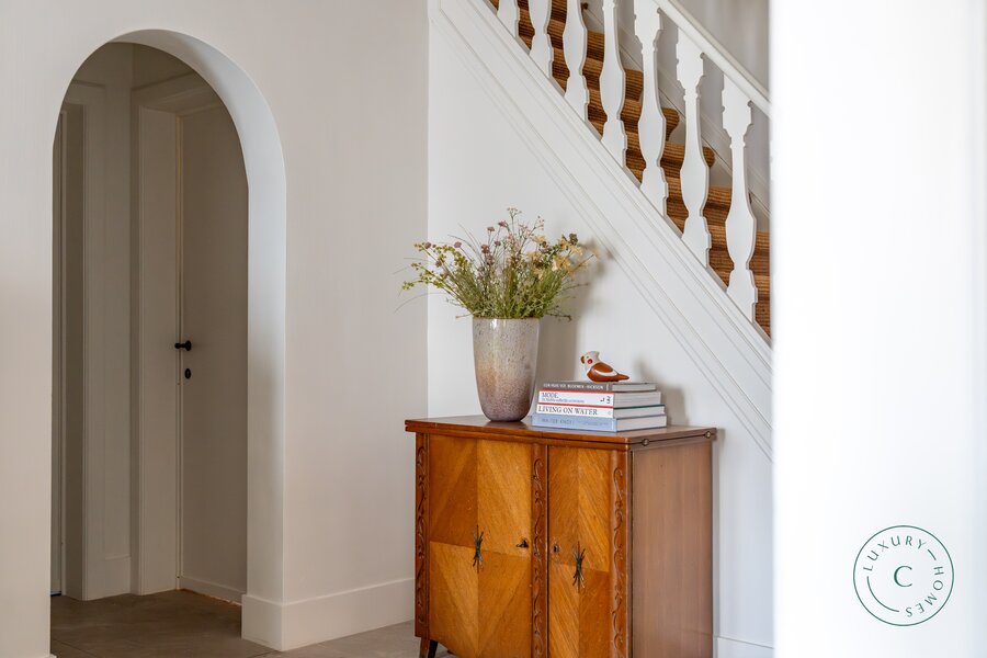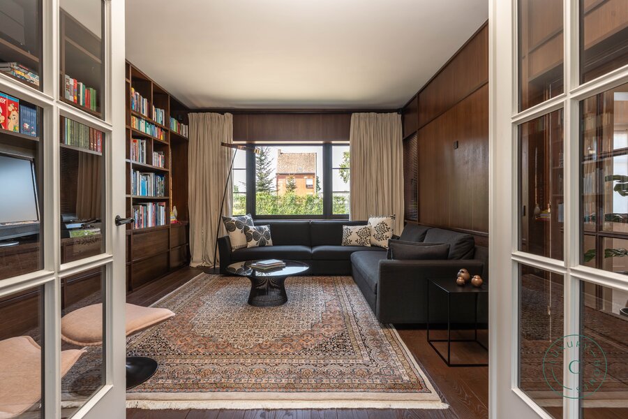 Op het gelijkvloers verwelkomt een elegante inkomhal u, met links een stijlvolle bureauruimte, ideaal voor wie van thuis uit wenst te werken in alle sereniteit. Verder is er een gastentoilet en een vestiaire.