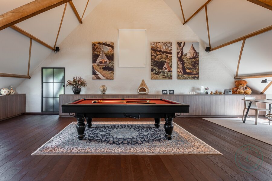 De tweede verdieping biedt een volwaardige open ruimte, momenteel ingericht als sfeervolle ontspanningsruimte met bar en pooltafel, maar eenvoudig aan te passen aan uw eigen wensen.