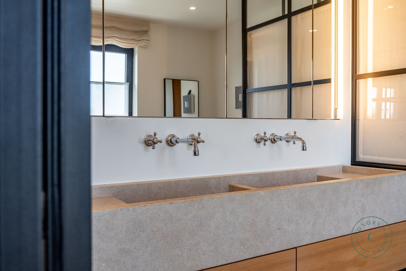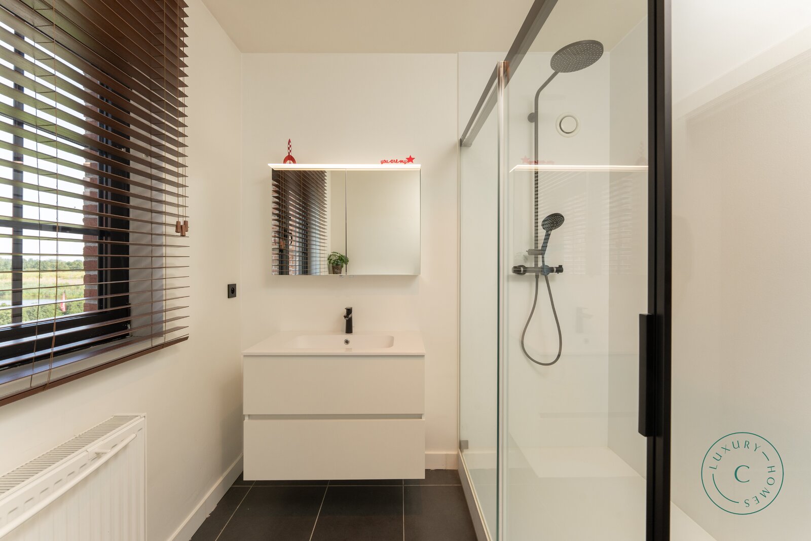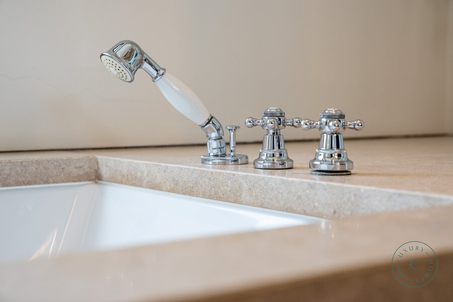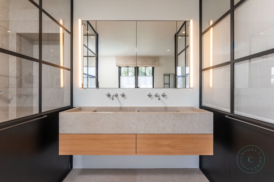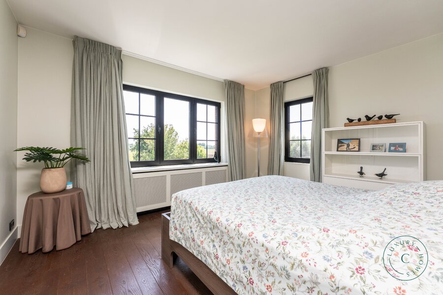 Op de eerste verdieping bevindt zich de mastersuite met twee afzonderlijke dressings en een badkamer met zowel douche als ligbad. Verder zijn er nog twee slaapkamers en een badkamer met douche.