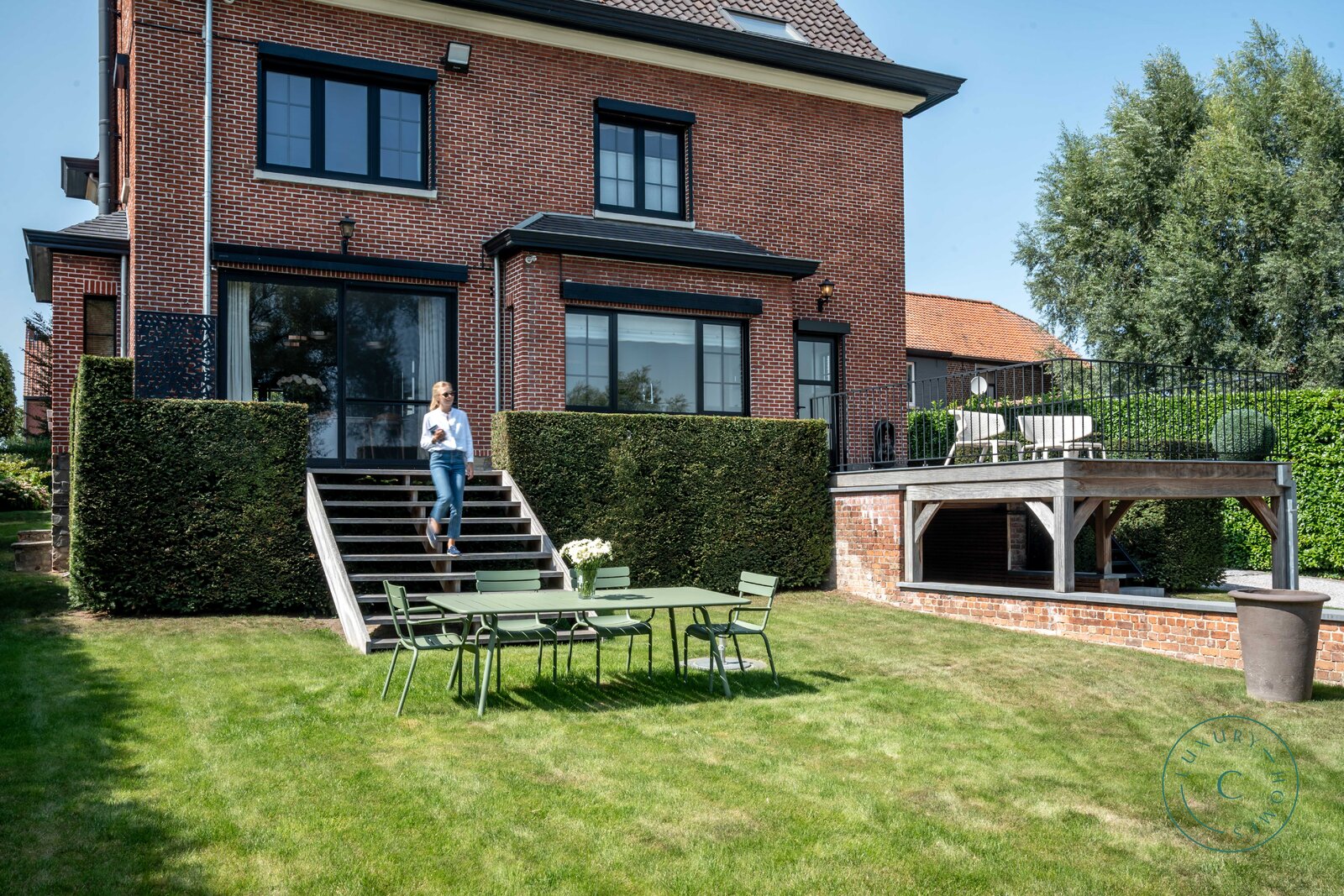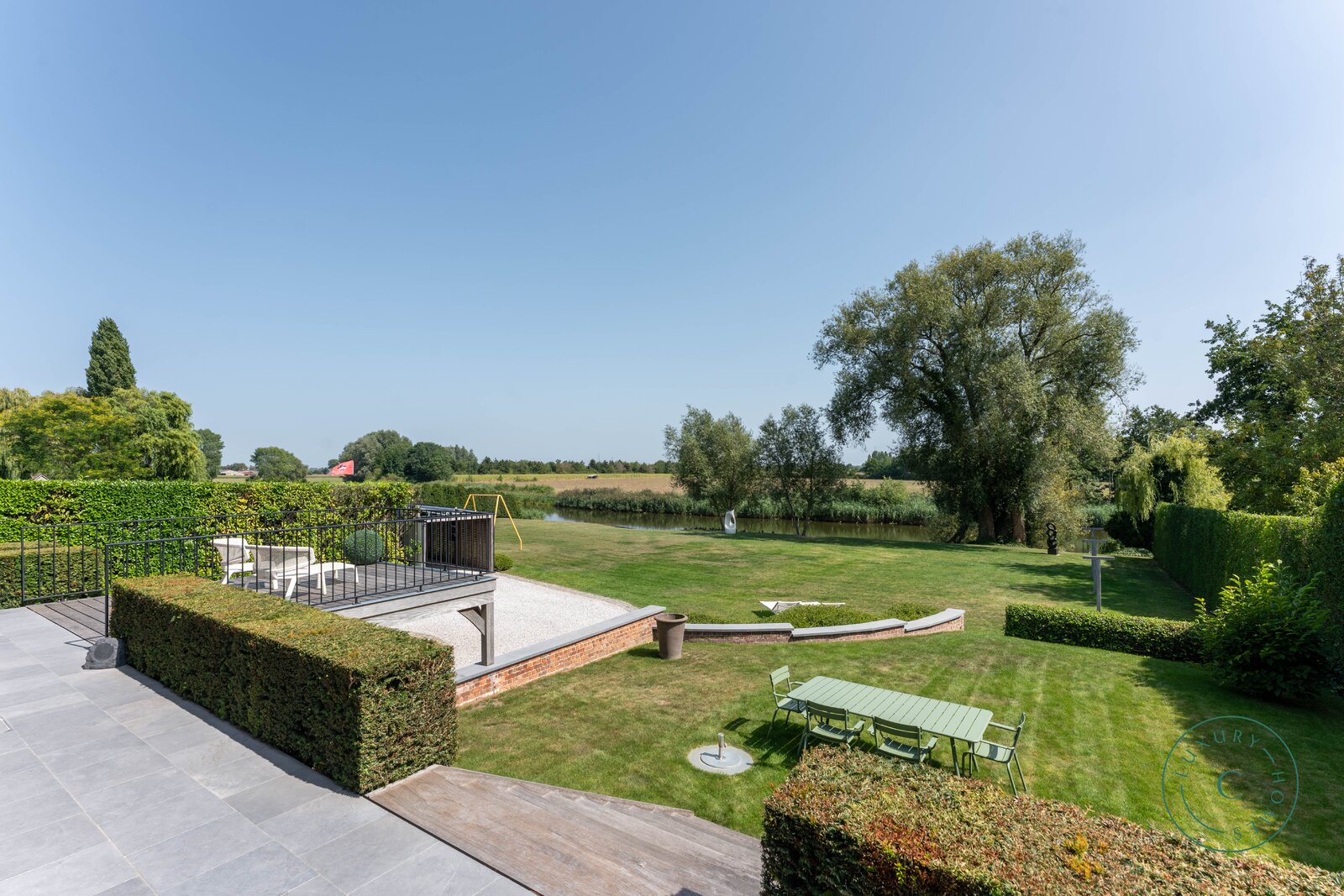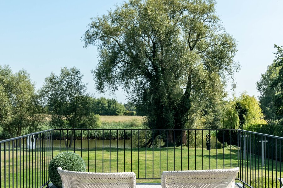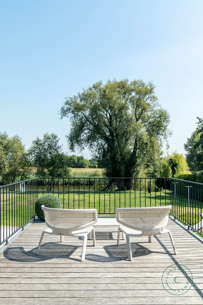 Buiten vormt het ruime terras met gezellige aperitiefhoek de perfecte setting voor lange zomeravonden met vrienden en familie. De prachtig aangelegde tuin loopt tot aan de Leie en vormt een oase van rust aan het water.