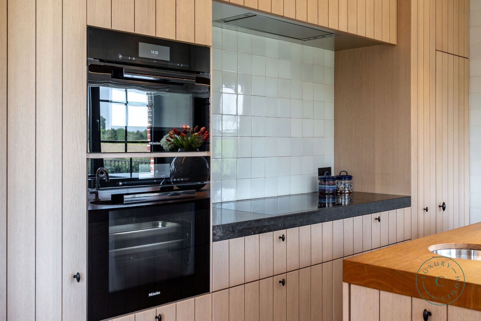De ruime leefruimte en eetplaats met open haard vloeien harmonieus in elkaar over en bieden, dankzij de grote raampartijen, een panoramisch uitzicht op de tuin. De lichtrijke, volledig uitgeruste keuken met praktische berging maakt het geheel compleet.
