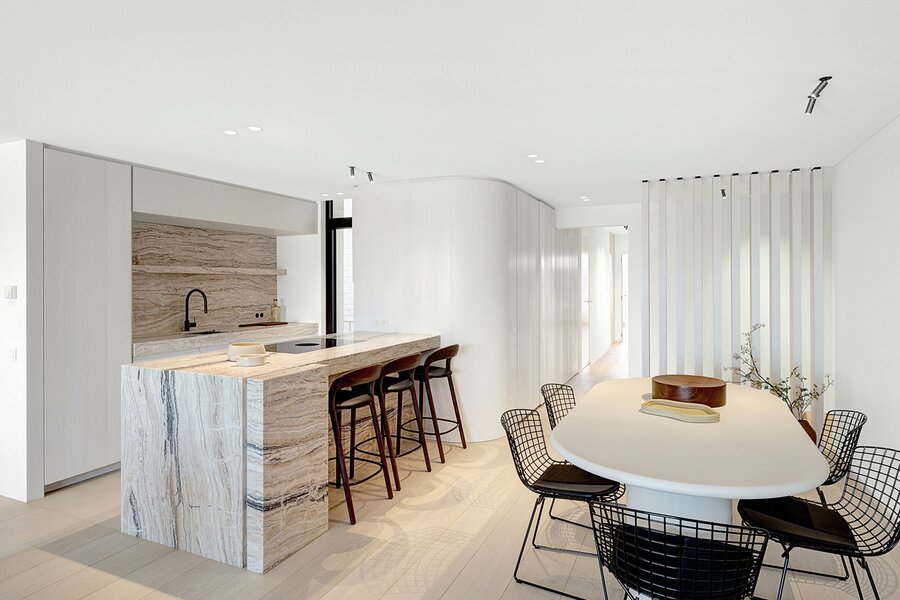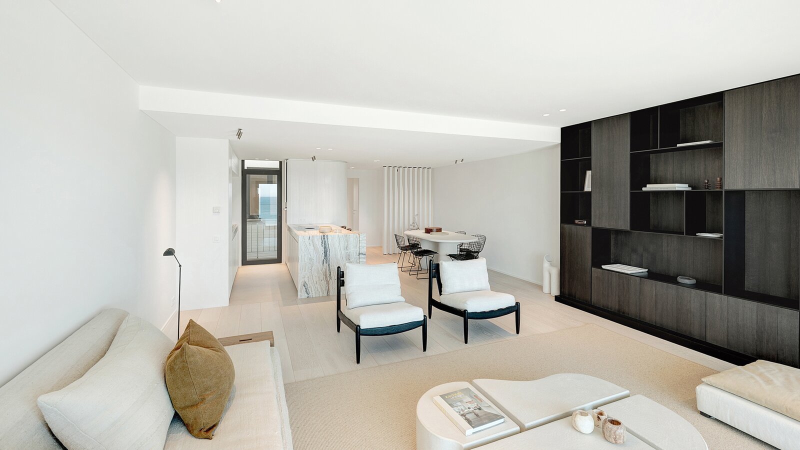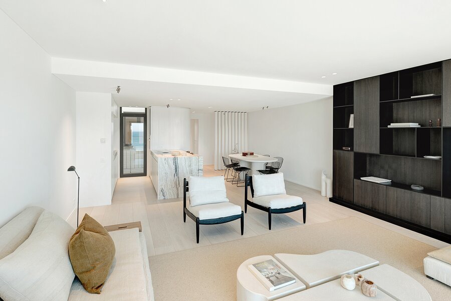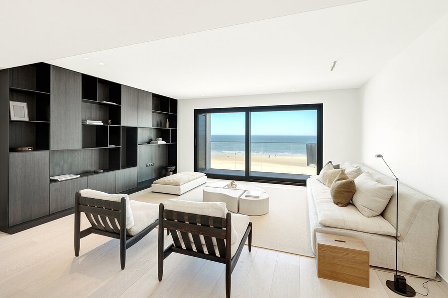 Composition : Hall d’entrée avec vestiaire et toilette invités, spacieux séjour donnant sur la terrasse ( avec rangements) jouissant d’une large vue mer, la plage et les dunes. Cuisine américaine luxueuse en pierre naturel et salle à manger.
