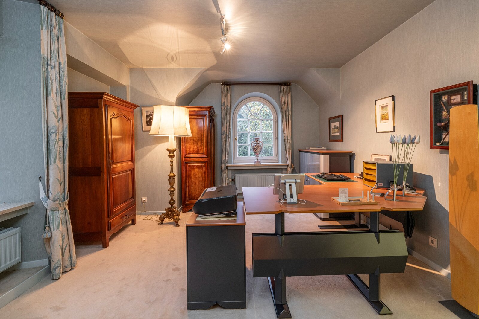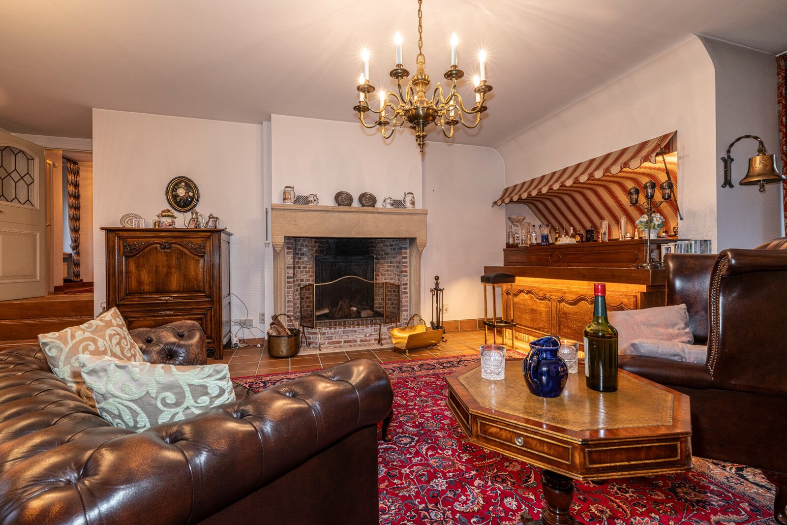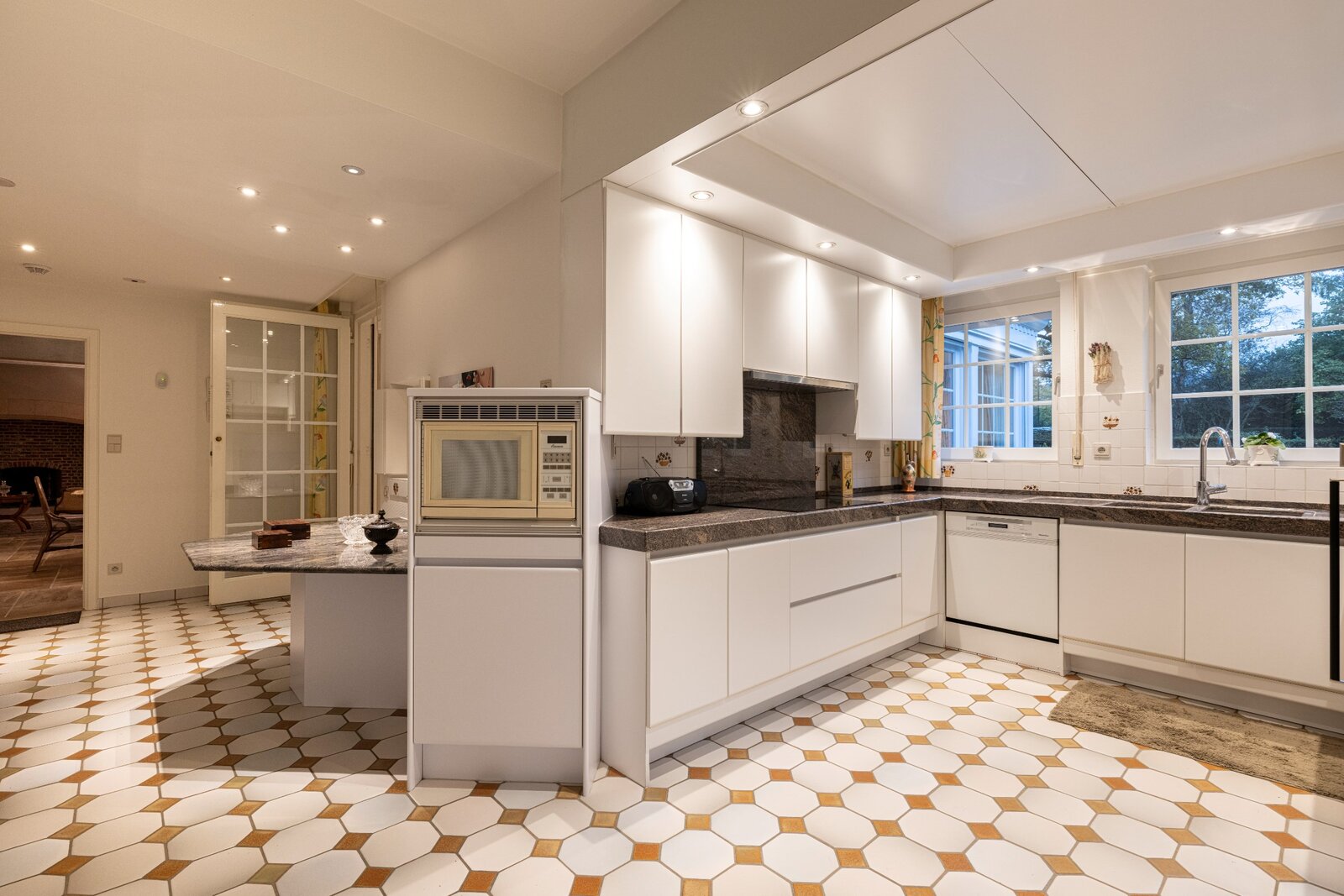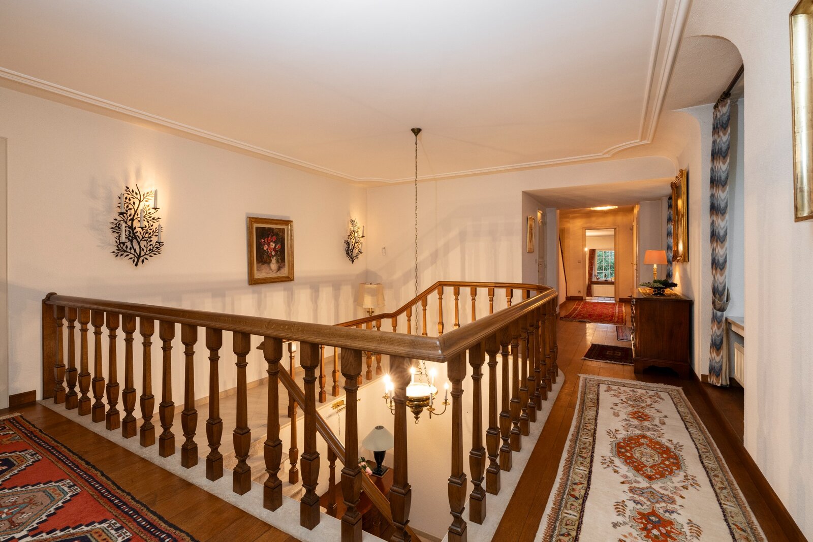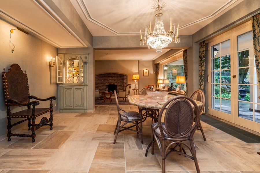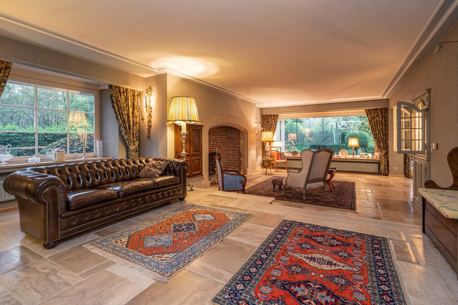 En passant par le hall d'entrée imposant avec son beau sol en travertin et son grand escalier, nous entrons dans cette villa de classe. À droite, on trouve un bureau très spacieux, au centre la cuisine et à gauche le salon. Celui-ci se compose de 3 parties spacieuses, dont un coin lecture, un coin TV près de la cheminée et un coin repas avec accès à la terrasse couverte, à la véranda et ensuite à la cuisine très spacieuse avec coin petit-déjeuner. La cuisine dispose d'un cellier et nous mène ensuite à la buanderie, au très grand garage double et à l'escalier menant au sous-sol. Par un passage couvert vers le jardin, nous arrivons au 3e garage supplémentaire.