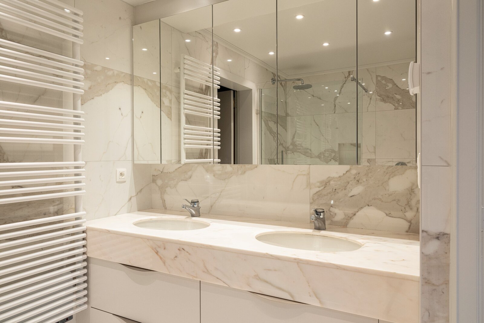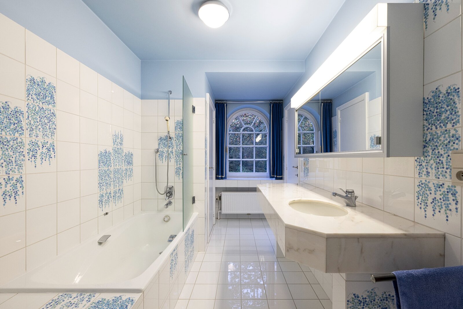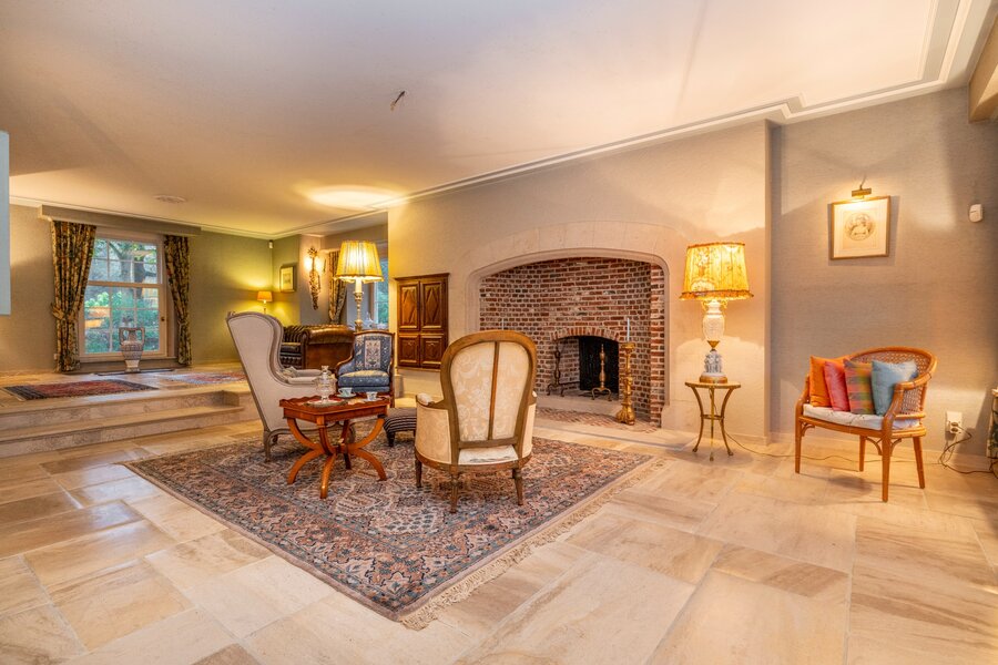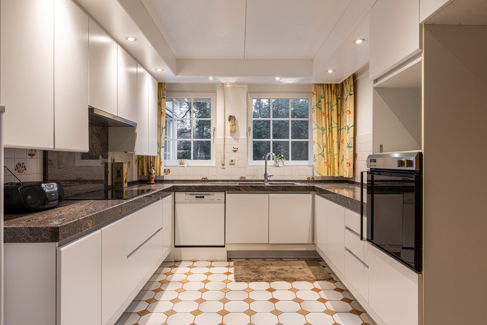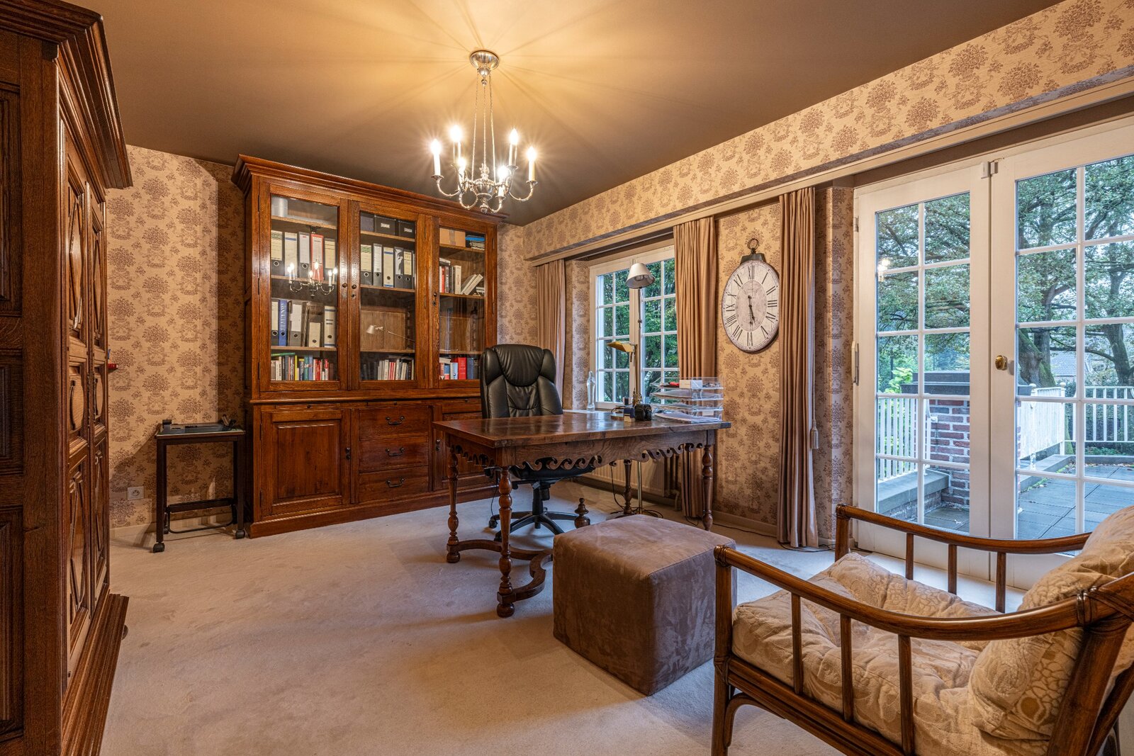 En passant par le hall d'entrée imposant avec son beau sol en travertin et son grand escalier, nous entrons dans cette villa de classe. À droite, on trouve un bureau très spacieux, au centre la cuisine et à gauche le salon. Celui-ci se compose de 3 parties spacieuses, dont un coin lecture, un coin TV près de la cheminée et un coin repas avec accès à la terrasse couverte, à la véranda et ensuite à la cuisine très spacieuse avec coin petit-déjeuner. La cuisine dispose d'un cellier et nous mène ensuite à la buanderie, au très grand garage double et à l'escalier menant au sous-sol. Par un passage couvert vers le jardin, nous arrivons au 3e garage supplémentaire.