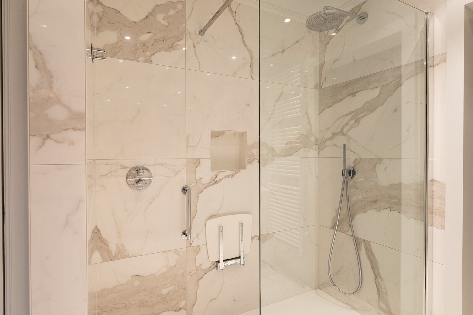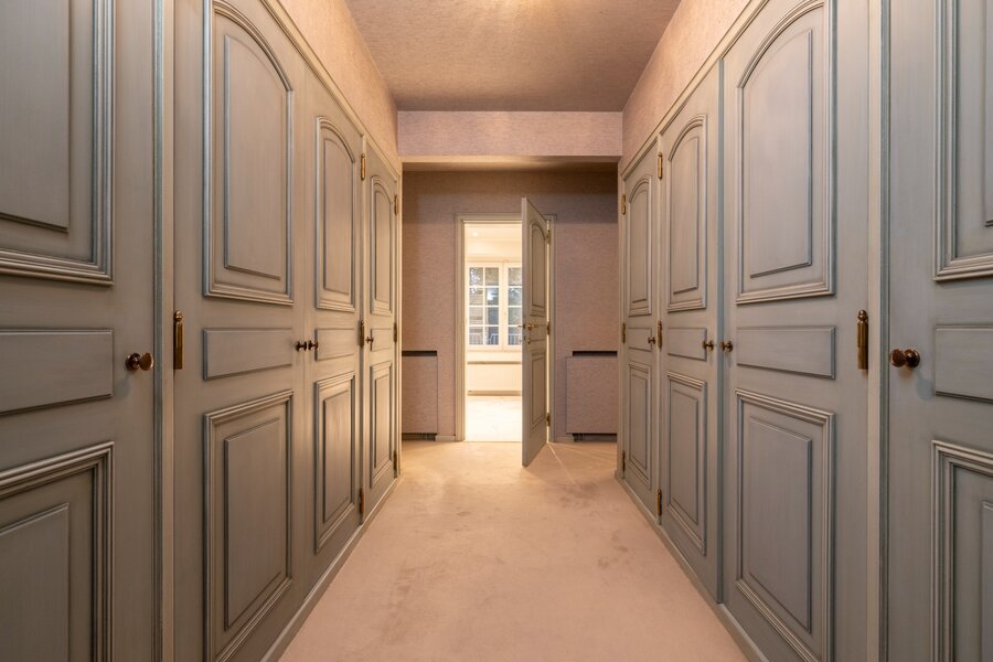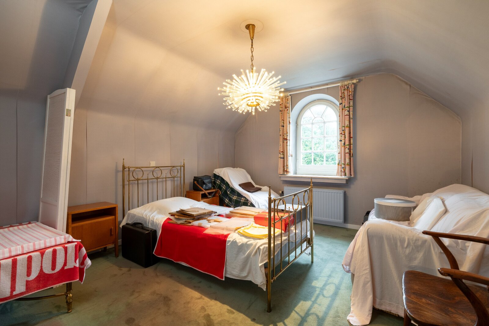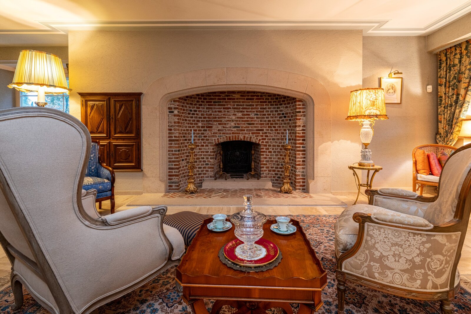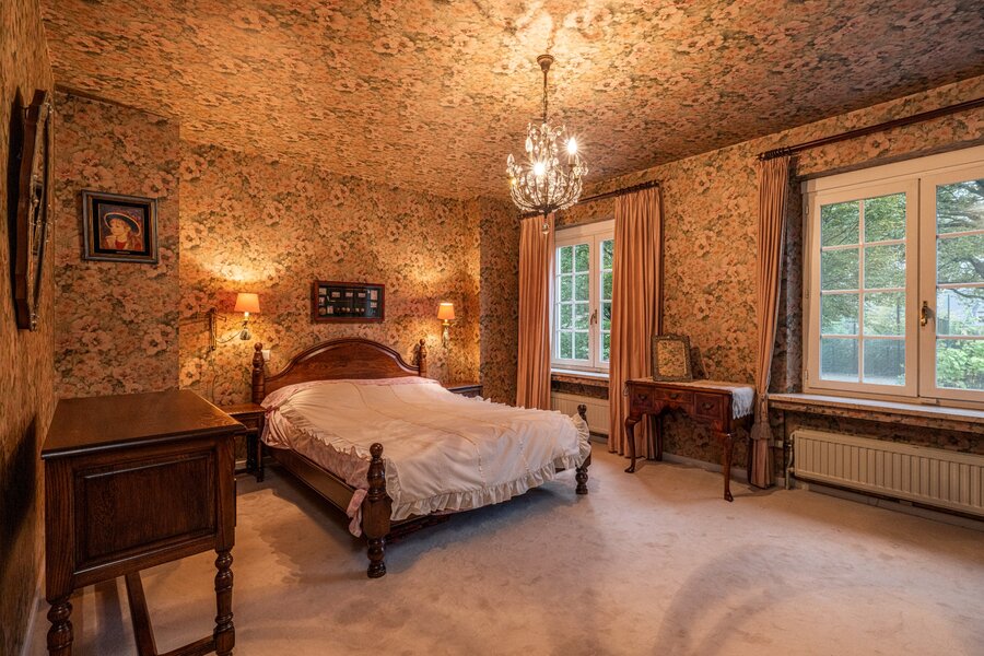 L'escalier imposant nous mène au 1er étage, avec ici le palier sur un beau parquet Brabo, qui nous mène aux différentes pièces de couchage et de séjour. La suite parentale se compose d'un dressing spacieux, d'une salle de bains entièrement rénovée avec double lavabo, toilettes séparées et une douche à l'italienne, ainsi que de 2 chambres ou dressing supplémentaires. La 3e et 4e chambre partagent une salle de bains communicante entre les deux. La 5e chambre est actuellement aménagée en salon supplémentaire avec une belle cheminée, un bar, un balcon et une pièce de rangement supplémentaire.