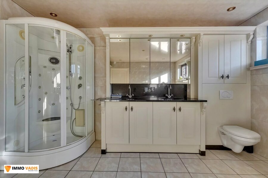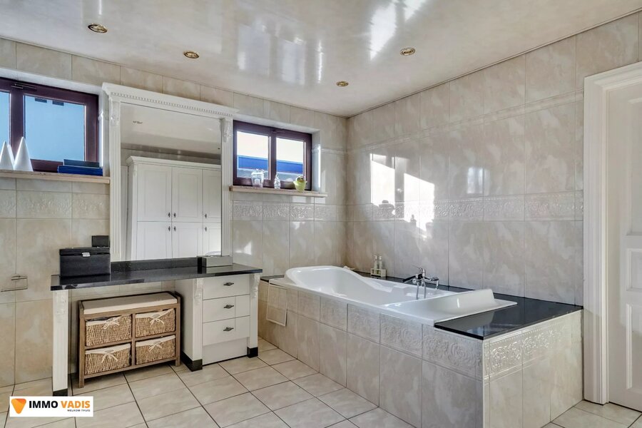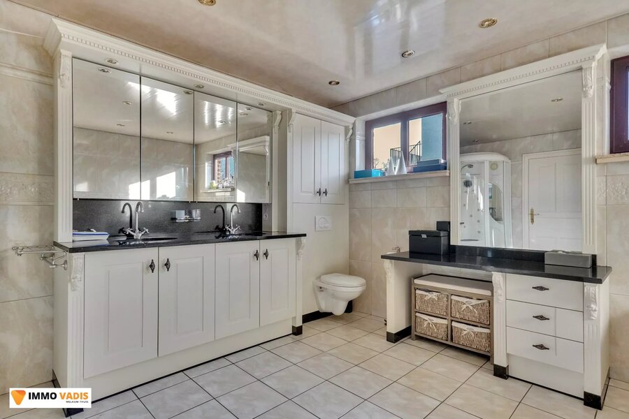 - Badkamer (18 m²) met ligbad, ruime douche en dubbele lavabo, verzonken in granieten tablet