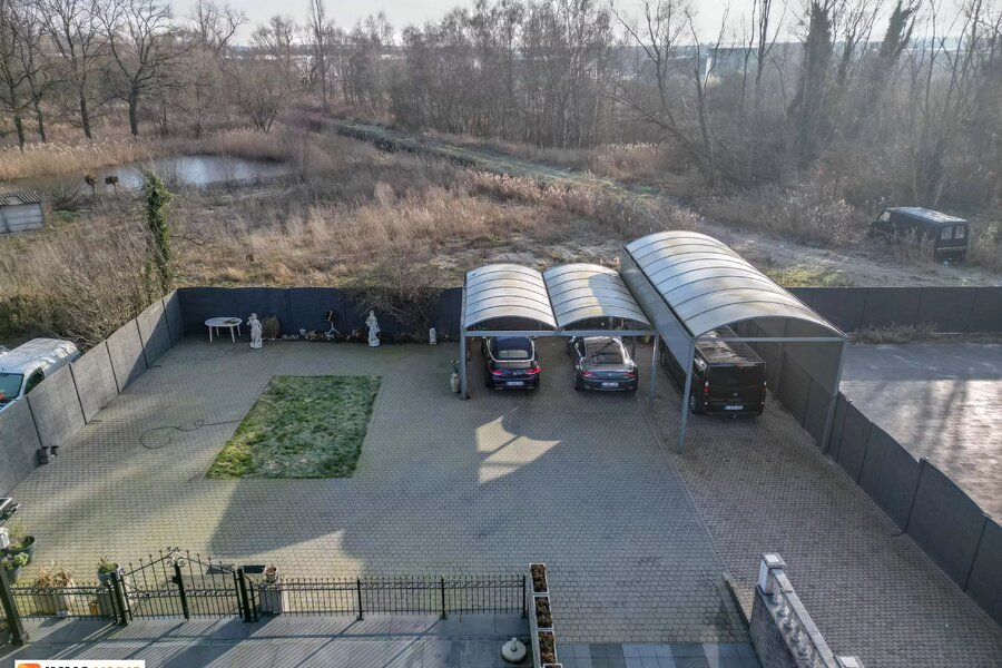 Het pand beschikt over een ruime inpandige garage, aangevuld met een dubbele carport voor wagens en een aparte carport met mobilhomehoogte.