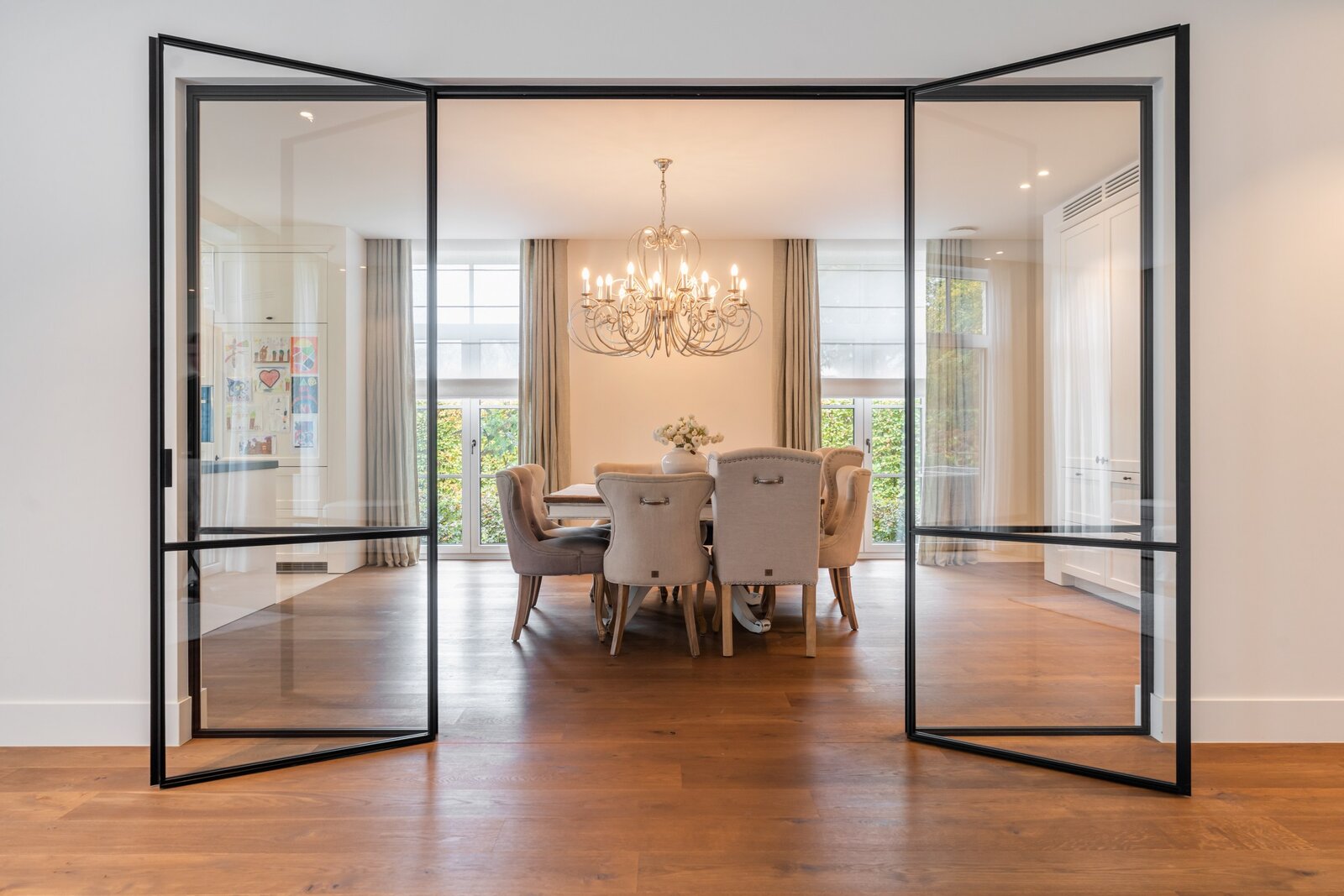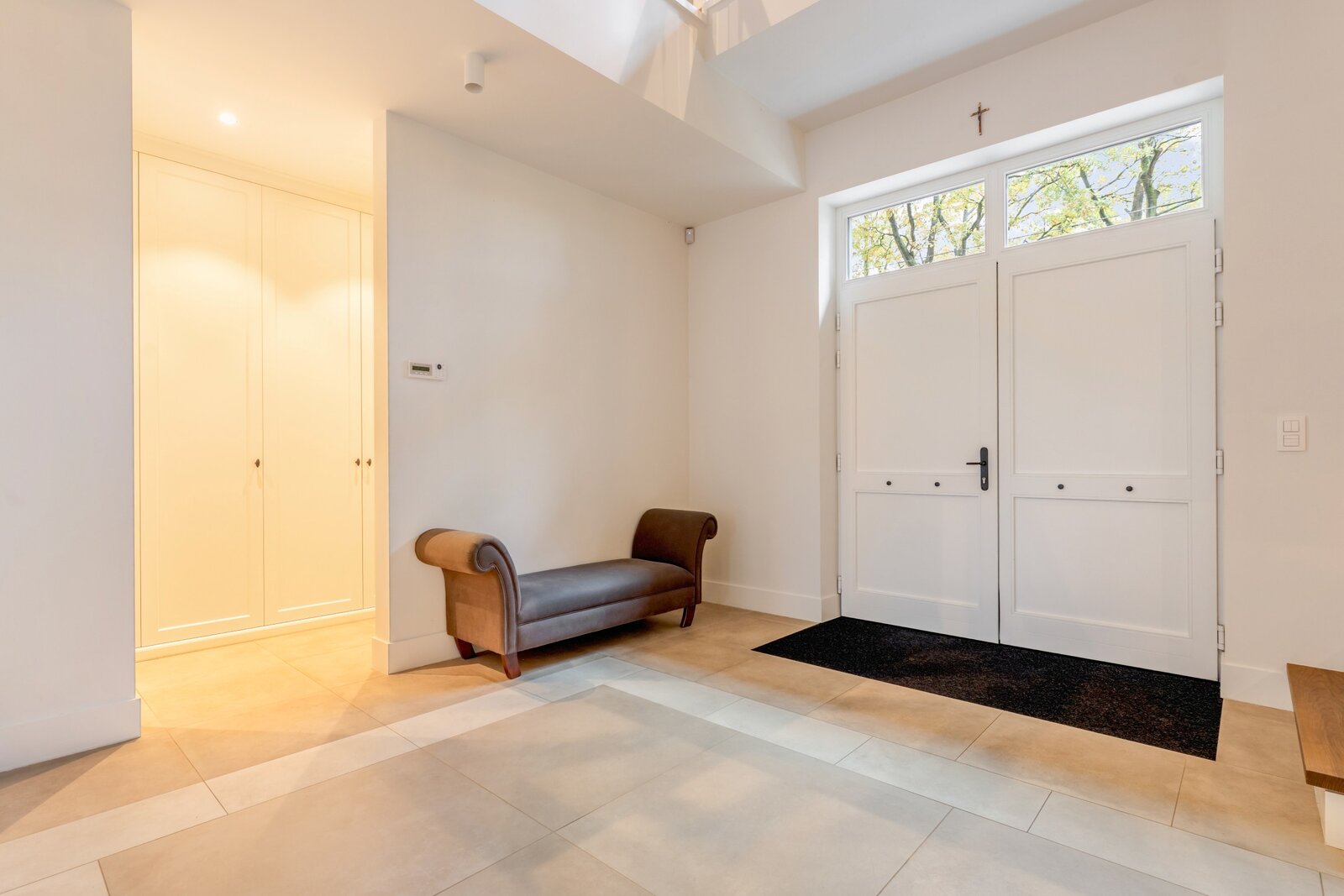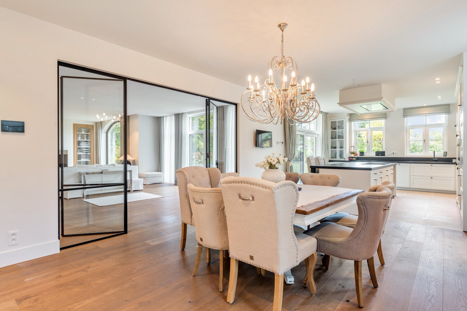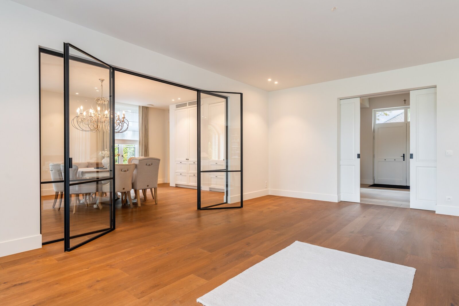Le hall d'entrée spacieux et lumineux avec un escalier en bois massif et plusieurs armoires sur mesure nous mène à un vaste espace de vie et de salle à manger. Cette zone peut être fermée avec une double porte coulissante en bois laqué et une structure en verre et acier qui divise cet espace magnifique de manière idéale. Toutes ces pièces de vie baignent dans la lumière grâce aux nombreuses fenêtres et offrent une vue dégagée sur le magnifique environnement verdoyant.