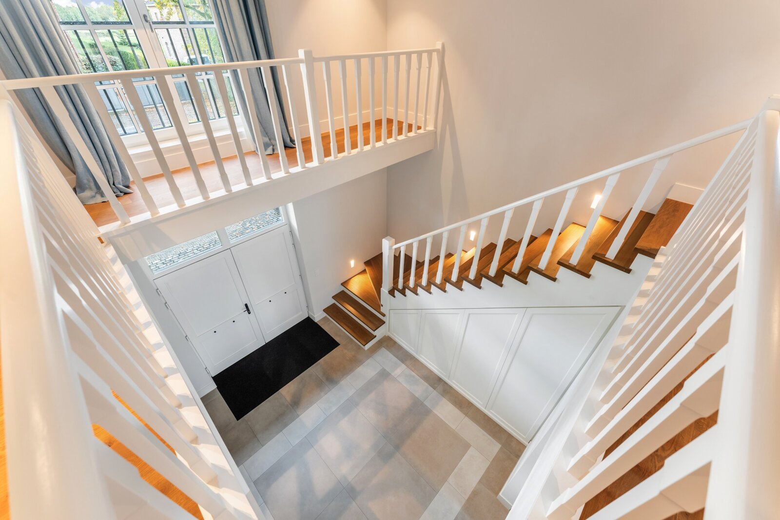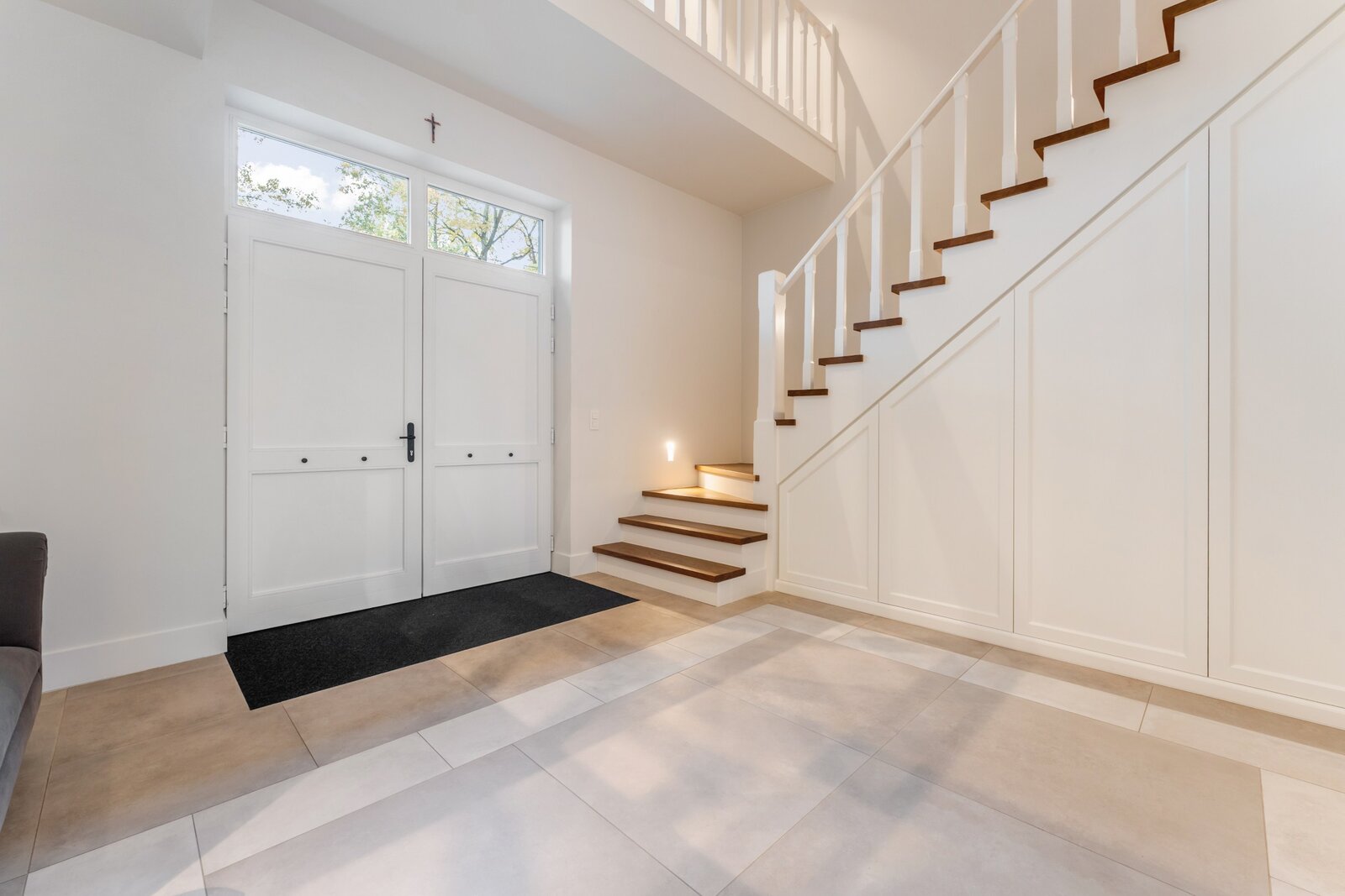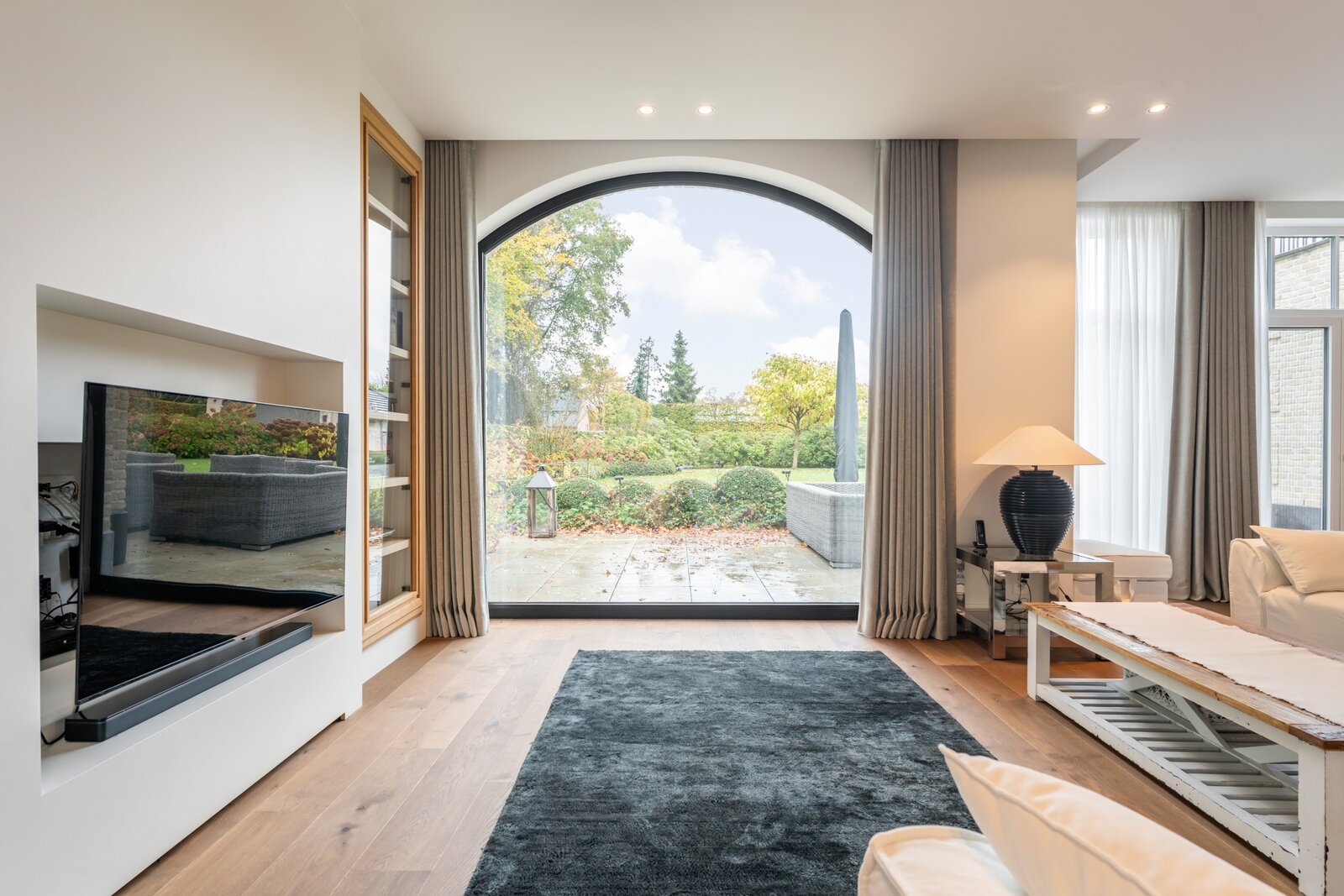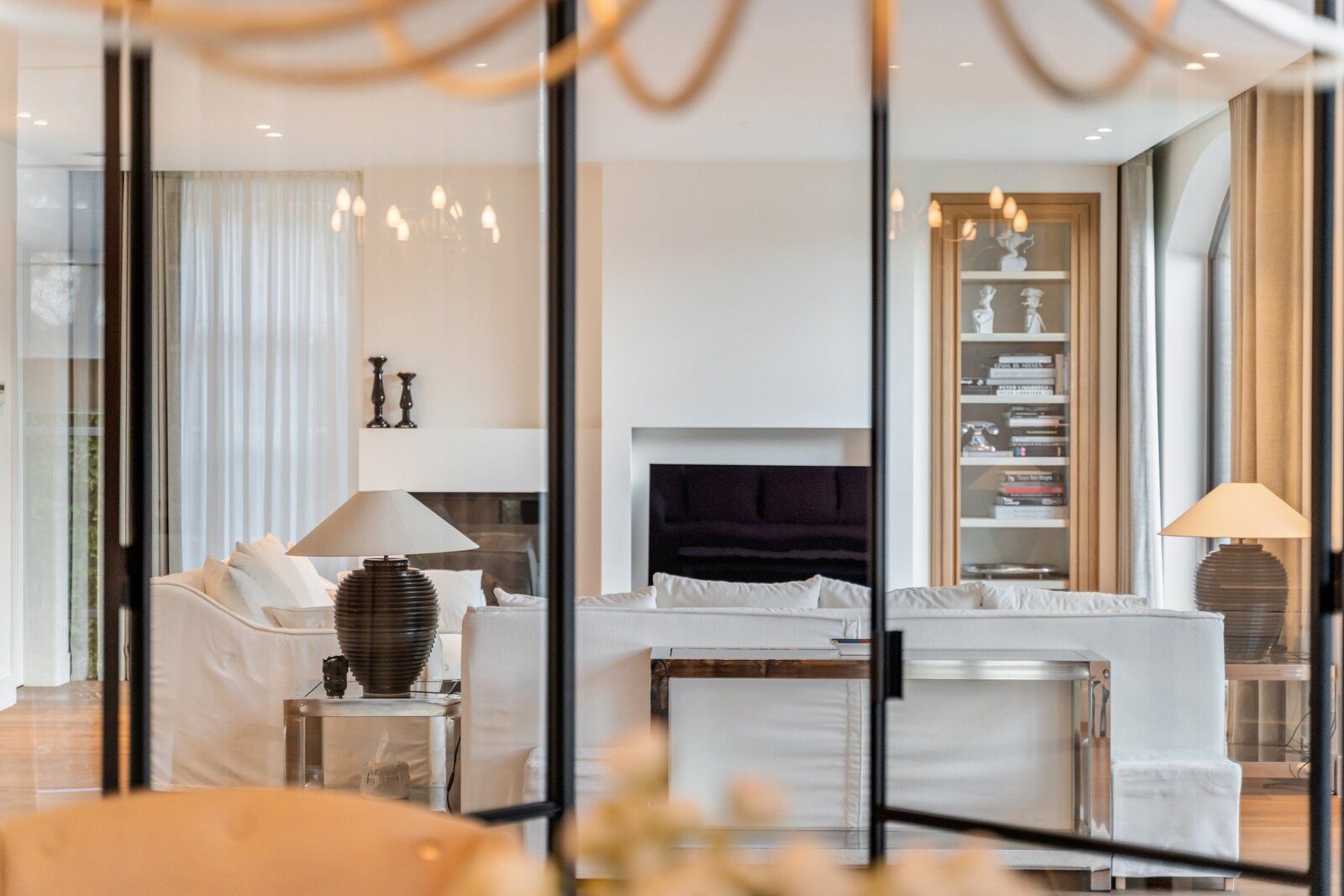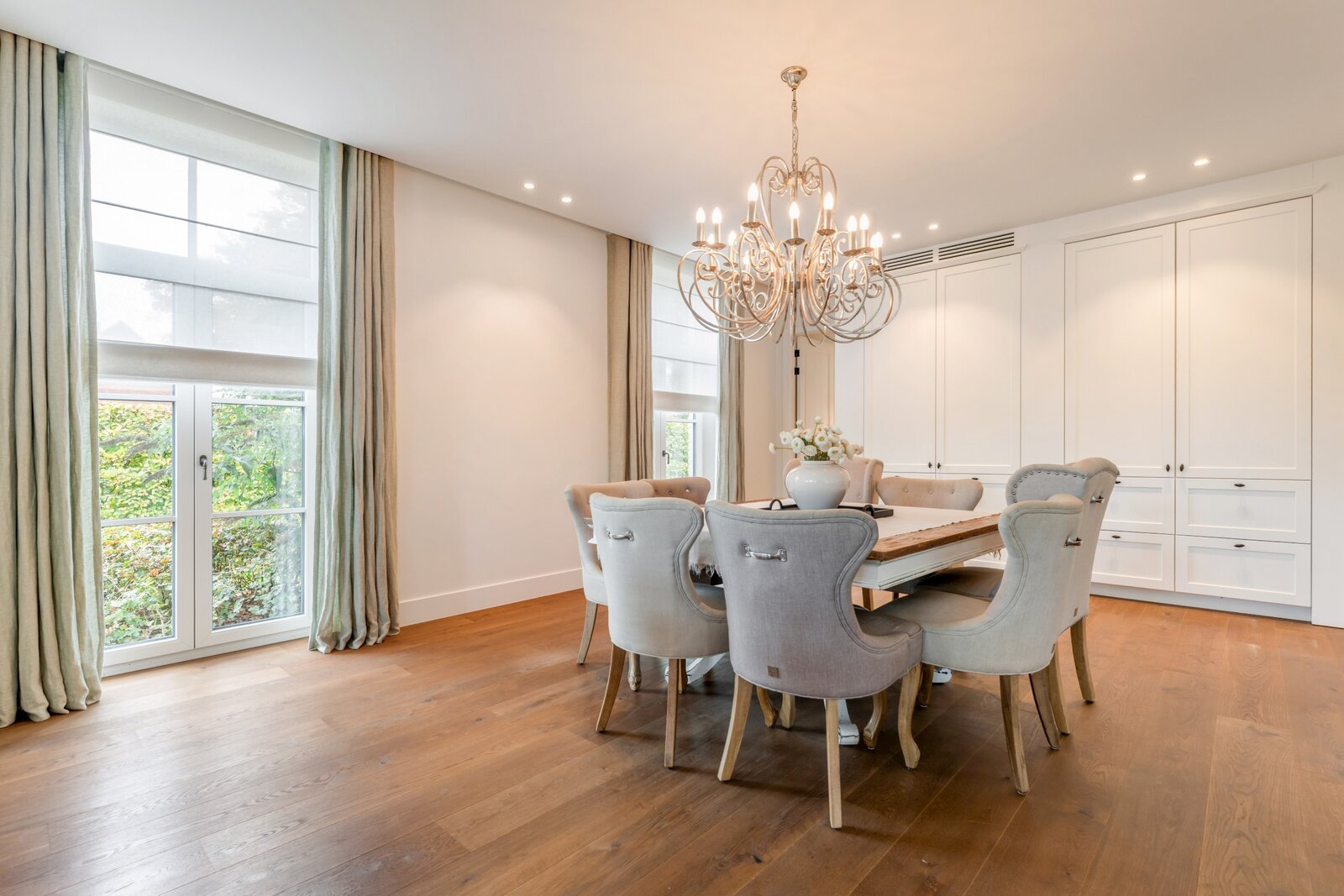 Le hall d'entrée spacieux et lumineux avec un escalier en bois massif et plusieurs armoires sur mesure nous mène à un vaste espace de vie et de salle à manger. Cette zone peut être fermée avec une double porte coulissante en bois laqué et une structure en verre et acier qui divise cet espace magnifique de manière idéale. Toutes ces pièces de vie baignent dans la lumière grâce aux nombreuses fenêtres et offrent une vue dégagée sur le magnifique environnement verdoyant.