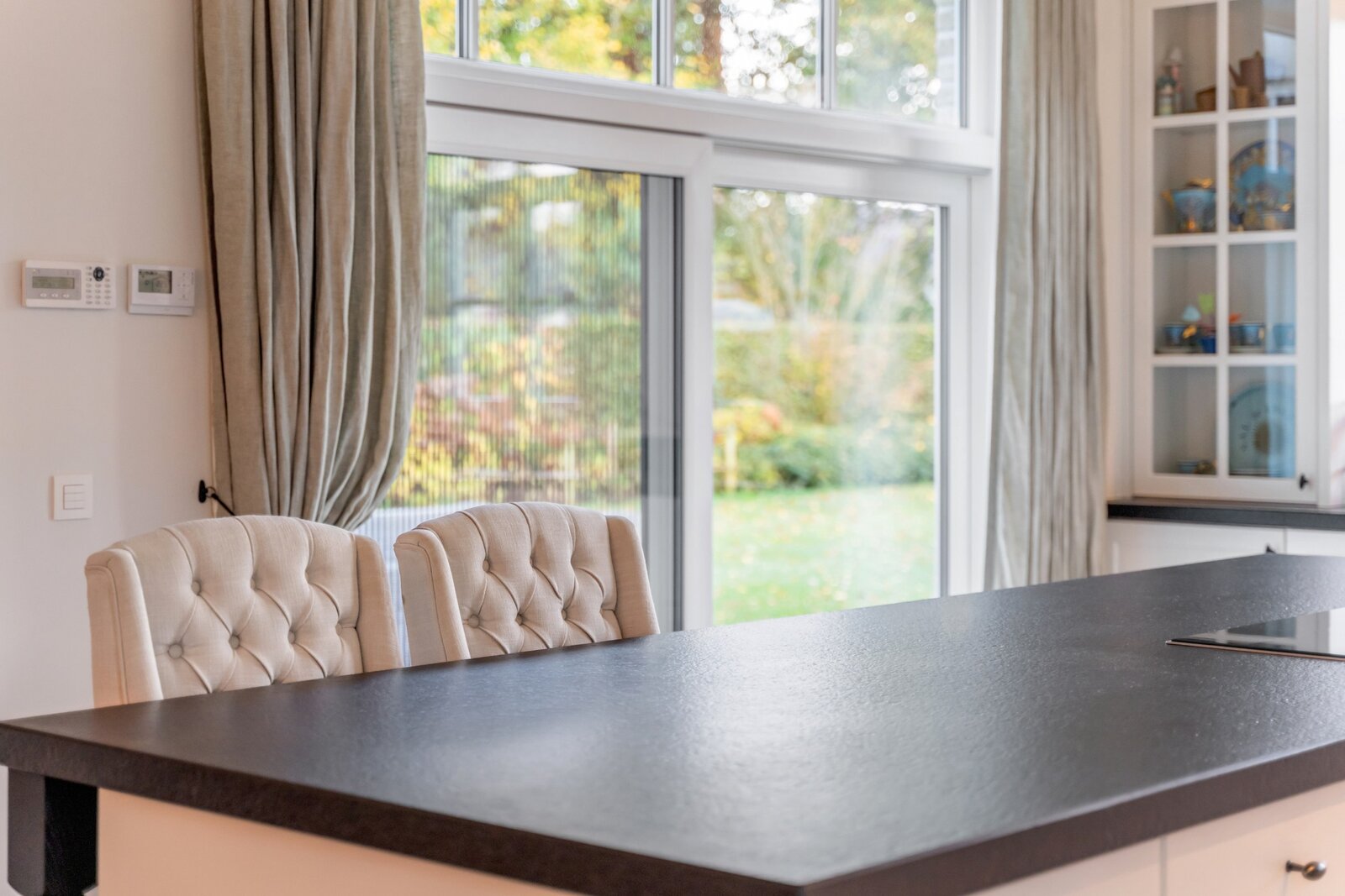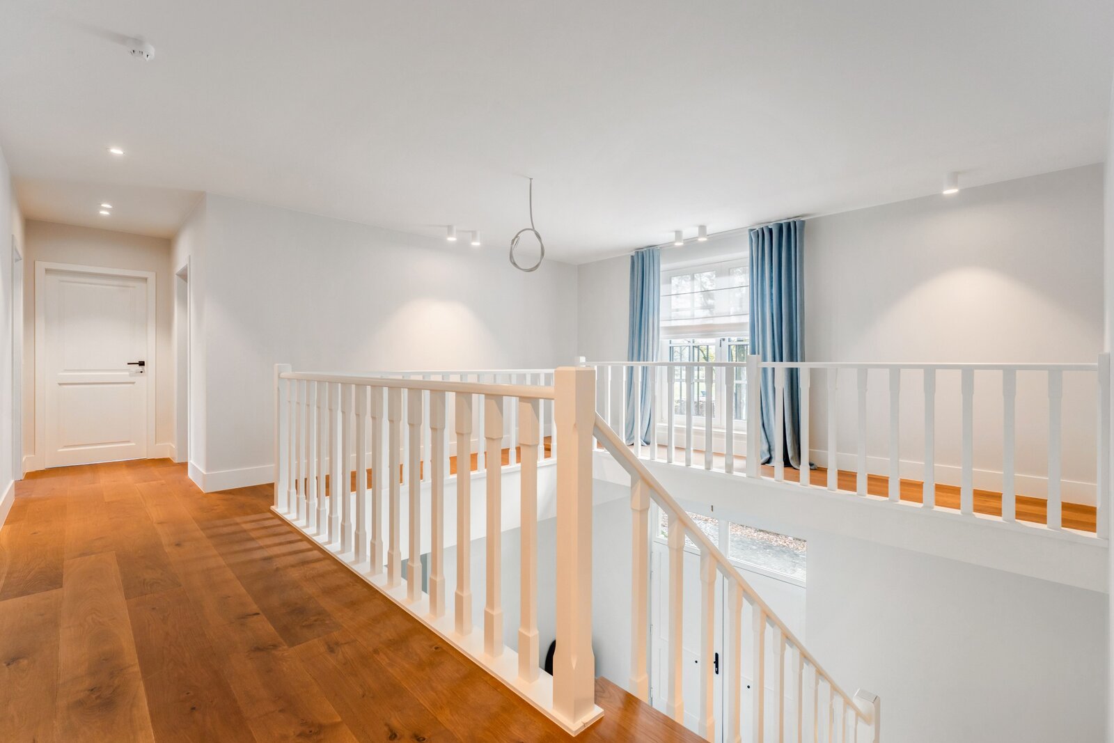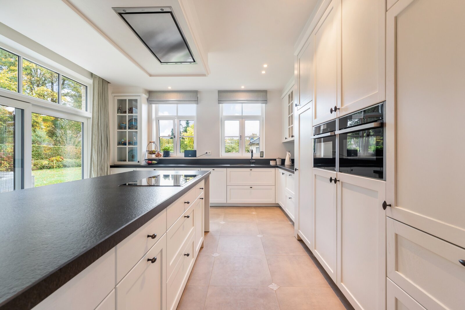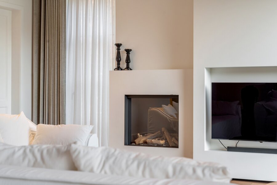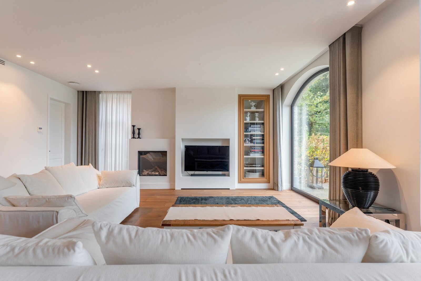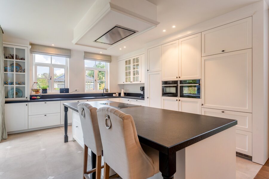 Les meubles sur mesure dans toute la maison ont la même qualité et esthétique, ce qui en fait le fil rouge de la maison. Cela crée un ensemble serein et élégant. La partie vie est dotée d'un beau parquet en chêne et d'un foyer au gaz central.