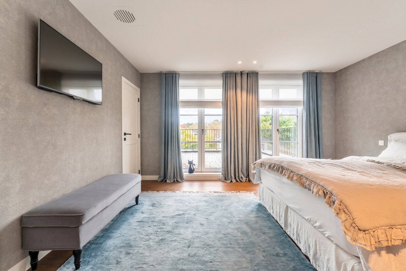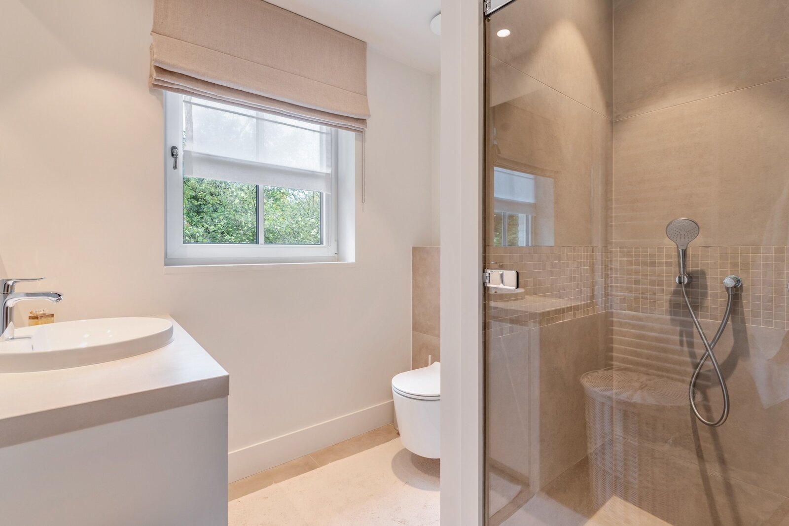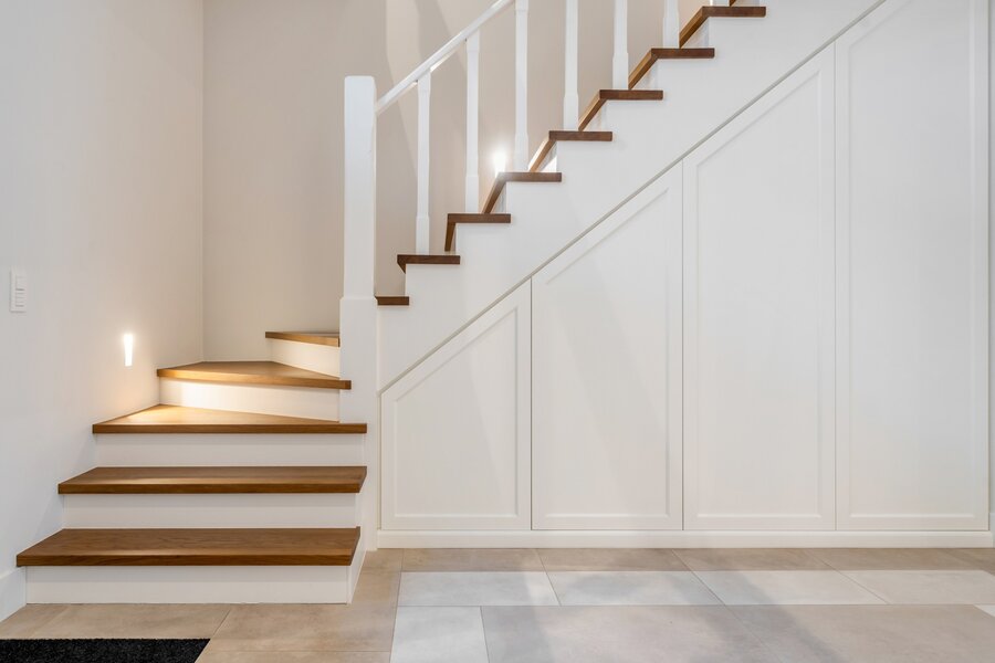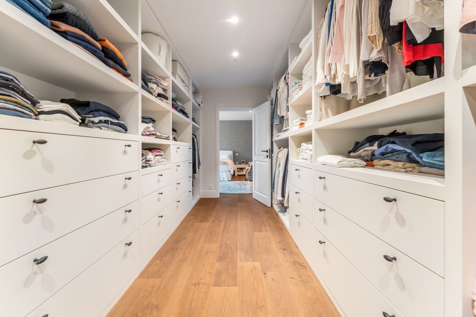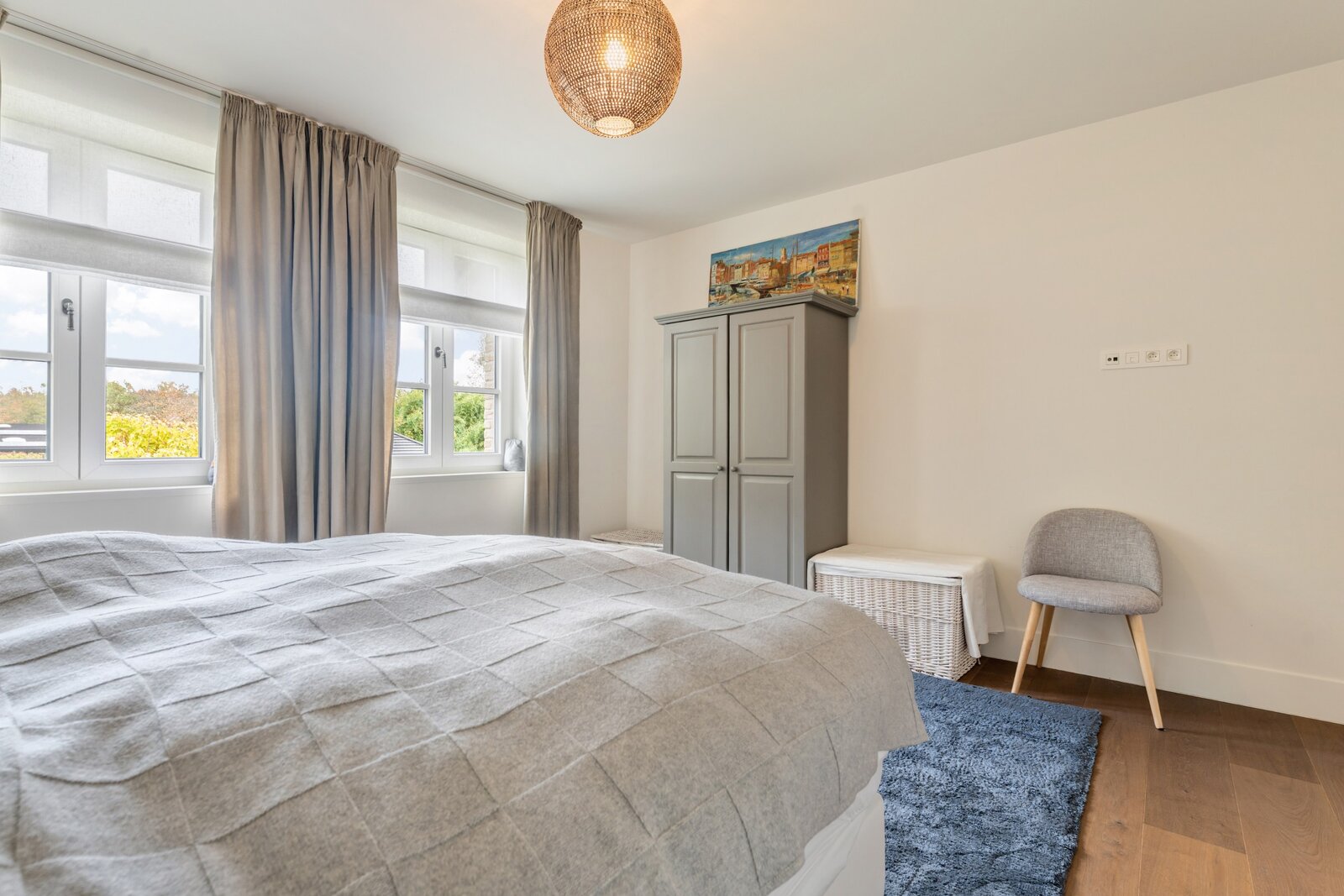 Les meubles sur mesure dans toute la maison ont la même qualité et esthétique, ce qui en fait le fil rouge de la maison. Cela crée un ensemble serein et élégant. La partie vie est dotée d'un beau parquet en chêne et d'un foyer au gaz central.
