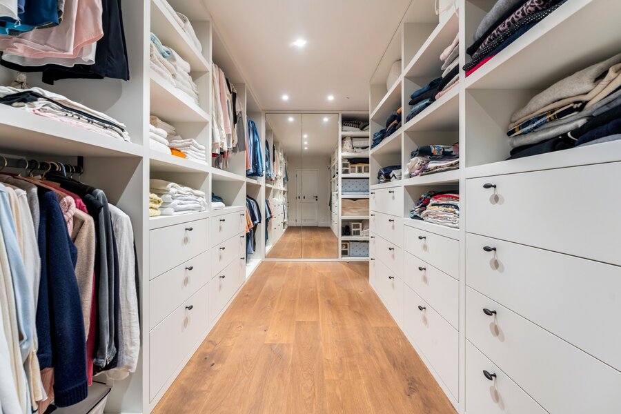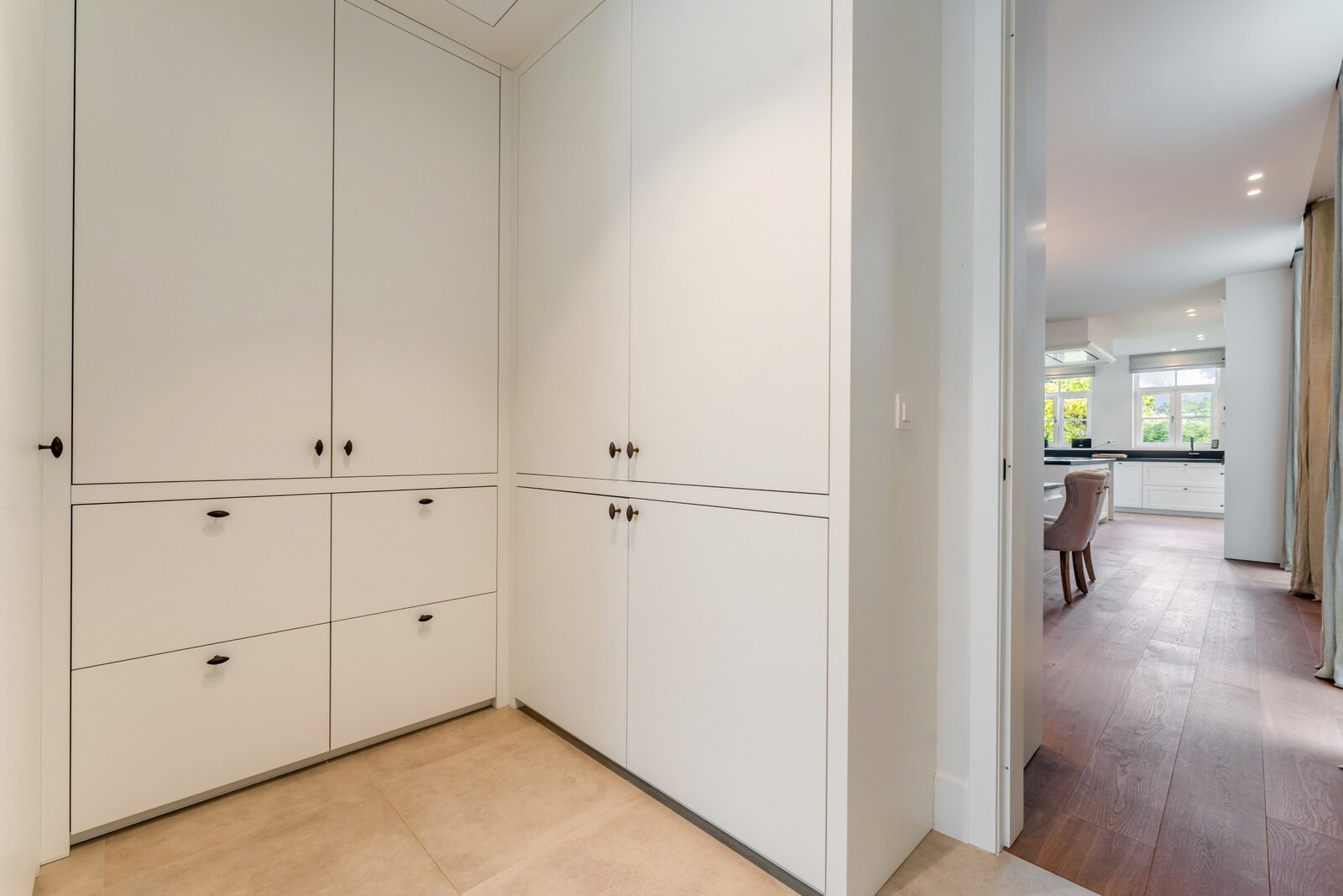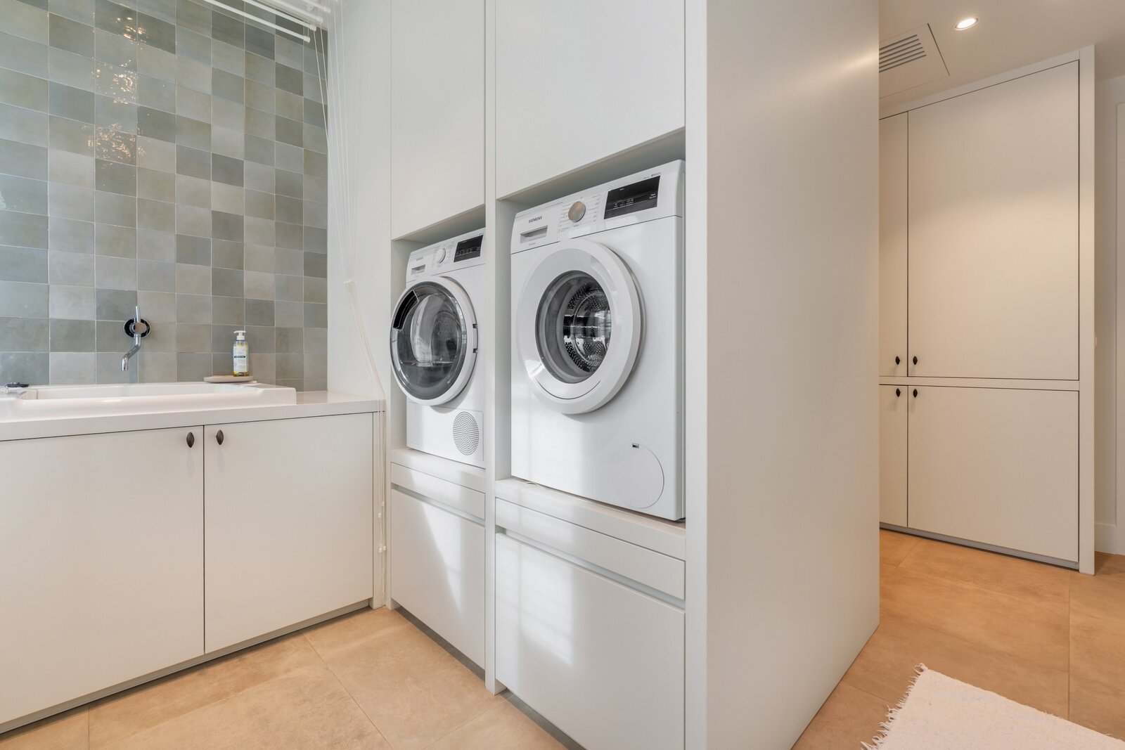 Derrière l'armoire sur mesure, il y a un débarras et une buanderie de qualité équivalente.