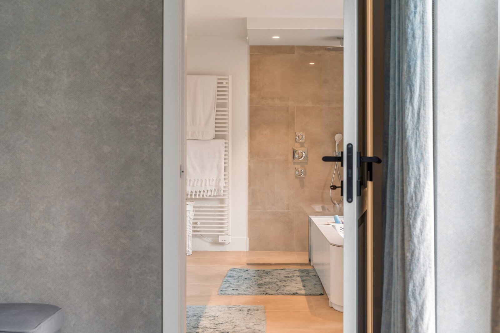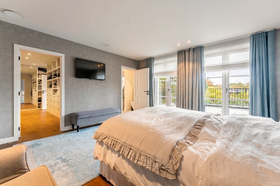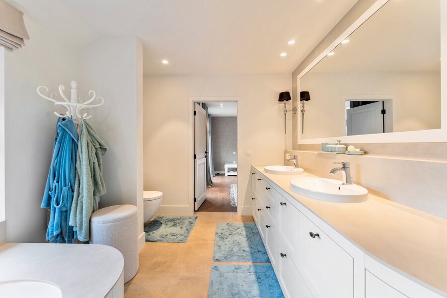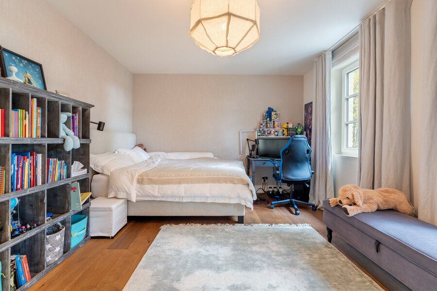 Une fois à l'étage par l'impressionnant escalier/hall, il y a 4 chambres spacieuses dont la chambre principale avec dressing sur mesure et salle de bains extrêmement confortable. Chaque chambre est équipée de sa propre salle de bains. Le grenier spacieux, accessible par un escalier escamotable, offre un espace de rangement supplémentaire.