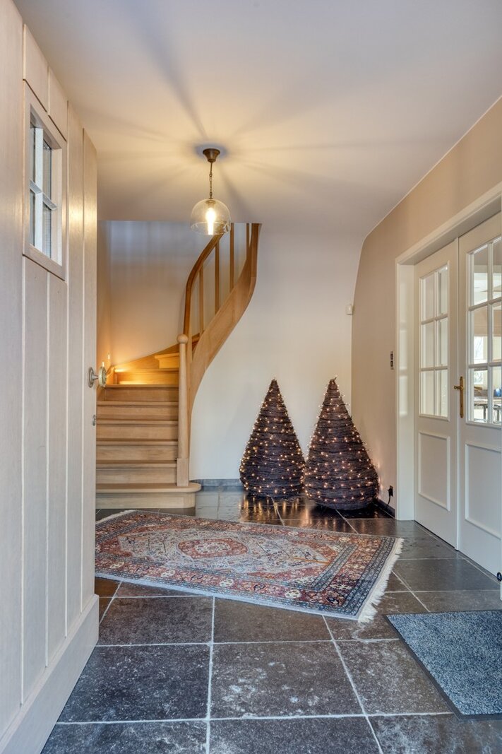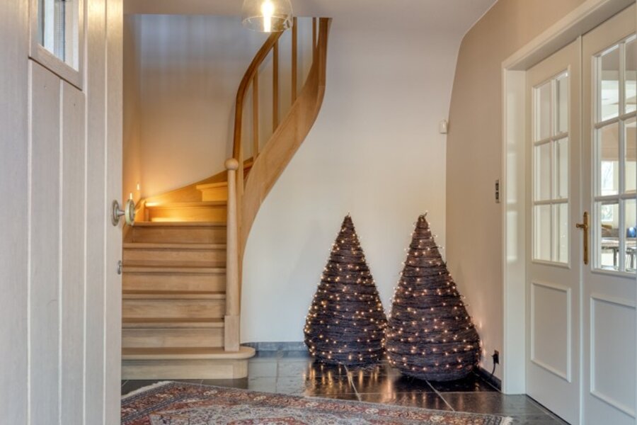 De woning zelf betreed je via het automatische poortje (te bedienen via de smartphone) vooraan, kom je binnen in de ruime hal met royale trap naar de bovenverdieping.