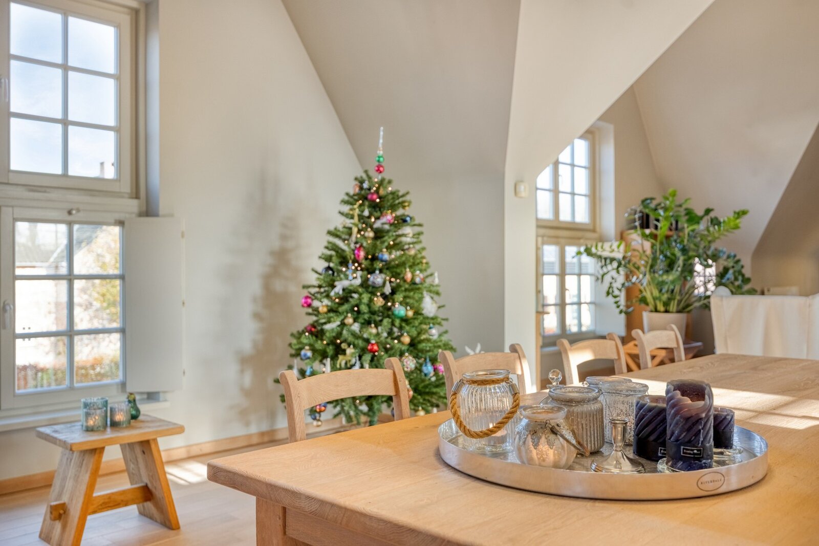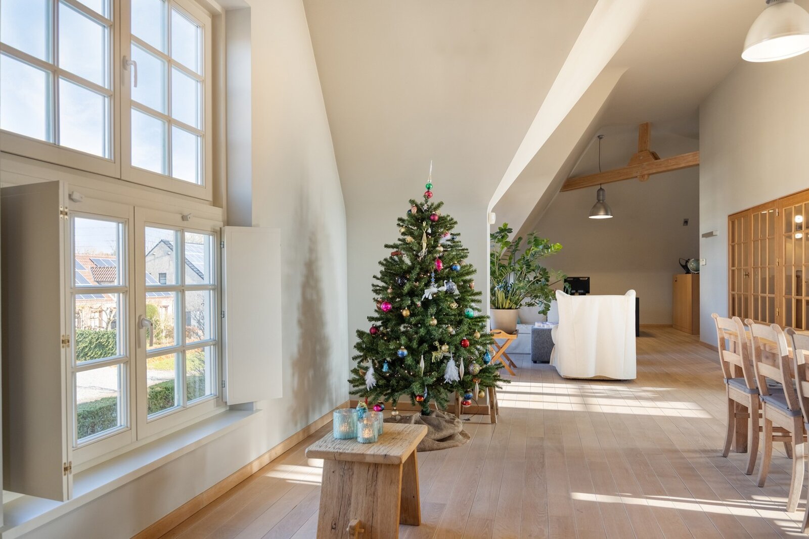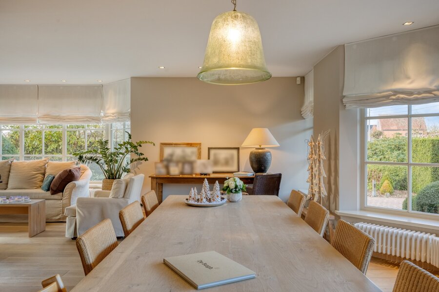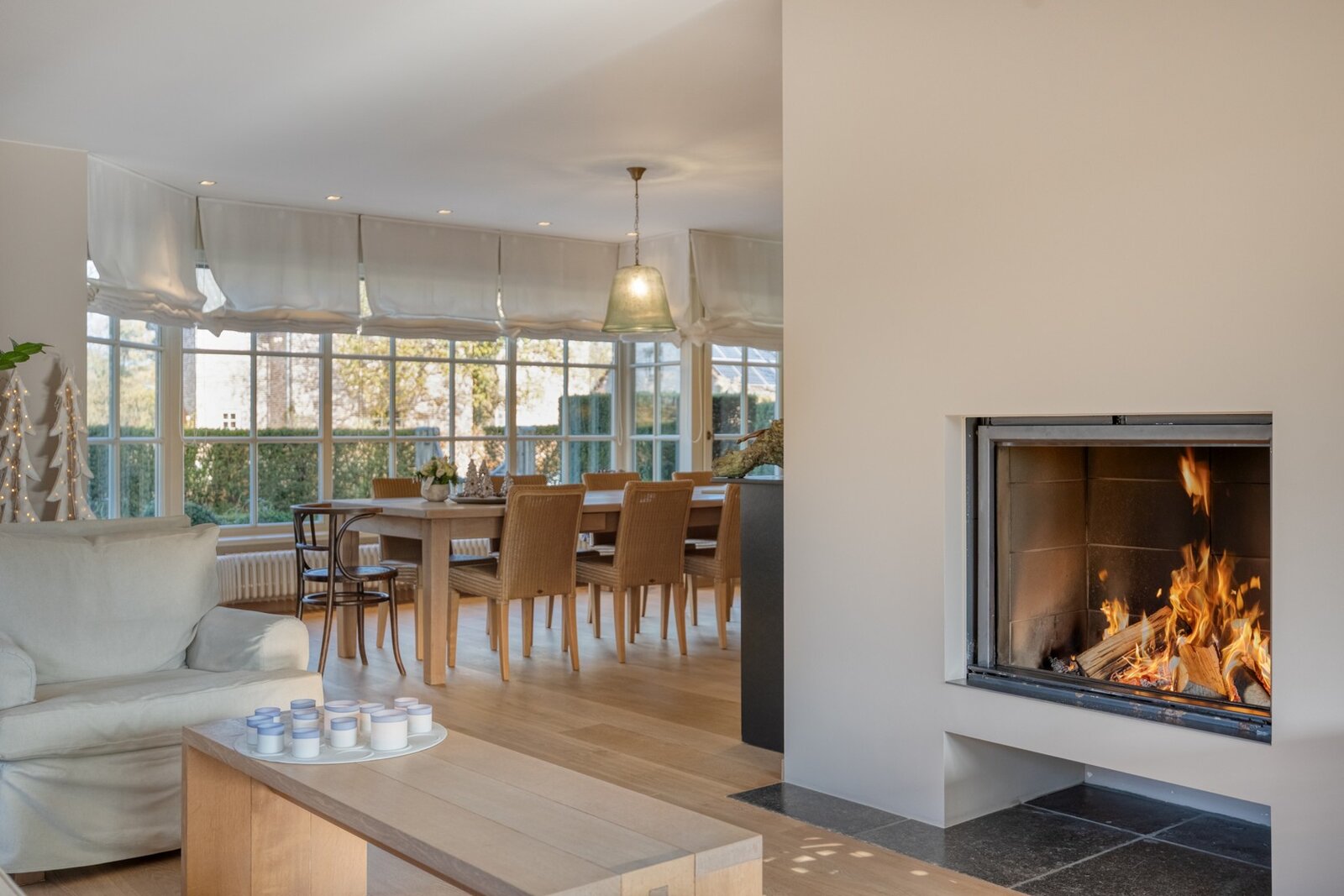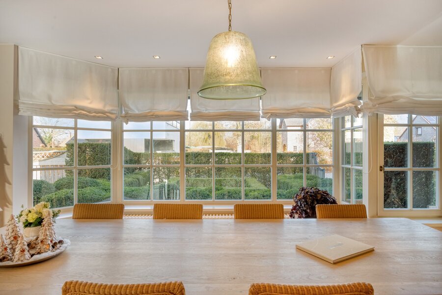 Aansluitend de leefruimte, met prachtige houten ramen en open zicht over de tuin en het overdekte terras.