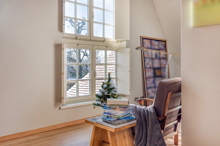 De bovenverdieping is een waar paradijs, helemaal in stijl van Bart Lens met grote ramen, houten (Lens)luikjes om te verduisteren, mooi parket.