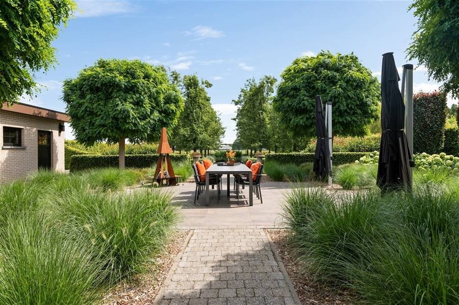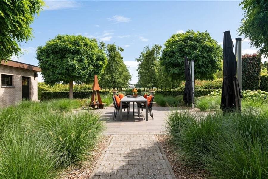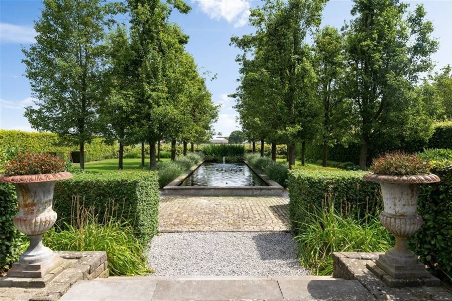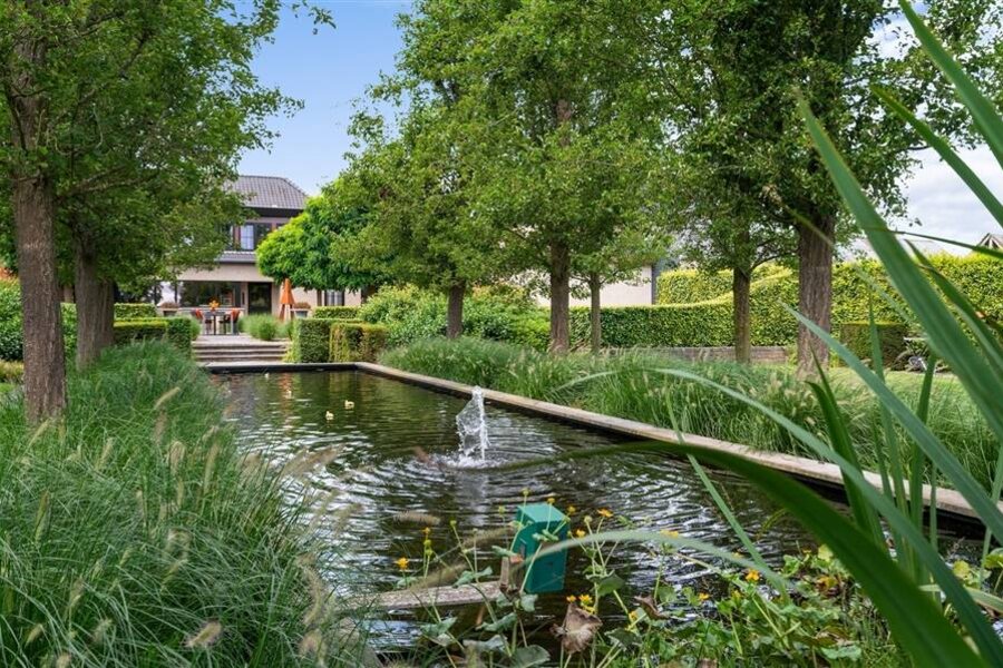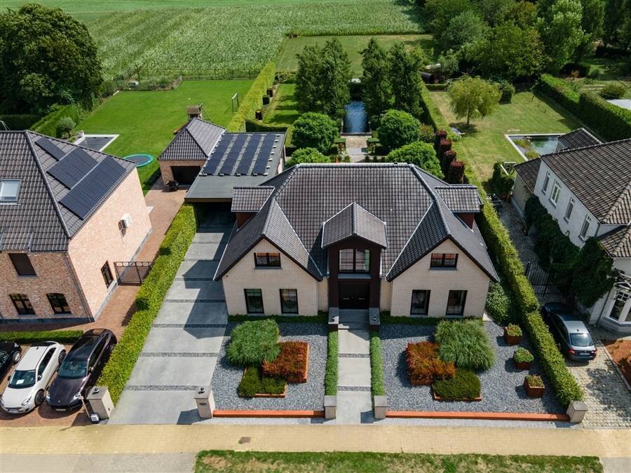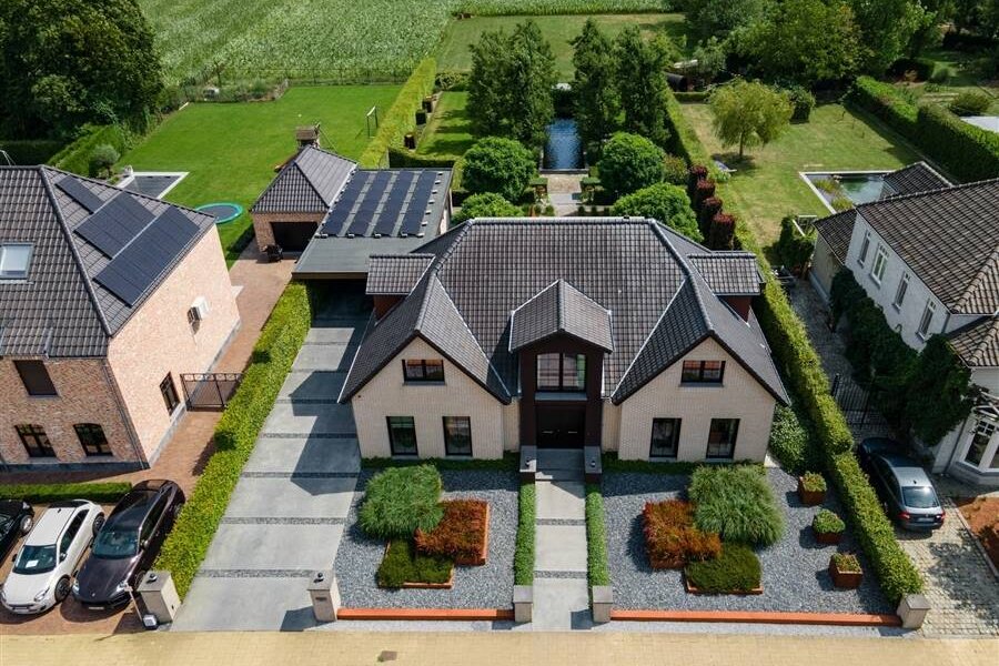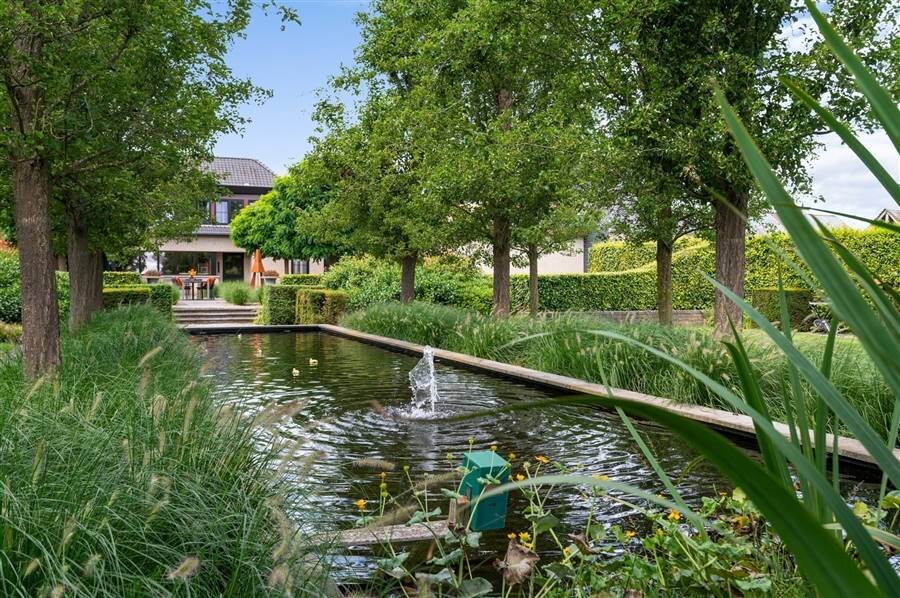 De buitenruimte is minstens even indrukwekkend: een fraai aangelegde tuin met zwemvijver, overdekt terras, dubbele garage met carport en een grote opbergruimte achteraan het perceel.