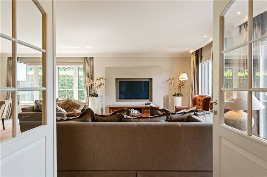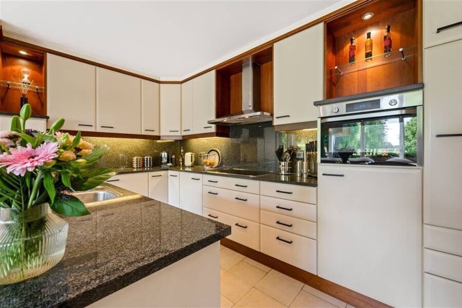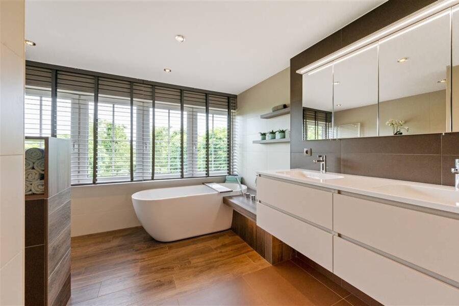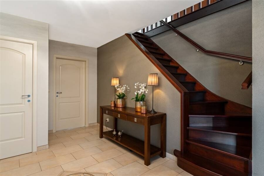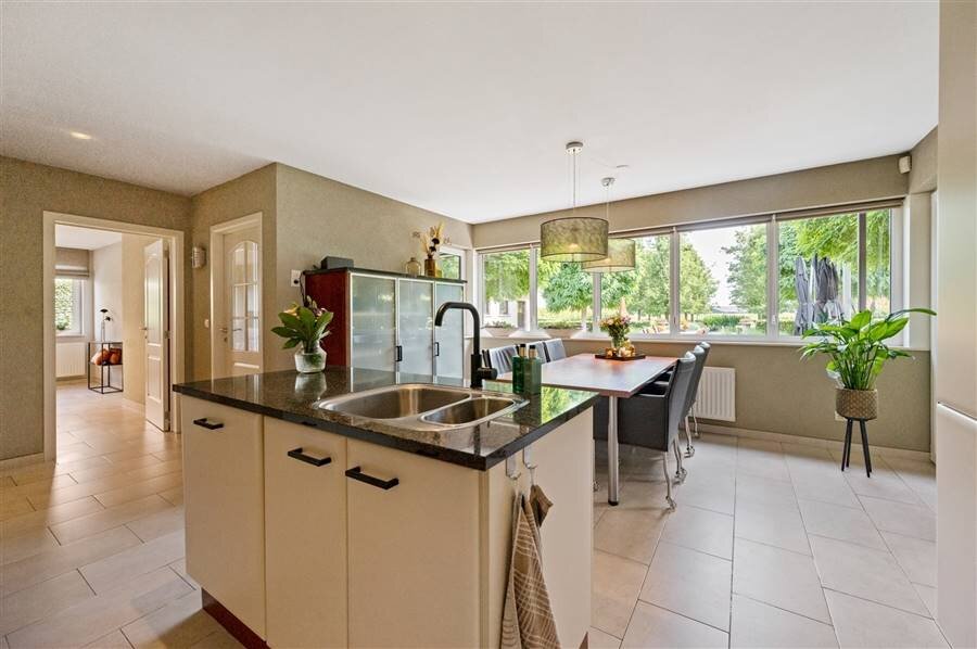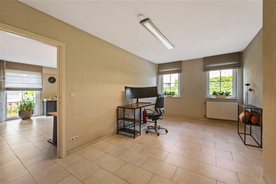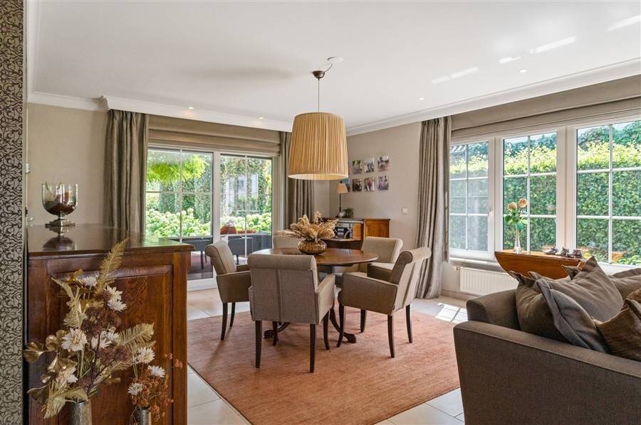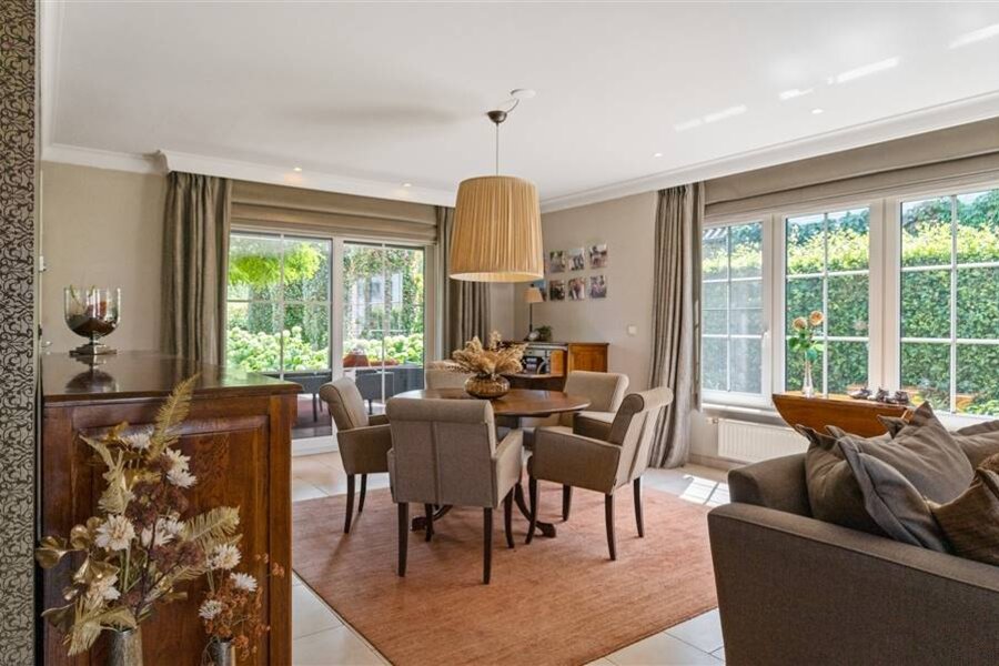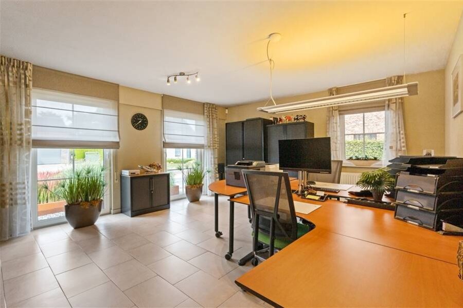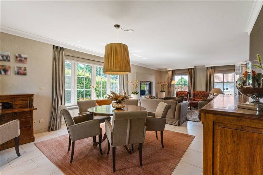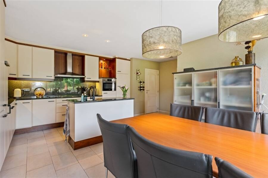 Deze exclusieve villa combineert ruimte, comfort en elegantie en is tot in de puntjes afgewerkt. De lichtrijke leefruimte biedt een prachtig uitzicht op de uitgestrekte tuin. De volledig uitgeruste keuken met spoeleiland, combi-oven, koelkast, kookvuur en vaatwasser sluit naadloos aan op de woonkamer. Op het gelijkvloers bevinden zich ook een gastentoilet, bureauruimte, polyvalente ruimte (berging, hobbykamer...), halletje achteraan met toilet en toegang tot de kelder.