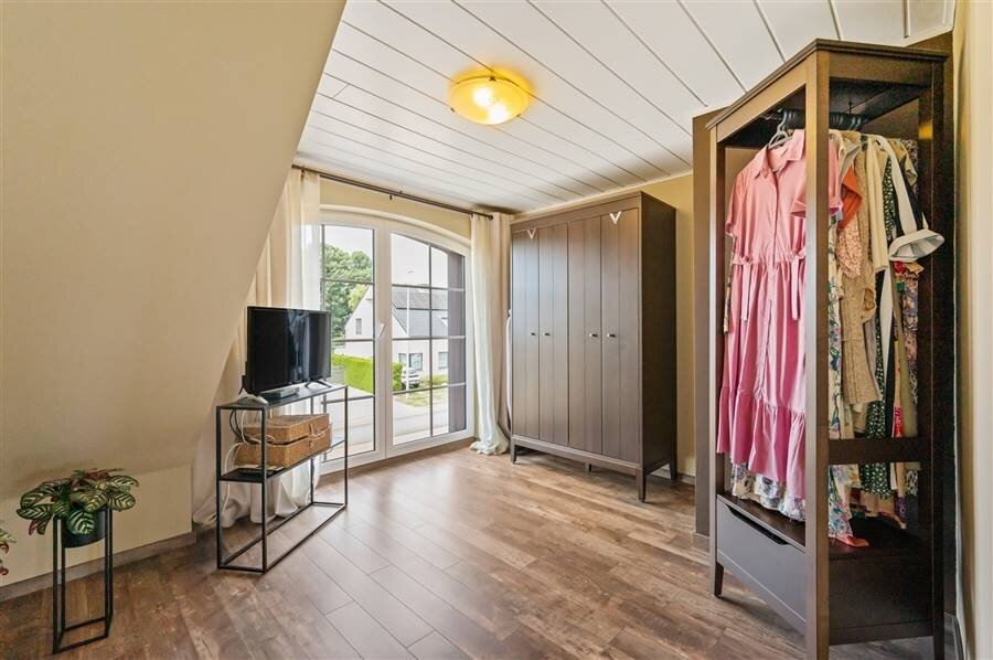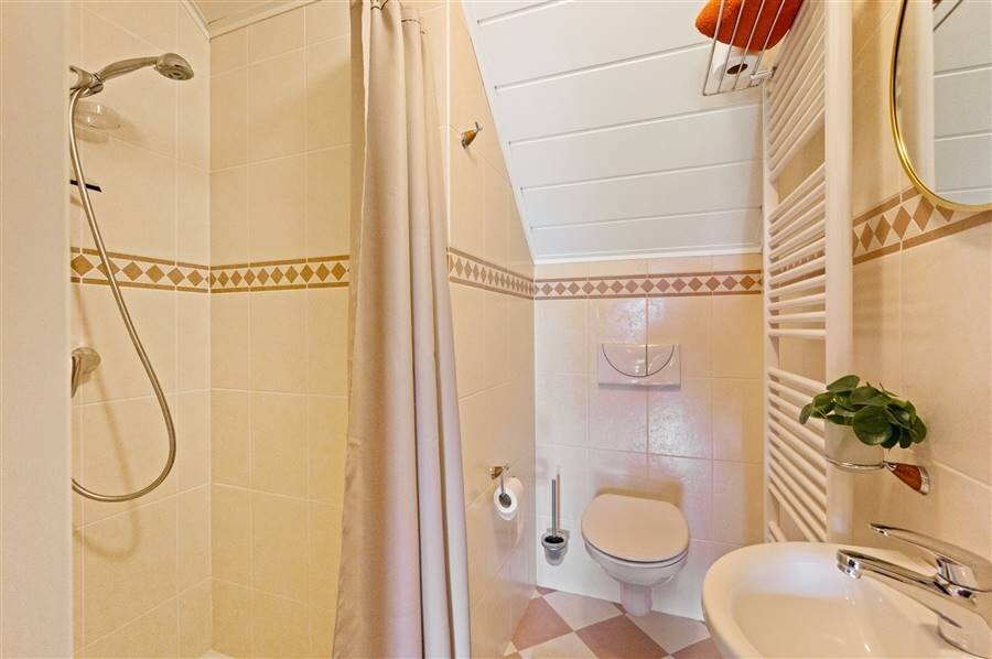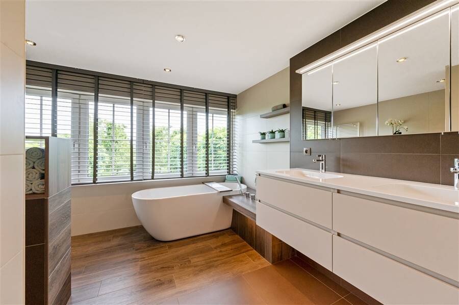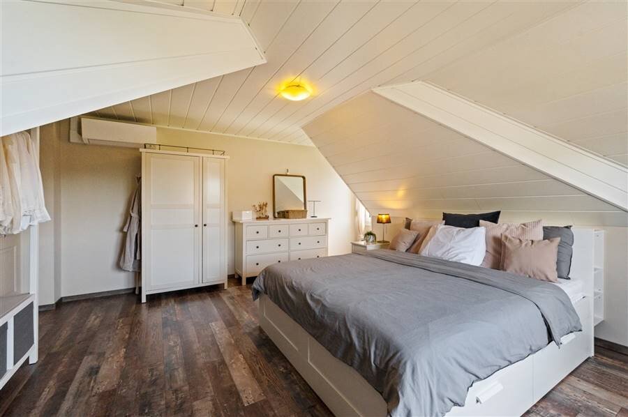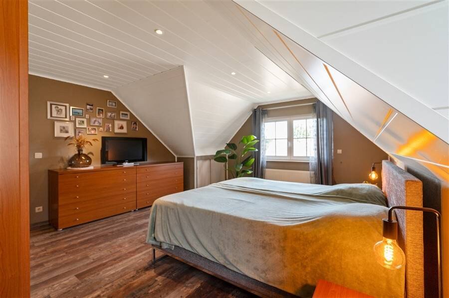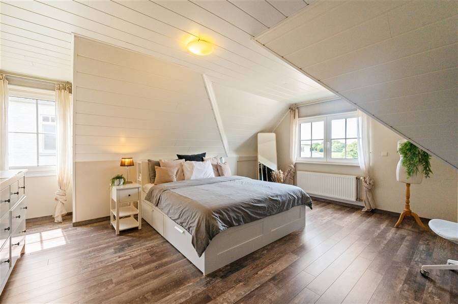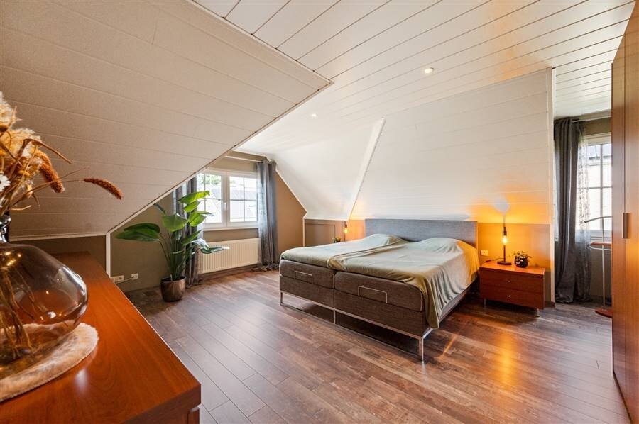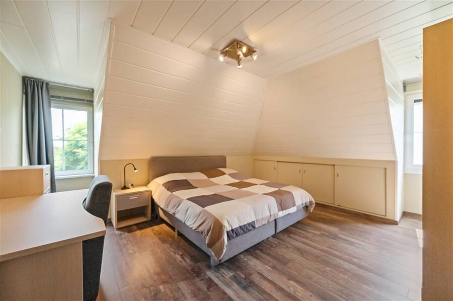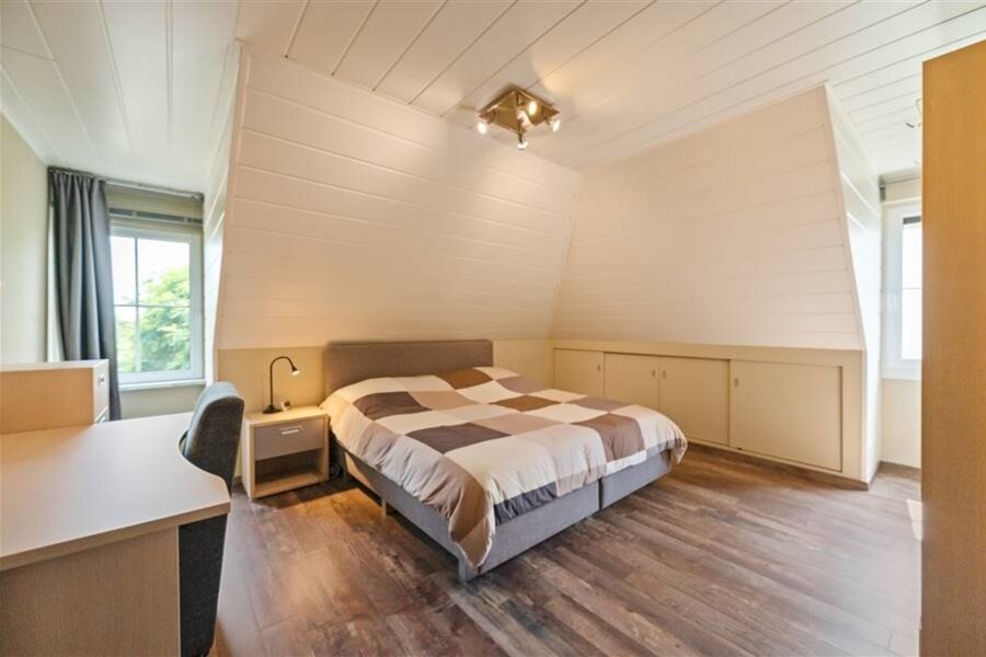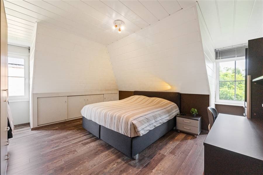 Op de eerste verdieping vind je vier ruime slaapkamers, een logeerkamer, een strijkkamer en twee badkamers. De eerste badkamer heeft een douche en toilet, de tweede biedt extra luxe met een inloopdouche, ligbad, dubbele wastafel en toilet. Verder is de zolder bereikbaar via een trapluik.